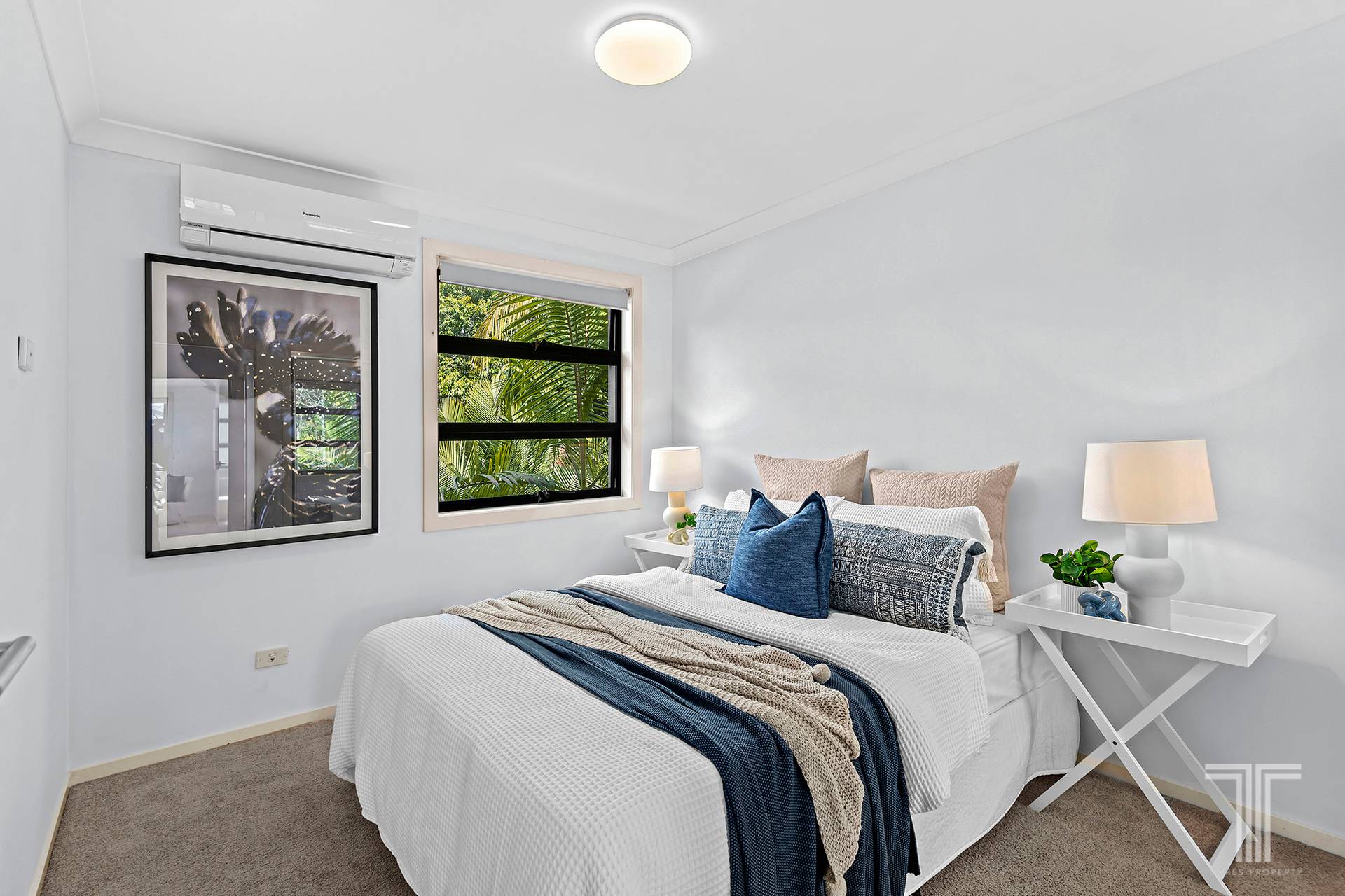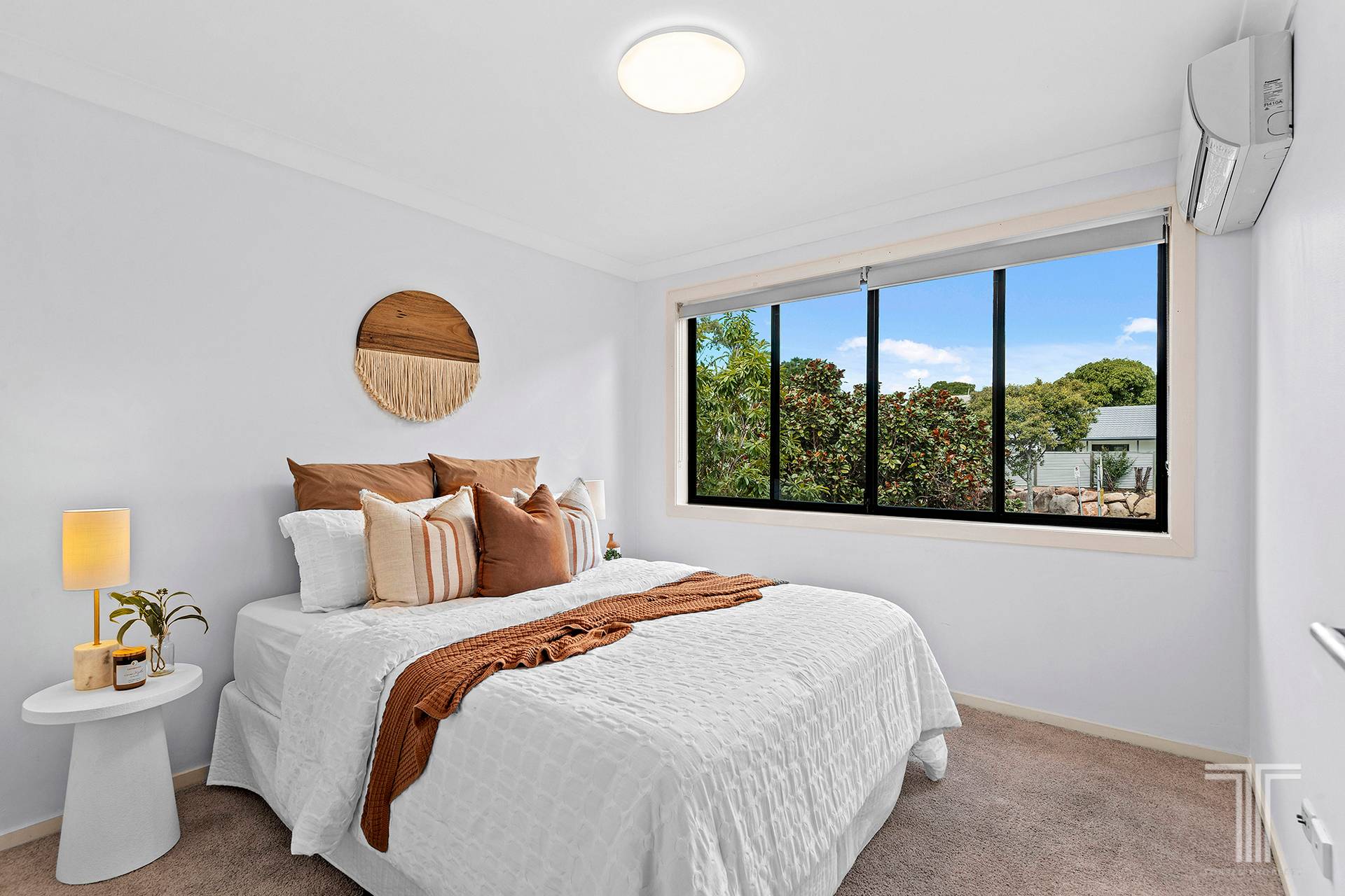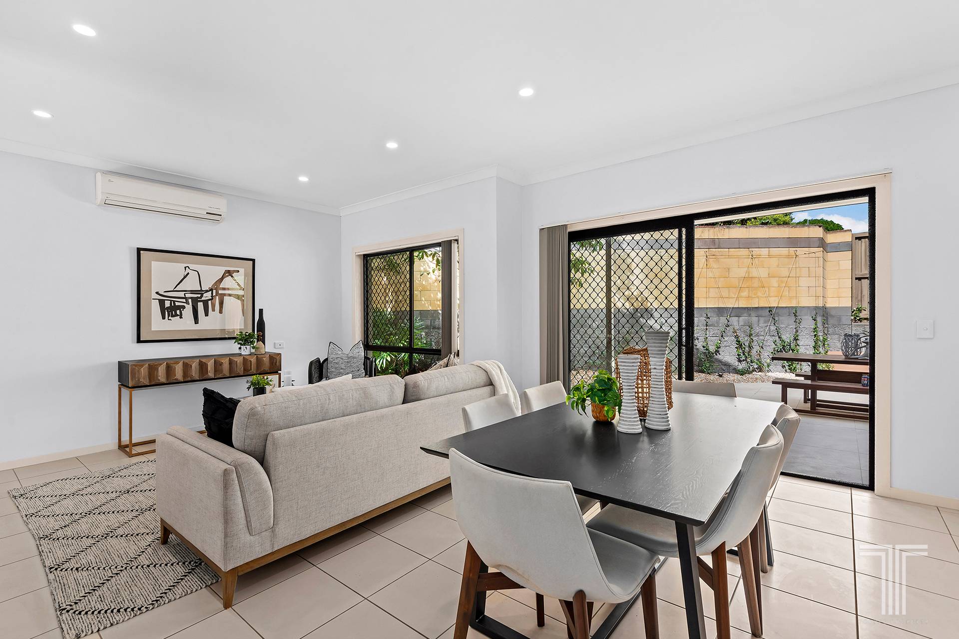Three air-conditioned bedrooms with built-in robes are upstairs, serviced by two bathrooms, including an ensuite. An additional powder room and a separate laundry are below, and the house is complete with a double garage featuring new epoxy floors.