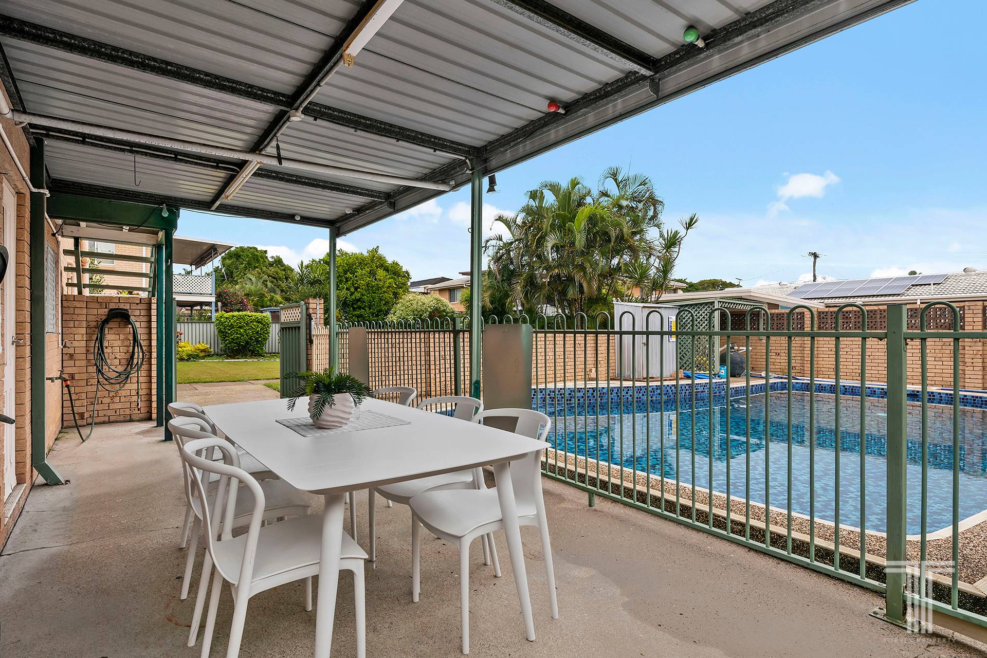 - Covered patio, flat backyard, swimming pool, kid's pool