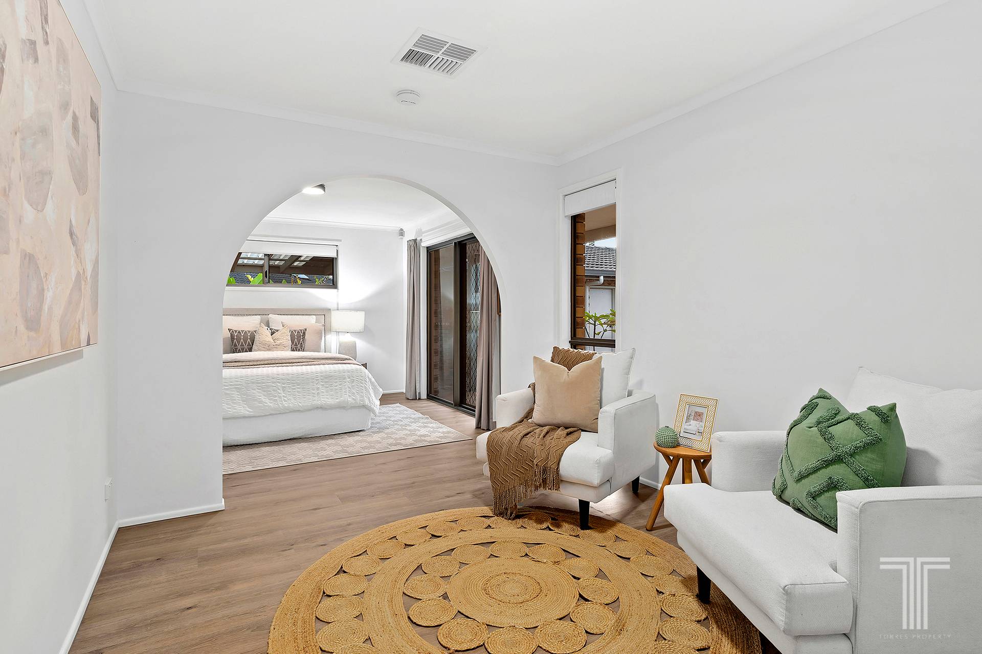 Three bedrooms are serviced by a new laundry and two new bathrooms with rainfall showers and stylish basins. The main bathroom includes a lavish bathtub, and the master suite reveals a walk-in robe, ensuite, and retreat, perfect for an office, lounge, or nursery.