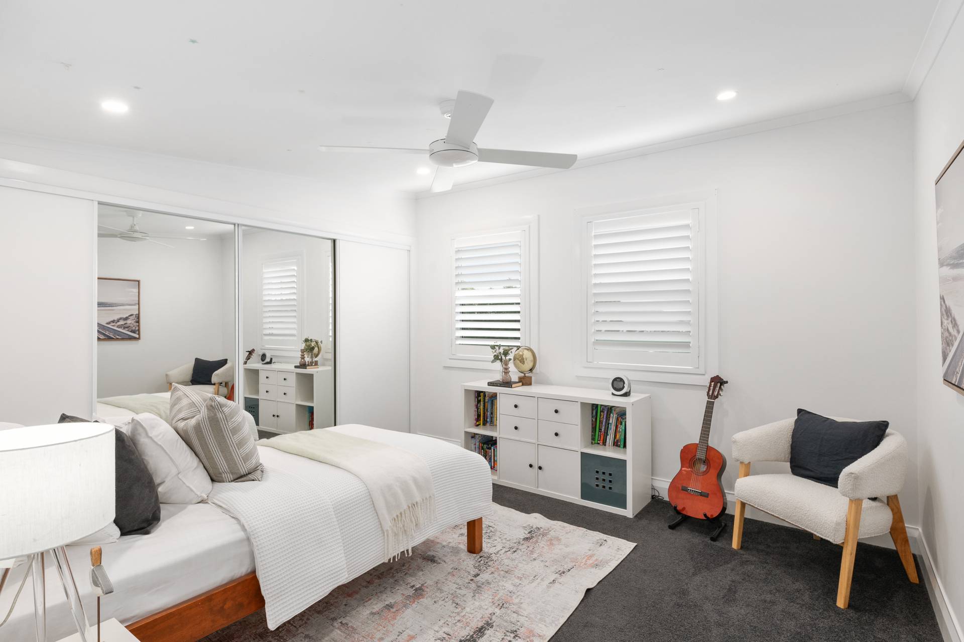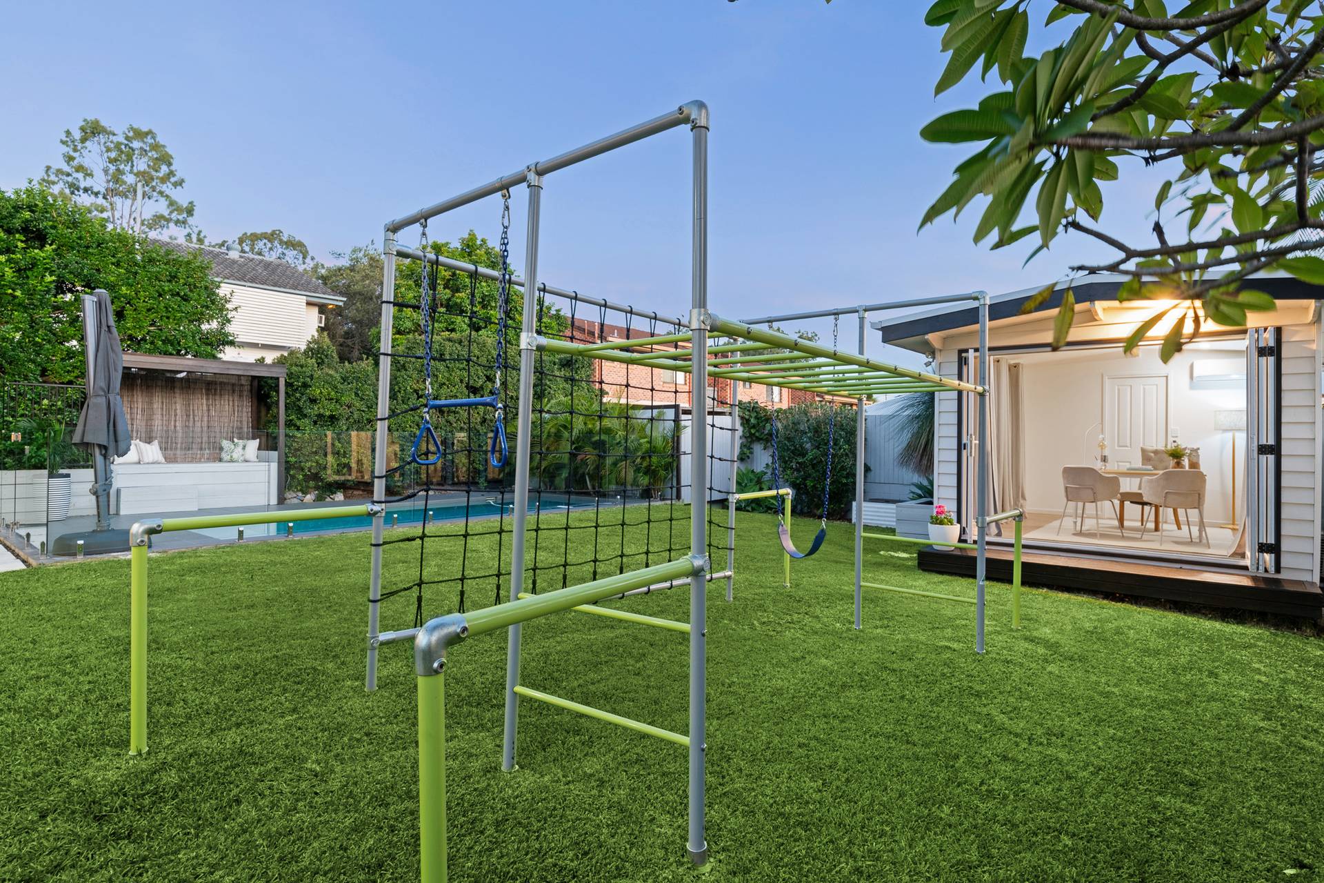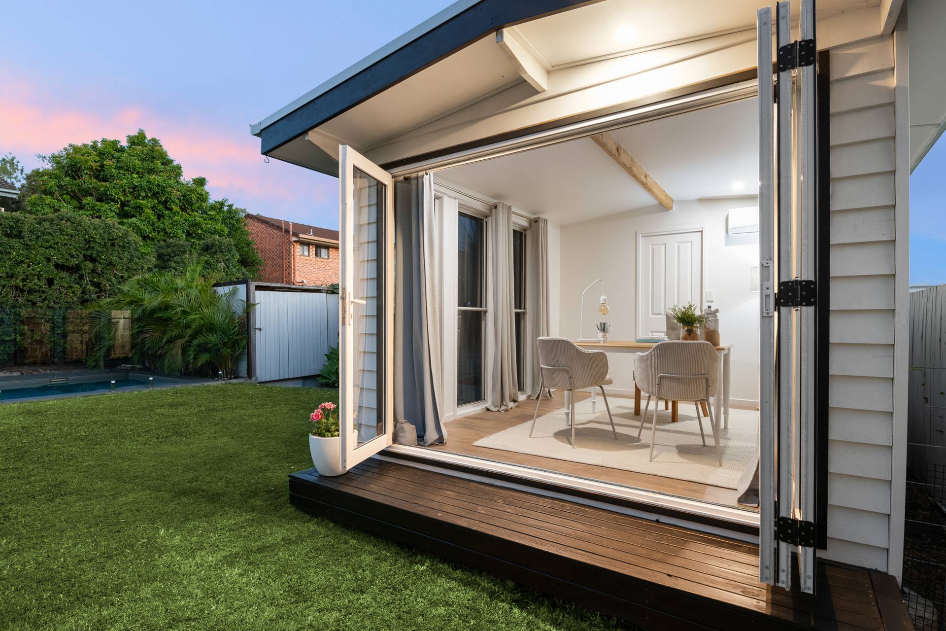 Alfresco dining, parties, and entertainment can be enjoyed outdoors, with a large terrace nestled by the flat backyard and heated swimming pool, which boasts a daybed for lounging in the sunshine. With a separate studio also featuring outside, buyers are offered a retreat for kids, hobbies, or working from home.