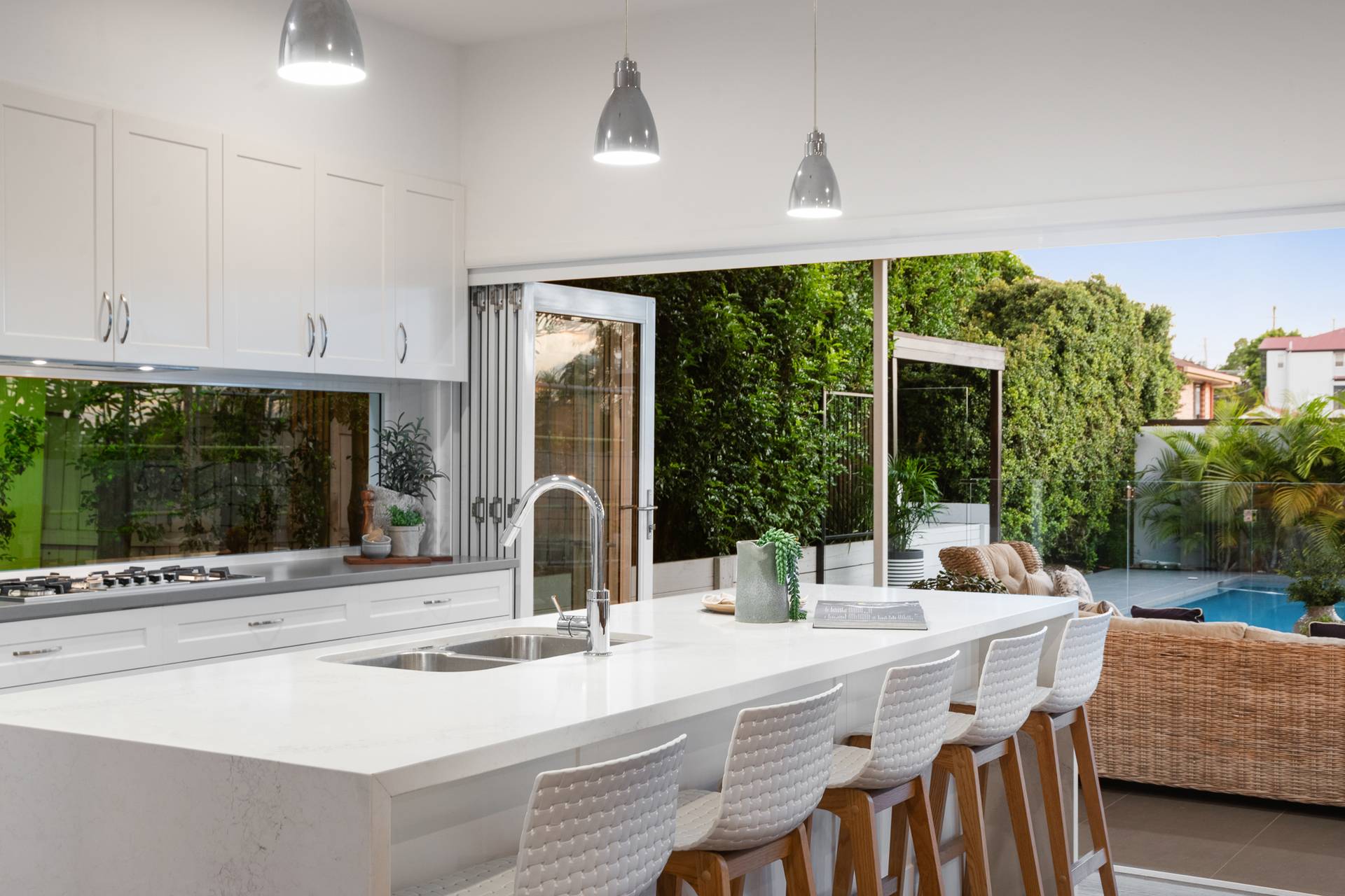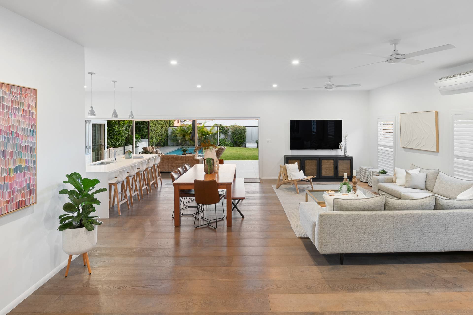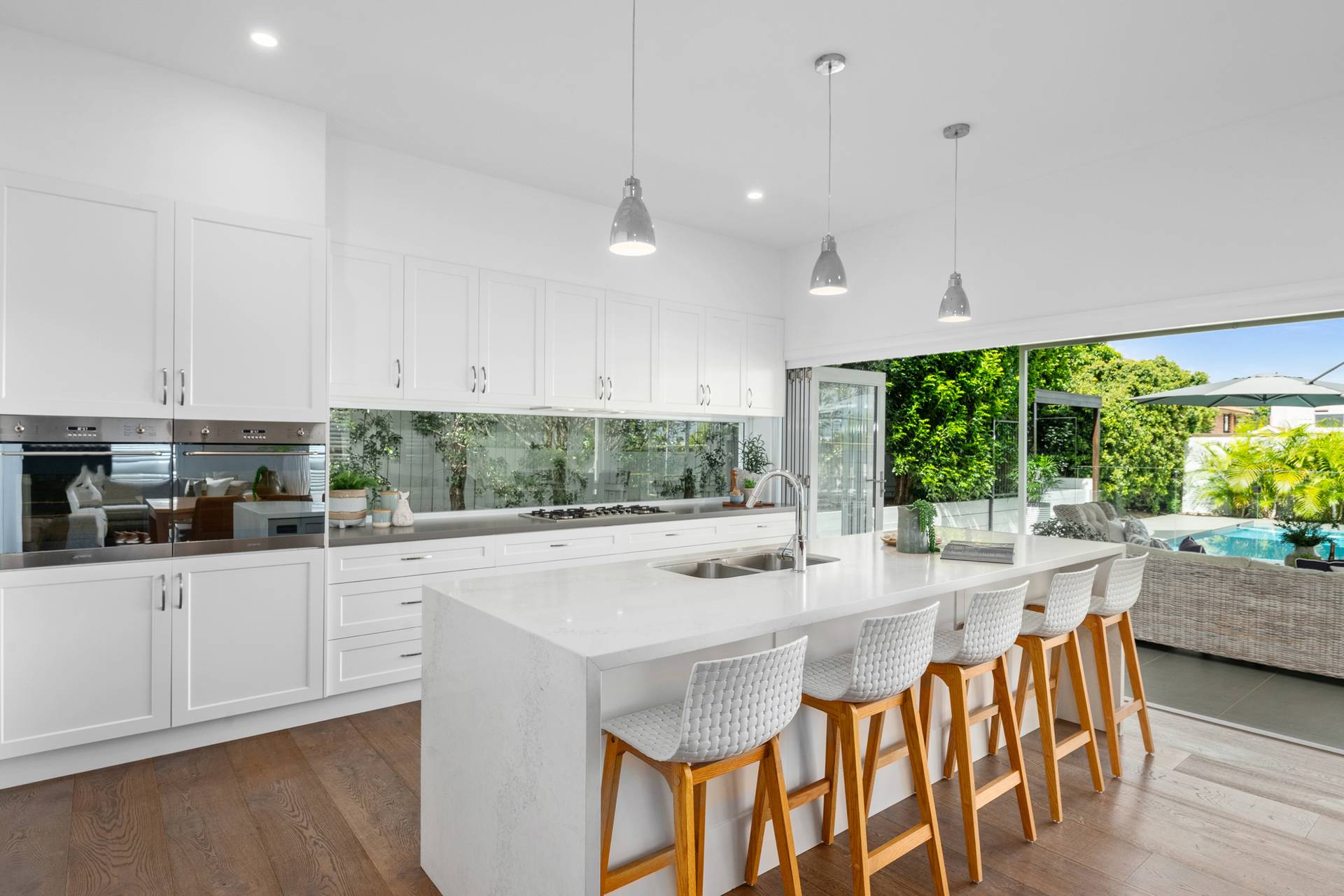 Indoor and outdoor living intertwine with bi-fold doors separating the expansive, open-plan kitchen, living and dining areas from the poolside entertaining oasis.