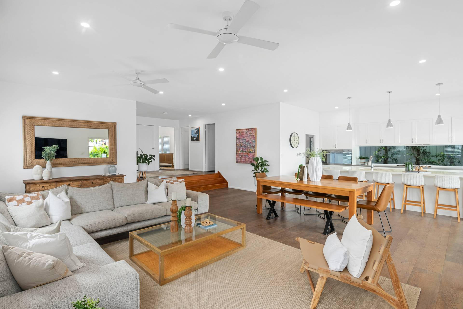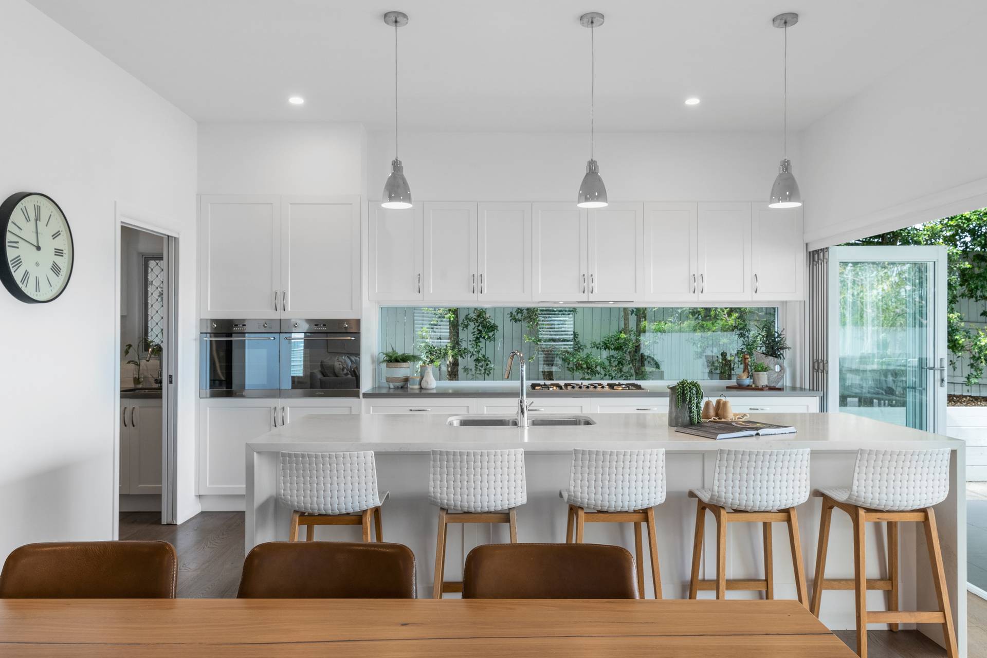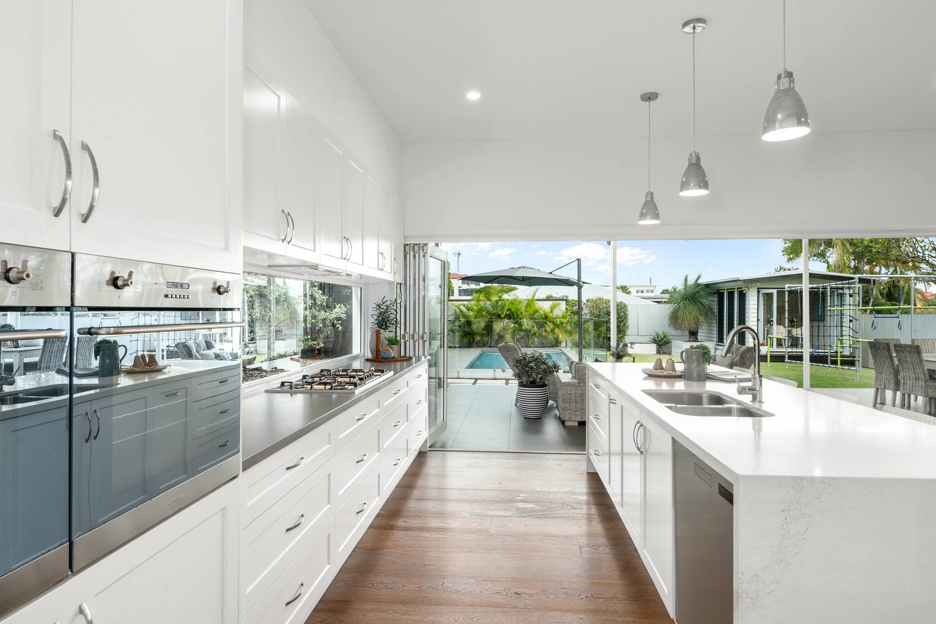 Indoor and outdoor living intertwine with bi-fold doors separating the expansive, open-plan kitchen, living and dining areas from the poolside entertaining oasis.