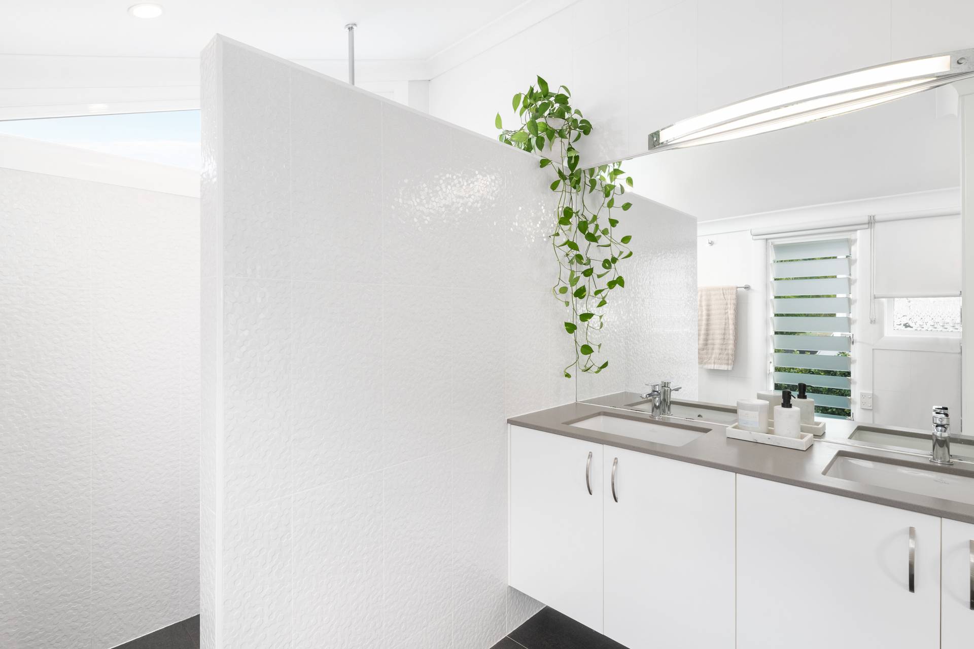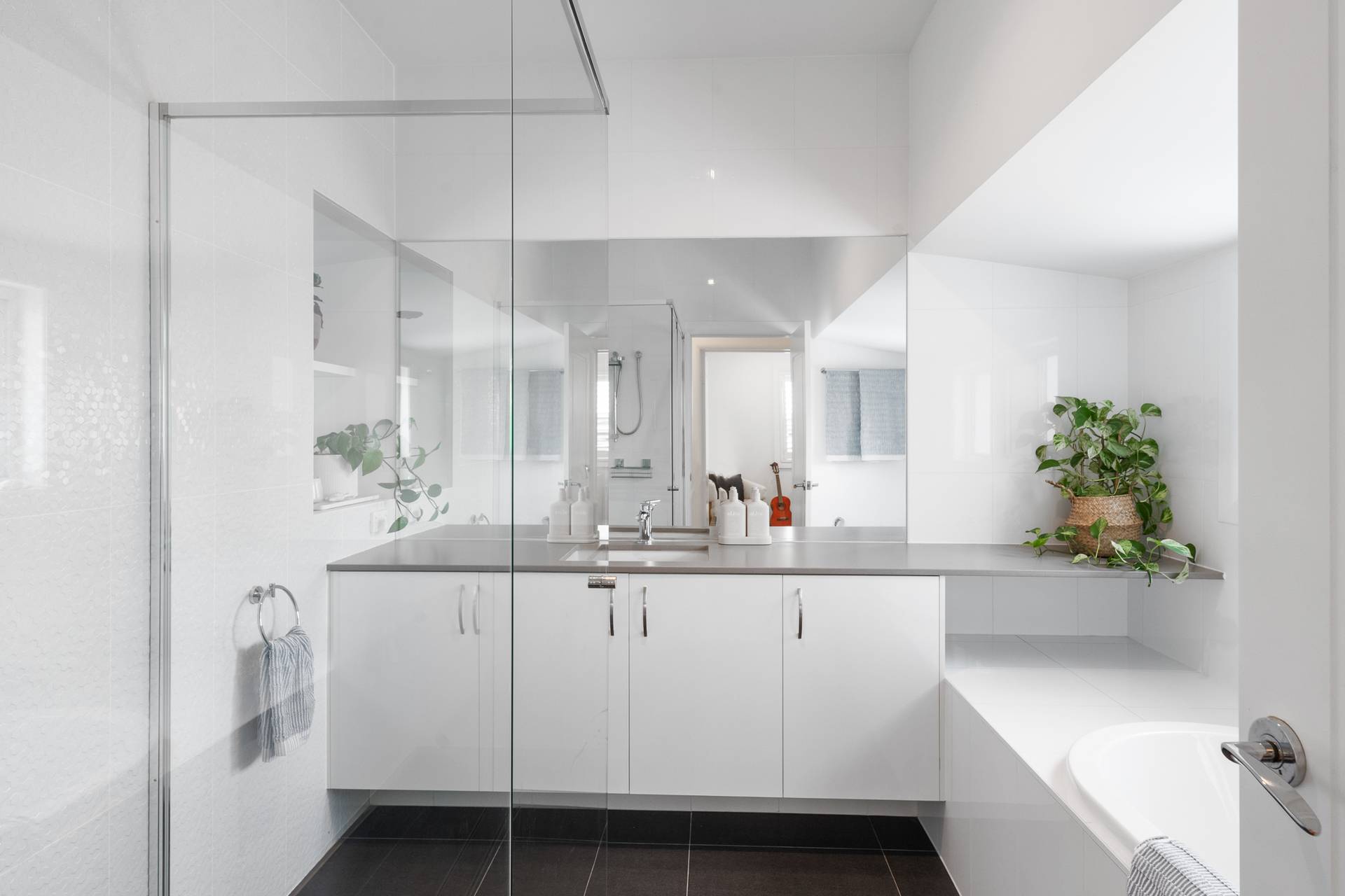 Four bedrooms and two bathrooms are upstairs, including the master hideaway with a walk-in robe and dual vanity ensuite. A fifth bedroom and third bathroom are positioned below and offer excellent privacy.