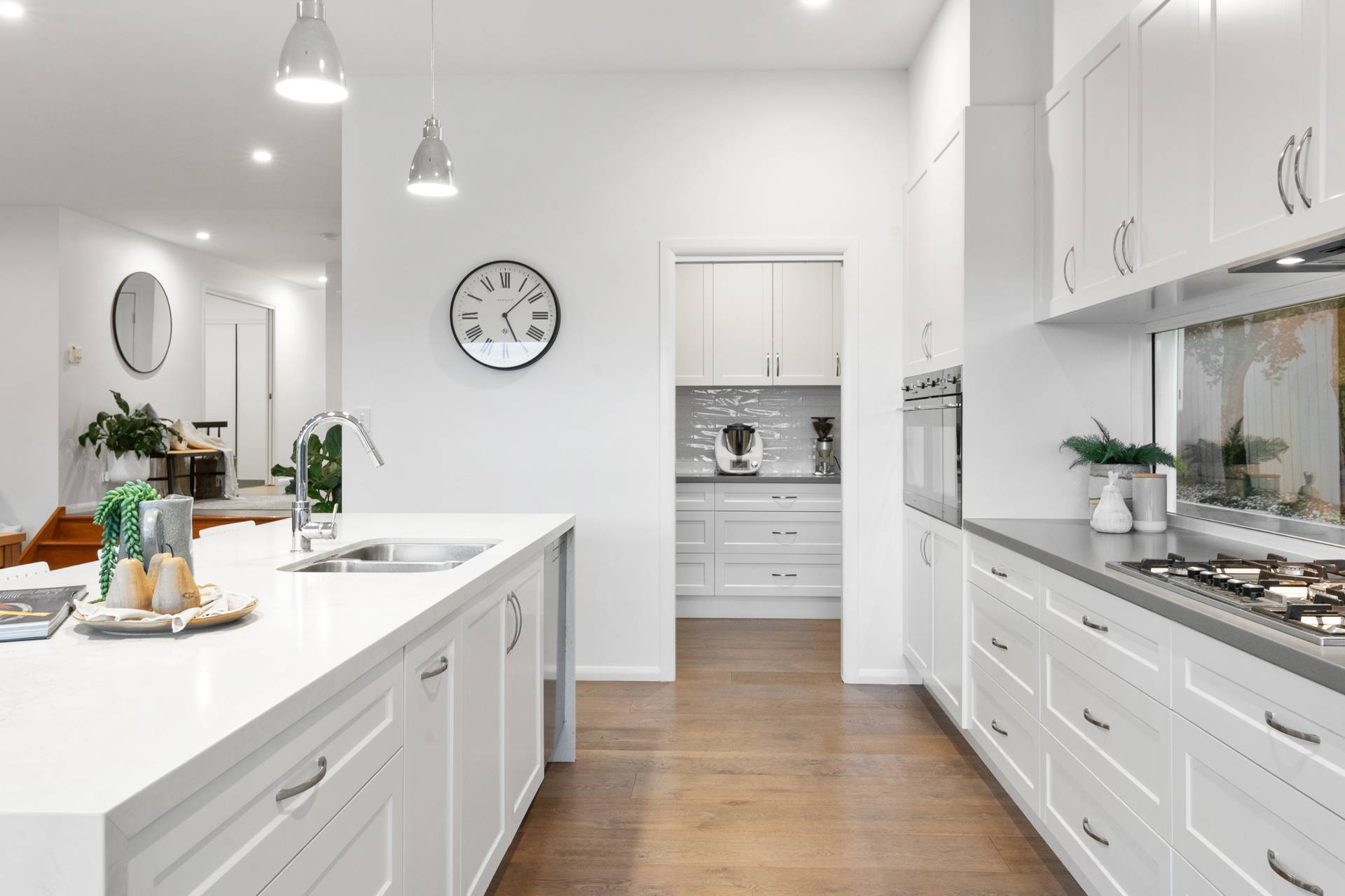 Families are invited to relax inside and share meals prepared in the gourmet kitchen, which is equipped with an oversized waterfall island, 2pac shaker-style cabinetry, a large butler's pantry, and dual Smeg ovens.