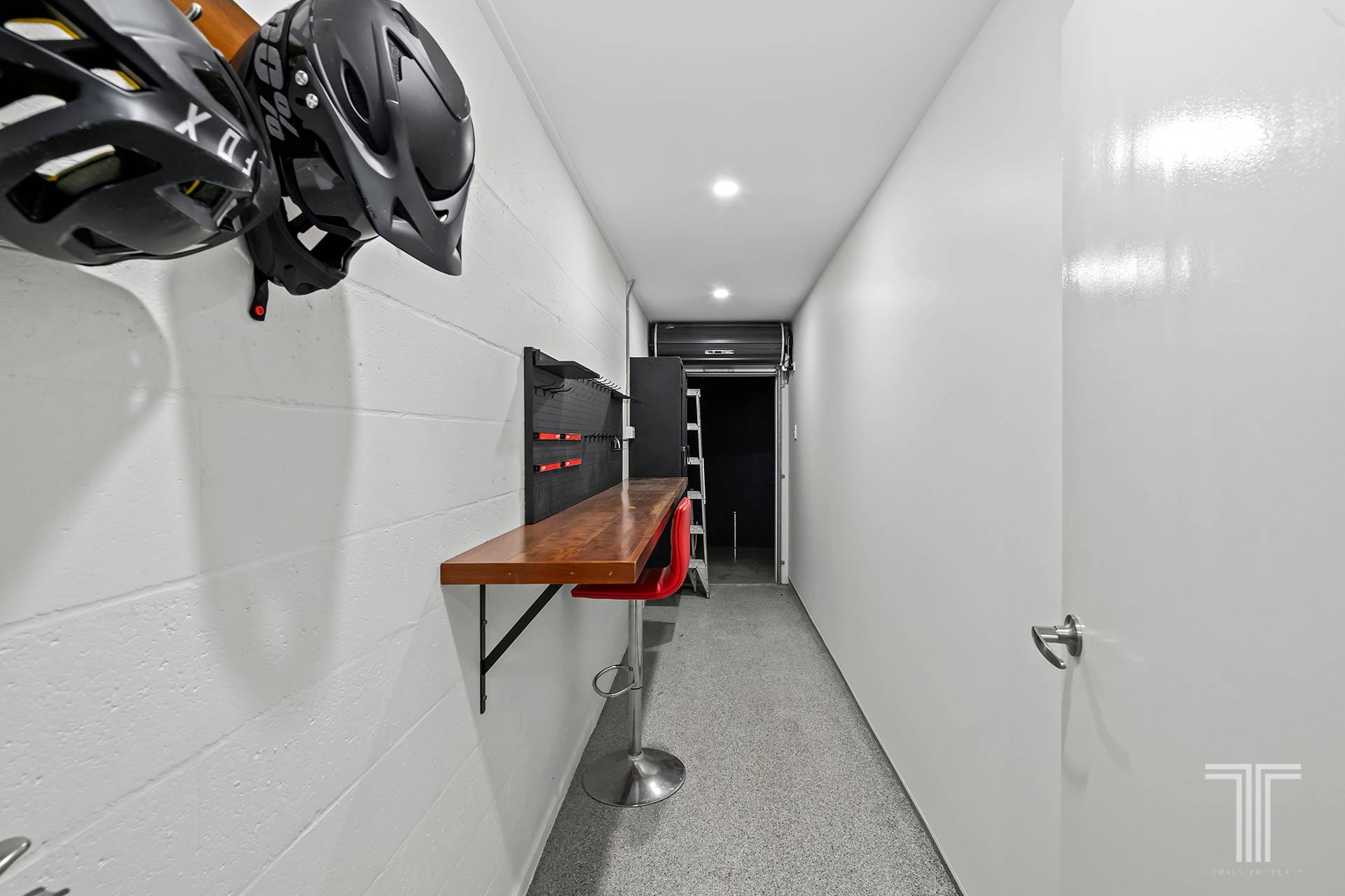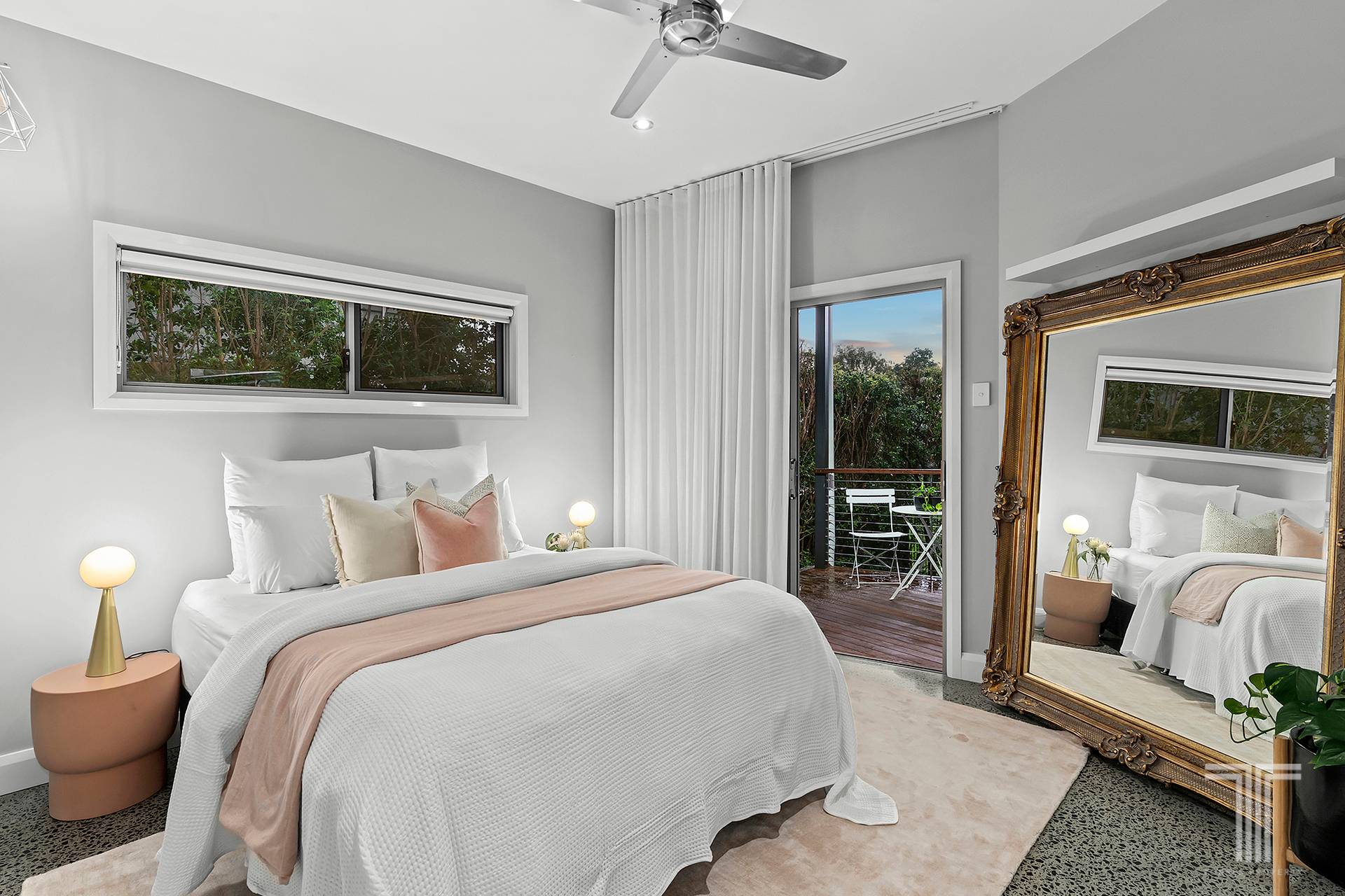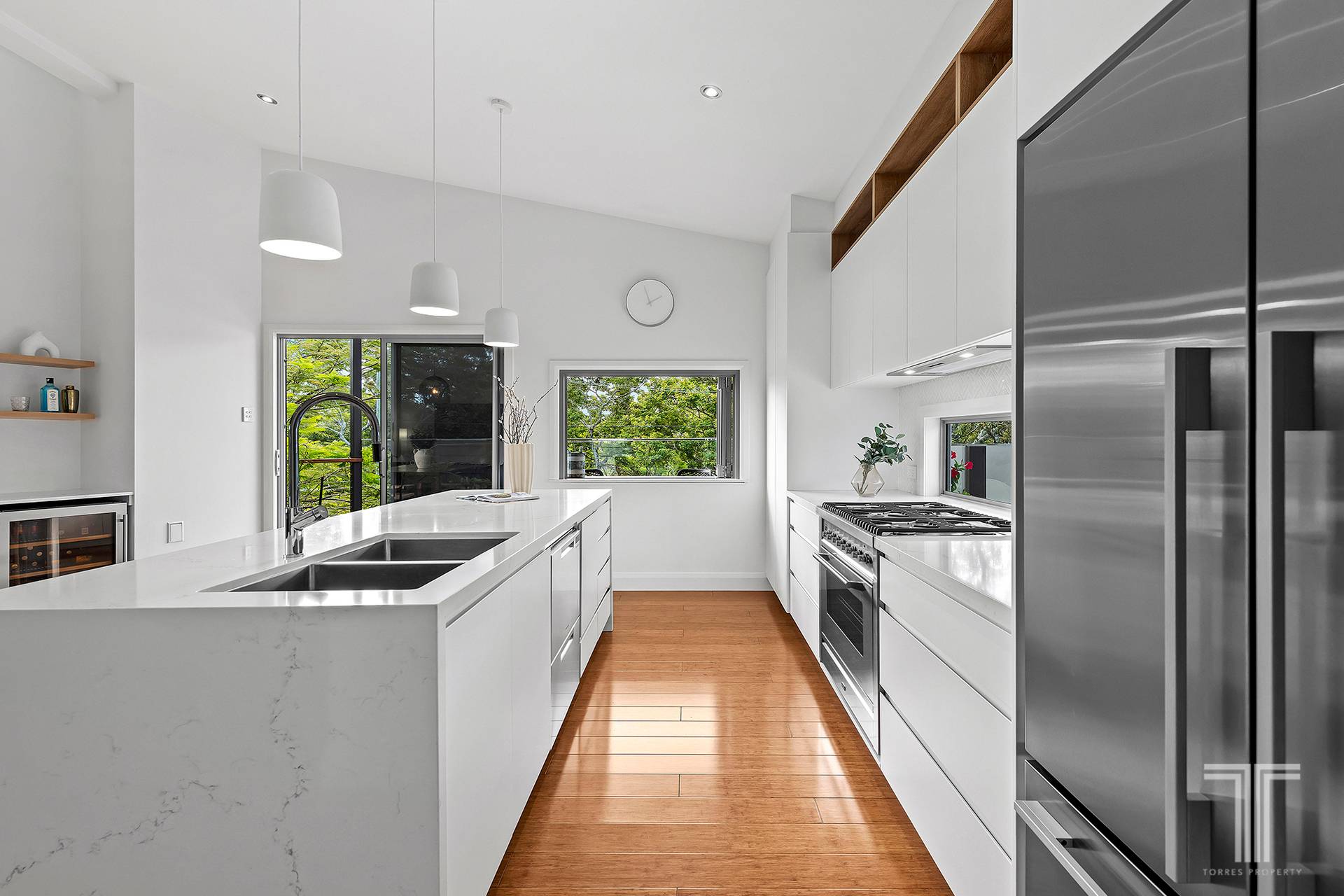 Hyper polished concrete and full strand bamboo flooring adorn the exquisite interiors, creating an artful aesthetic enriched with Quantum quartz benchtops, Phoenix tapware, and raked ceilings reaching 4.8m with port lights.