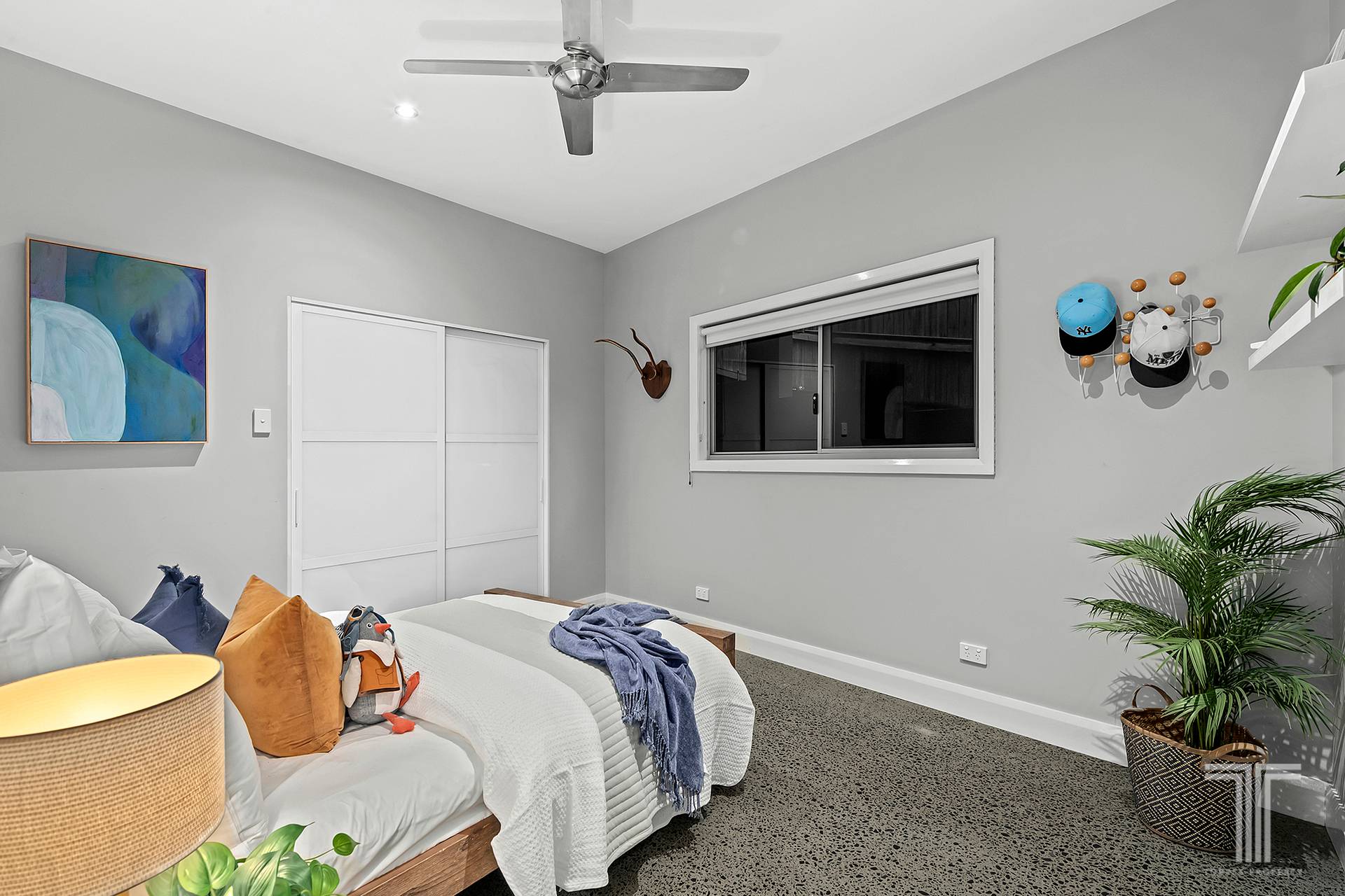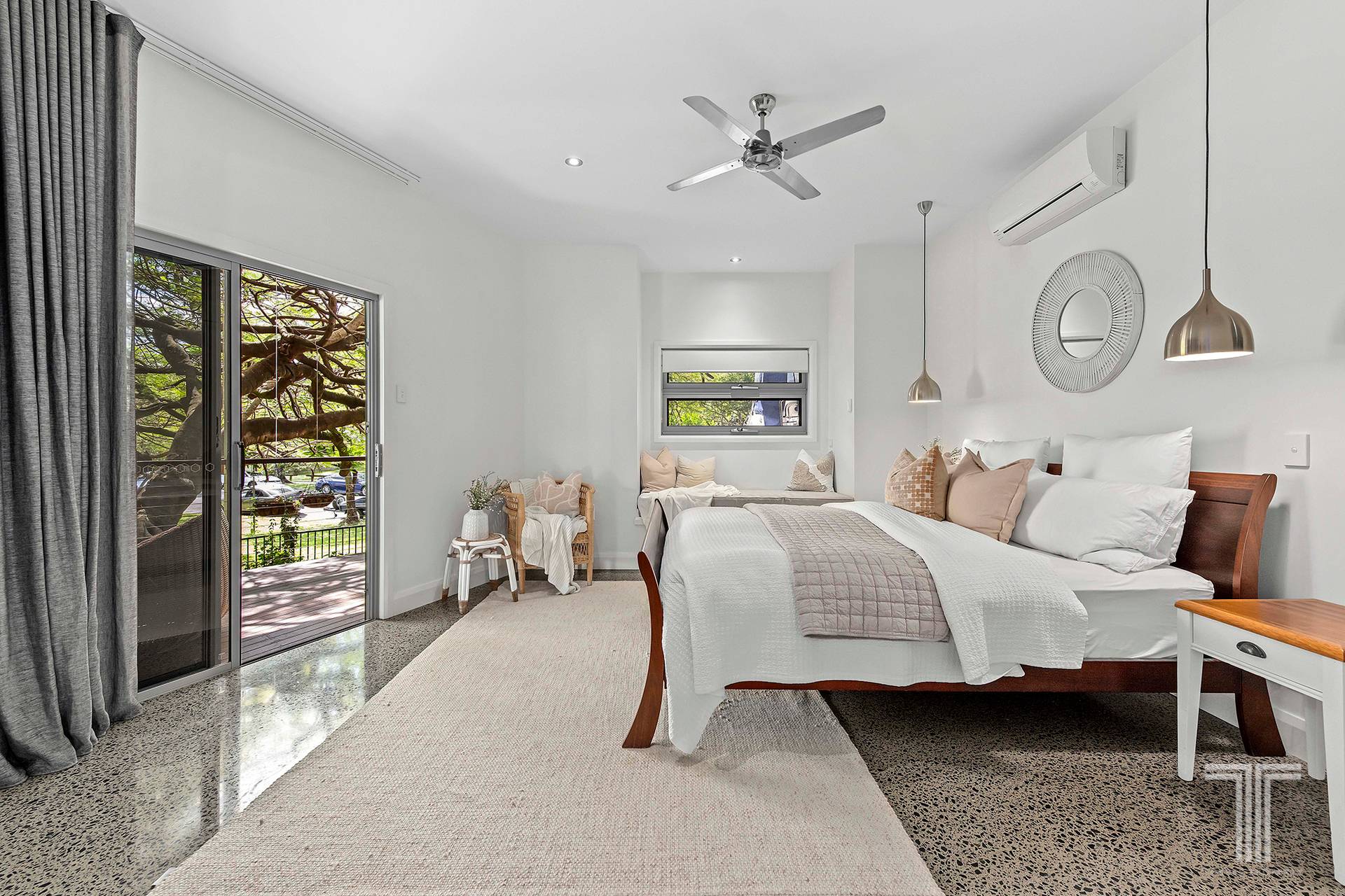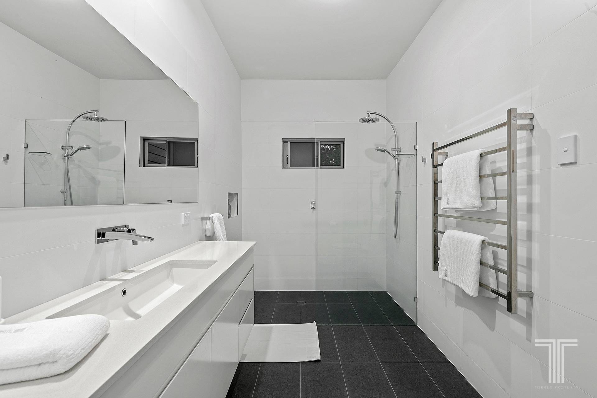 Hyper polished concrete and full strand bamboo flooring adorn the exquisite interiors, creating an artful aesthetic enriched with Quantum quartz benchtops, Phoenix tapware, and raked ceilings reaching 4.8m with port lights.
