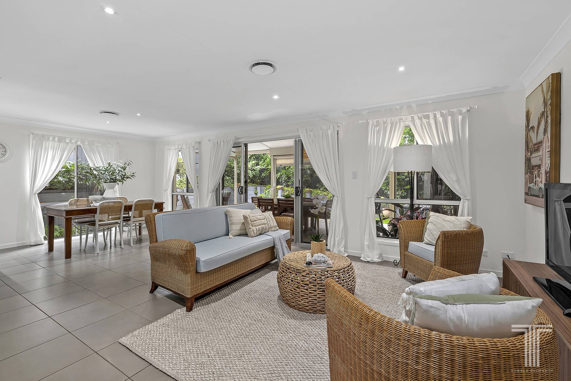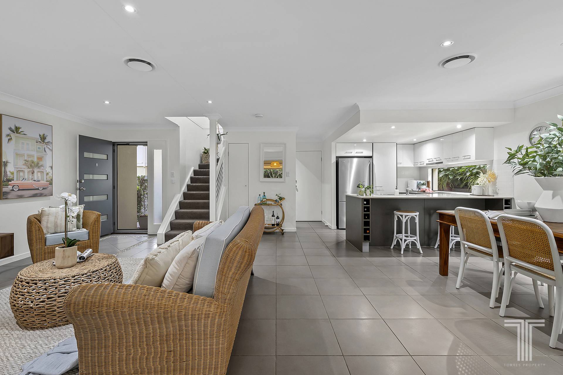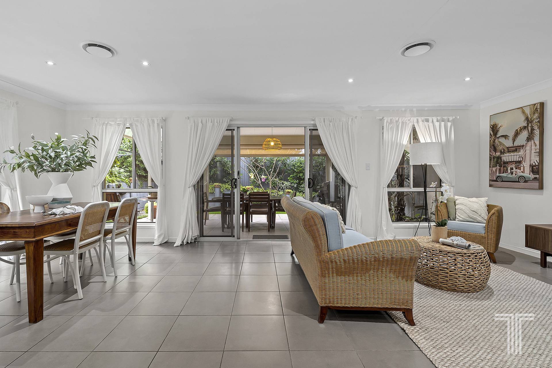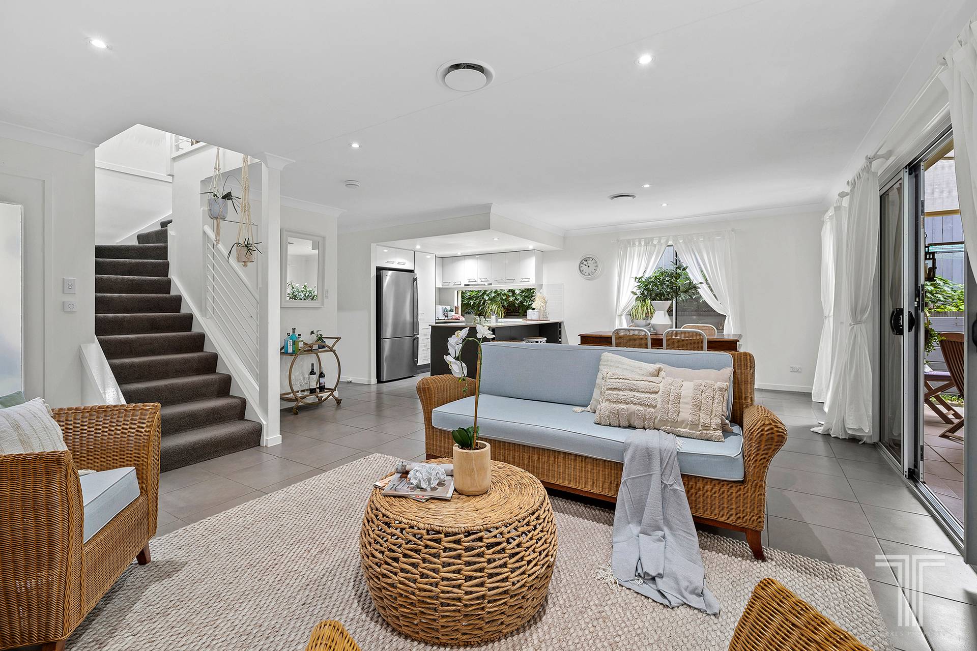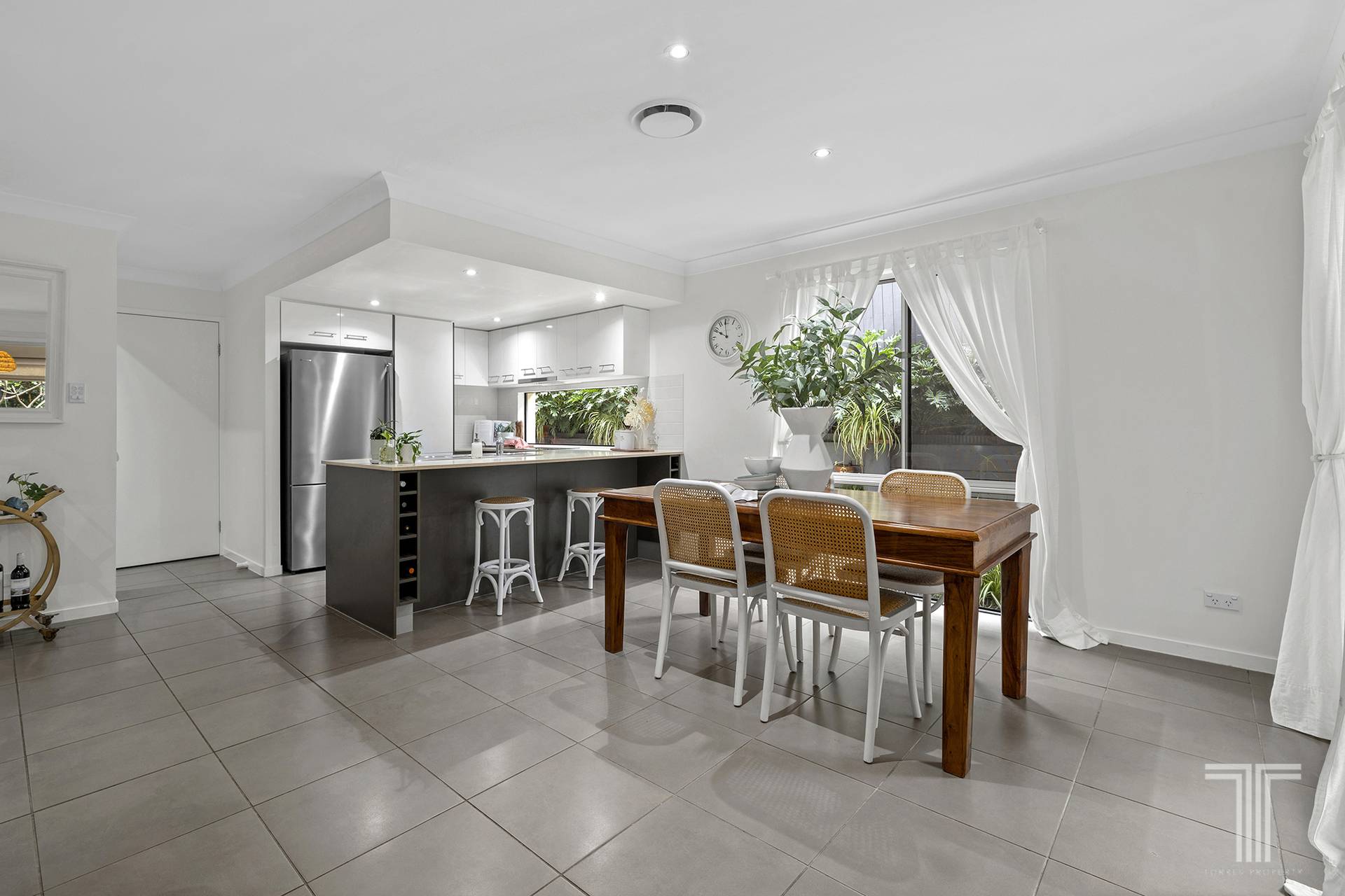 The open living and dining area forms an oasis of comfort and calm with a spacious layout that extends into the stylish kitchen, featuring stone benchtops, a breakfast bar, stainless steel appliances, and a wine rack.