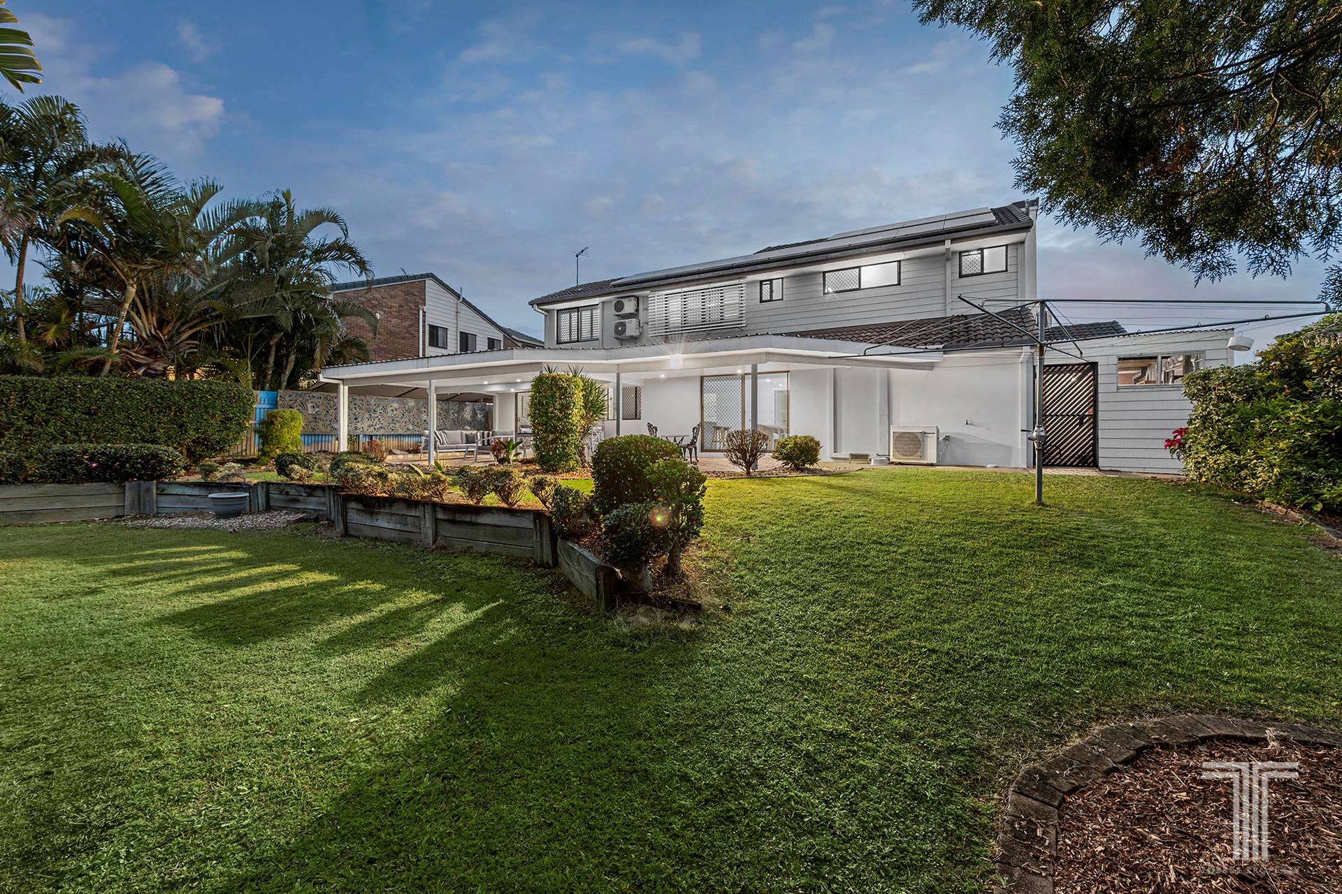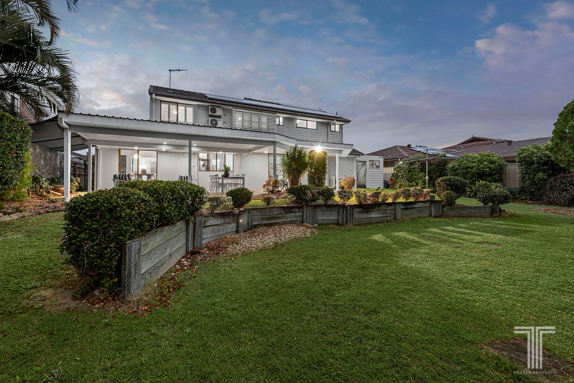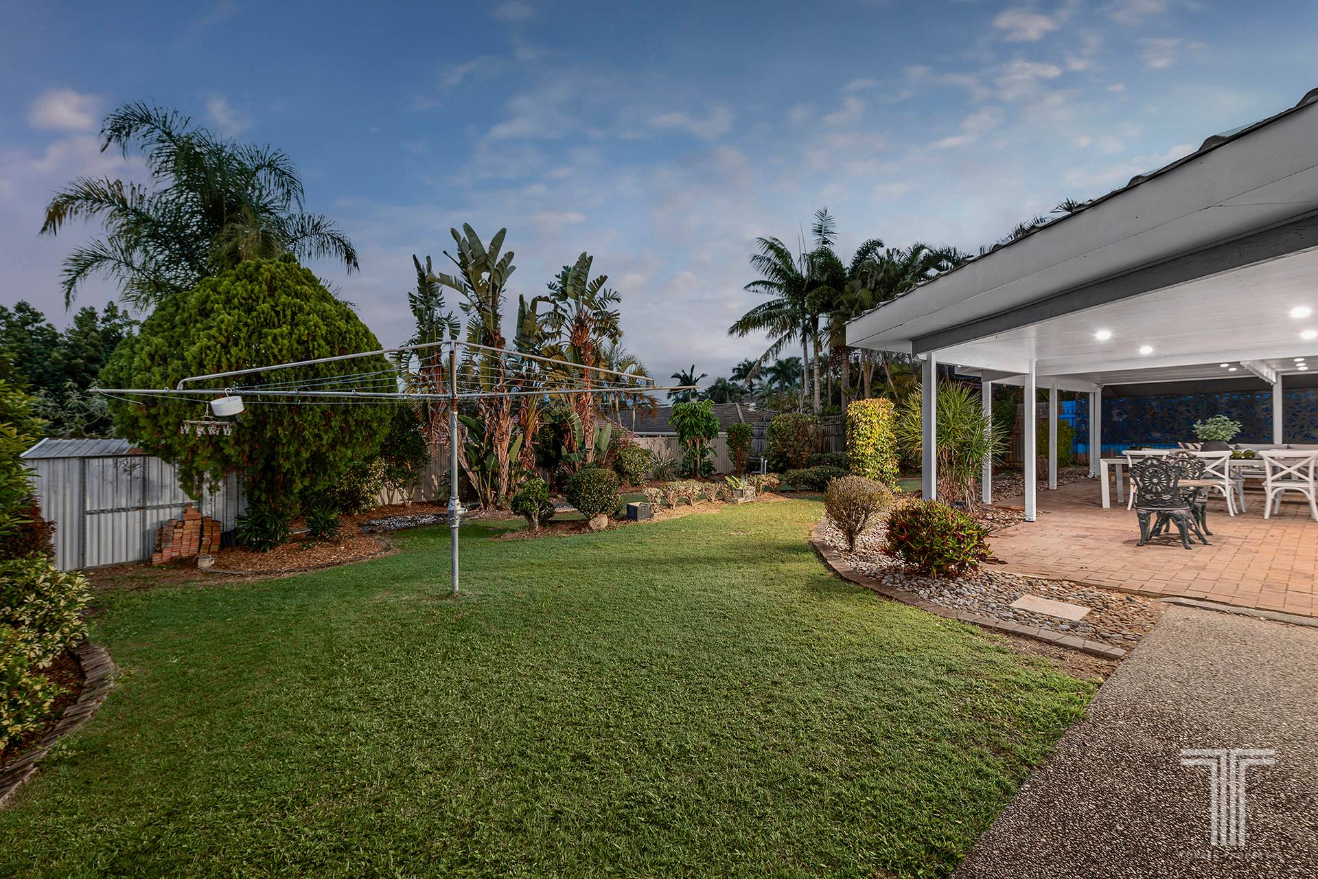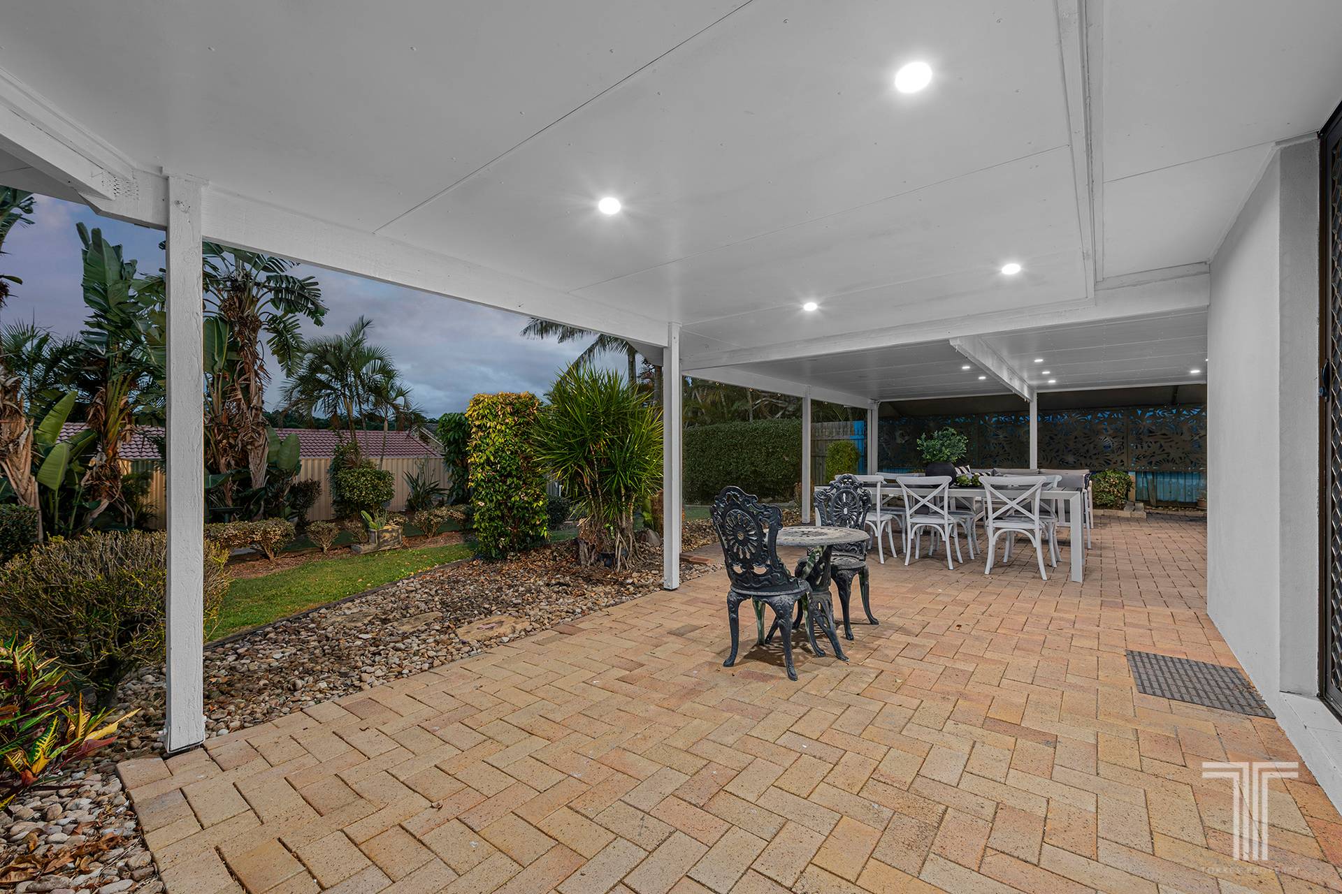 Alfresco entertaining and relaxation await on the massive rear patio, which rests peacefully under a covered roof by the big backyard and established gardens. Destined for year-round BBQs, dinners, parties, and fun with kids and pets, you will love the leafy outdoor layout.