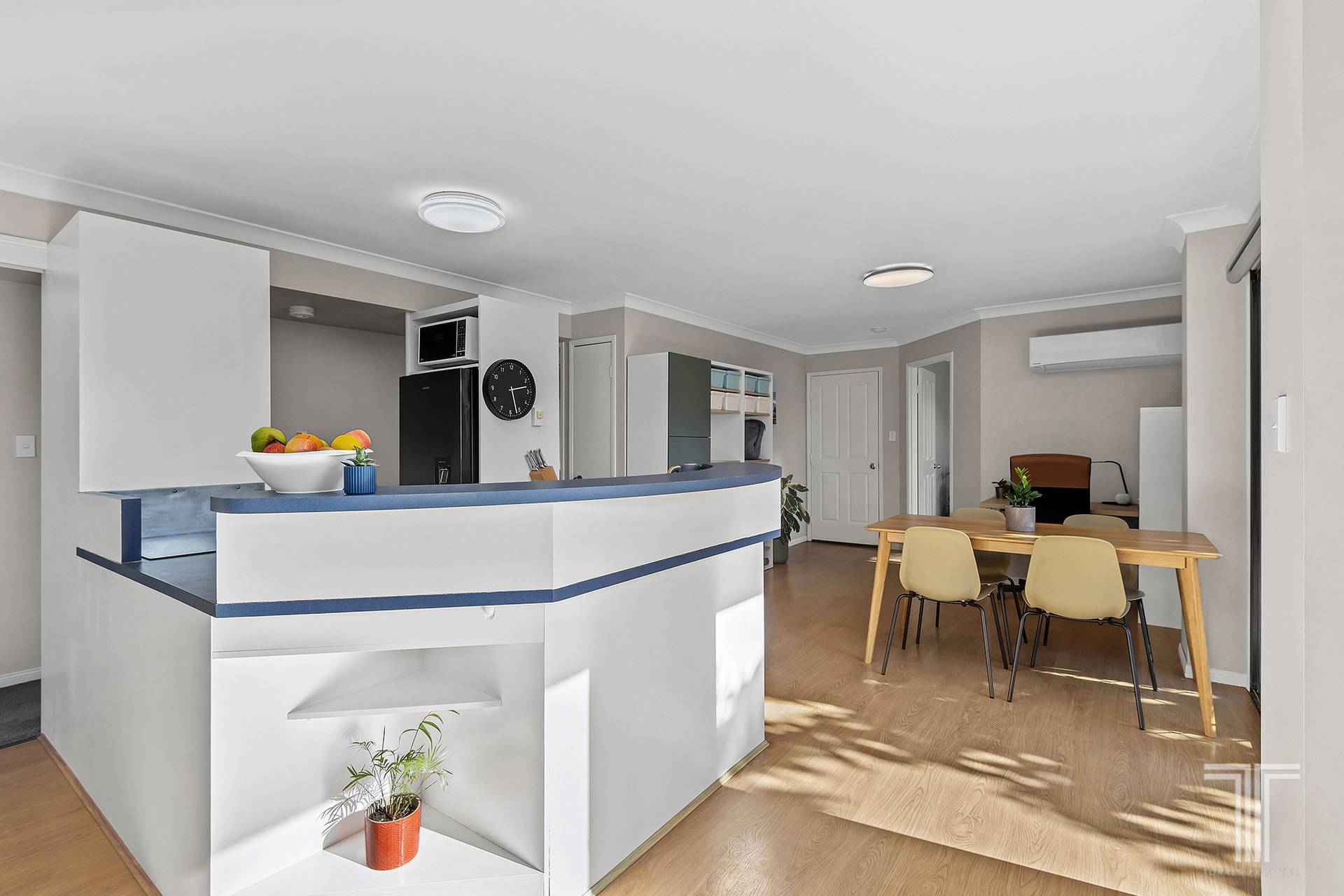 The single-level design opens to a light-filled living and dining area, which is separated by an entertainer's kitchen adorned with wraparound benchtops, an induction cooktop, a Bosch dishwasher, and direct views across the interiors and entertaining area.