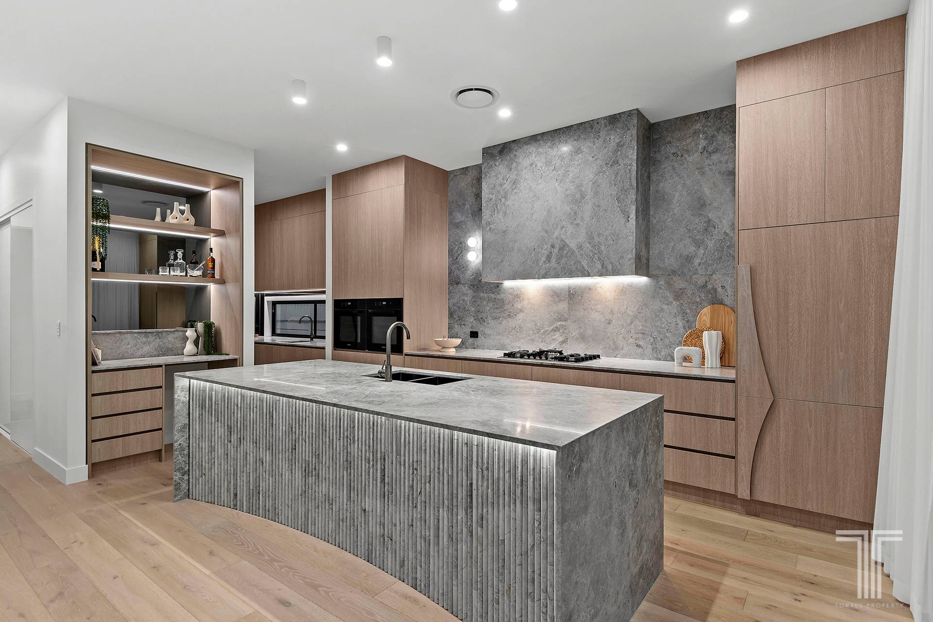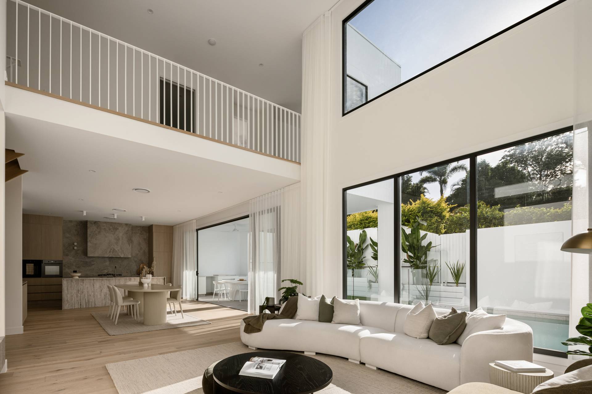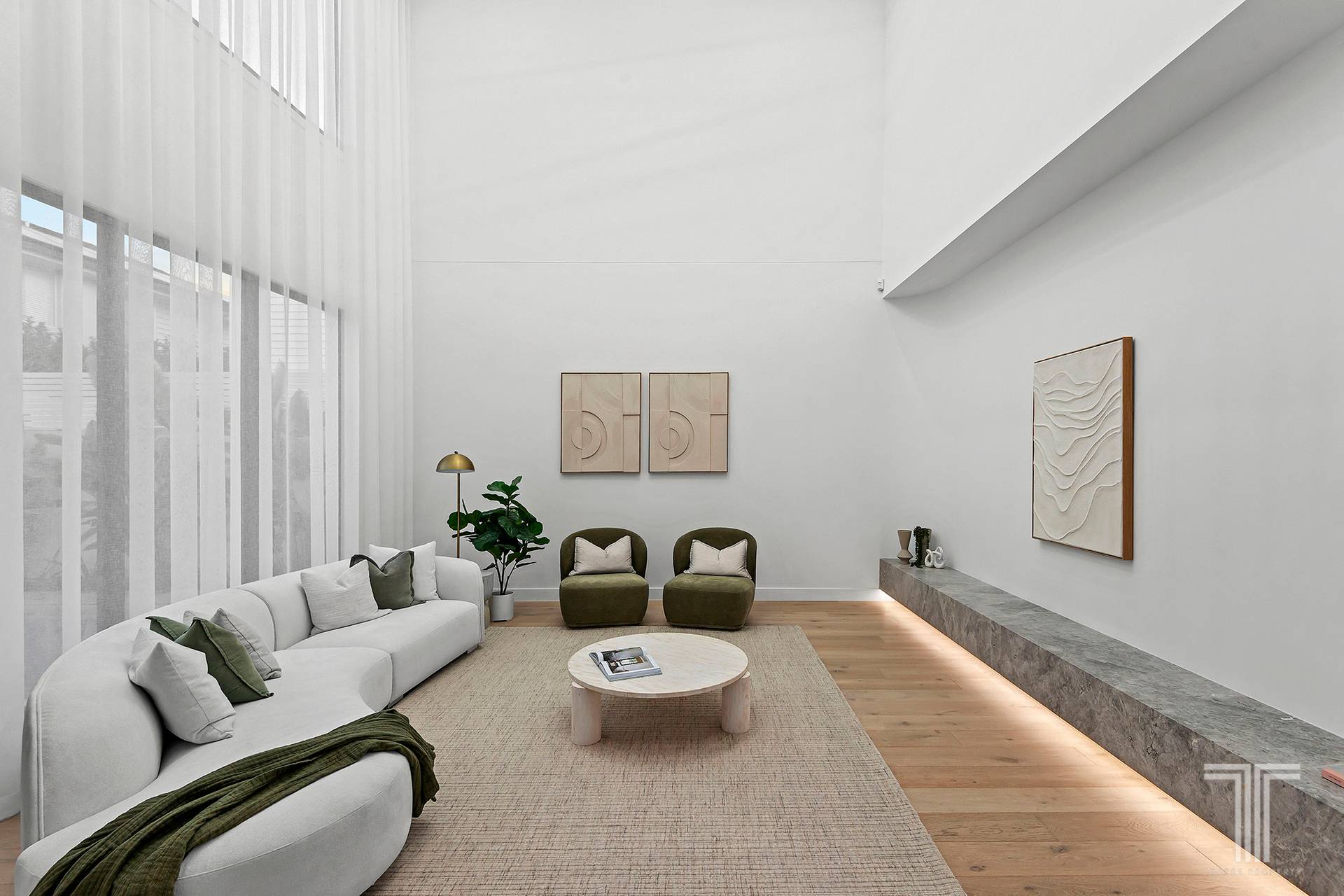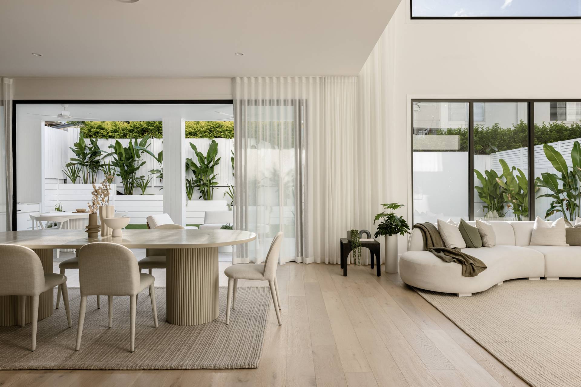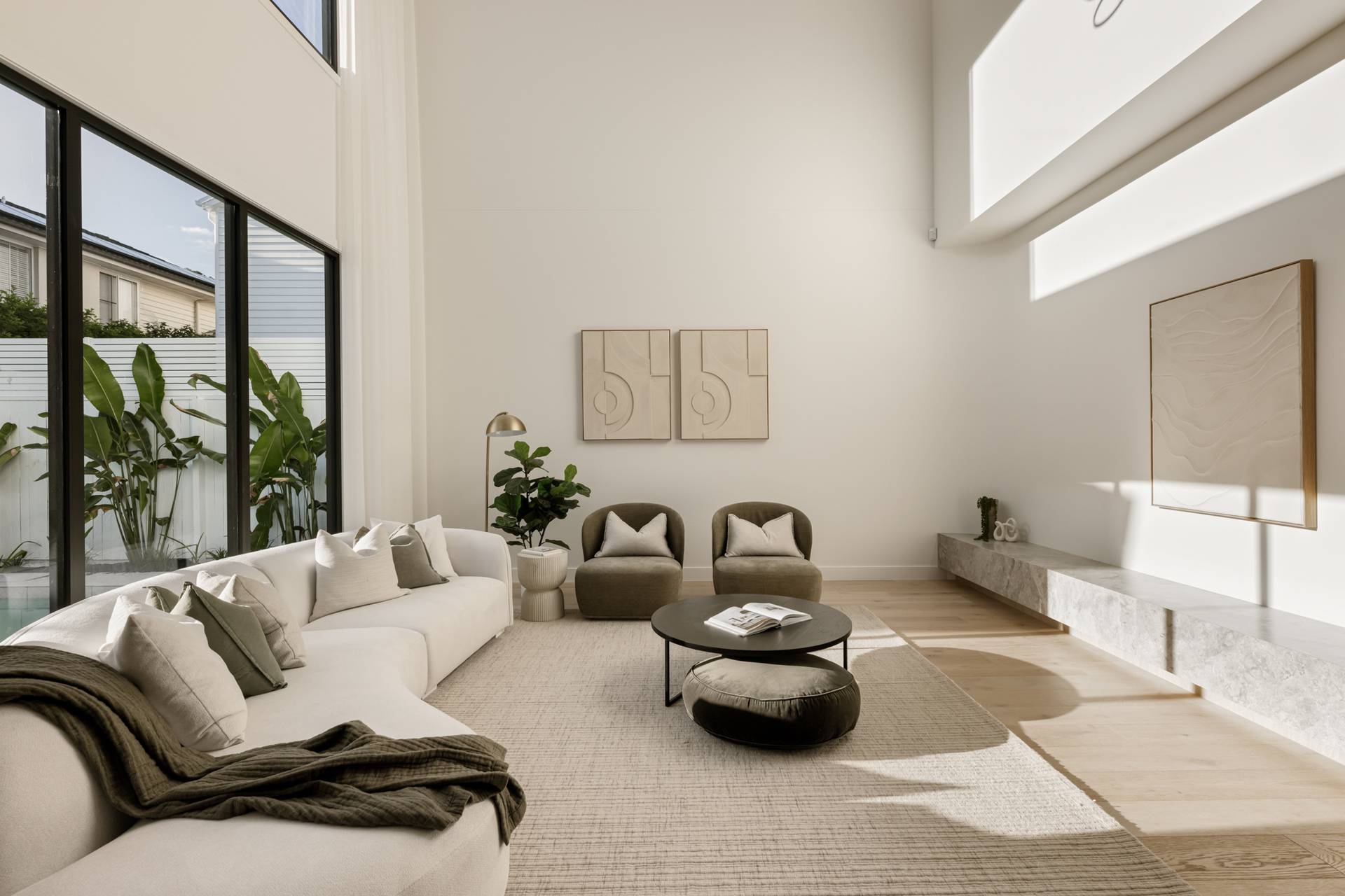 Composed with a soaring 6-metre void and picture windows framing the saltwater pool, the residence is illuminated with natural light and reflects brilliance across the Tundra Grey marble and American oak interiors. Two living spaces include a media lounge and an open living and dining area below the towering void. Flowing across the bar and into the stunning Miele kitchen, the resident chef will adore the selection of premium appointments, butler's pantry and incredible waterfall island bench.