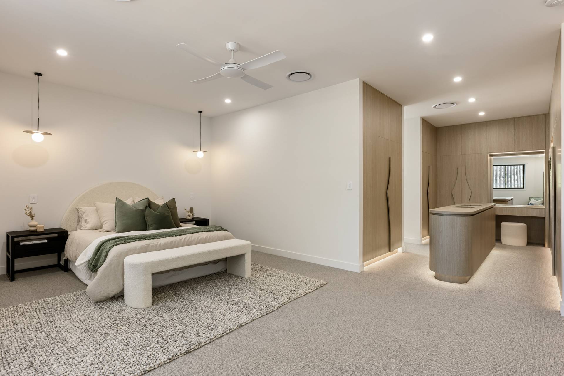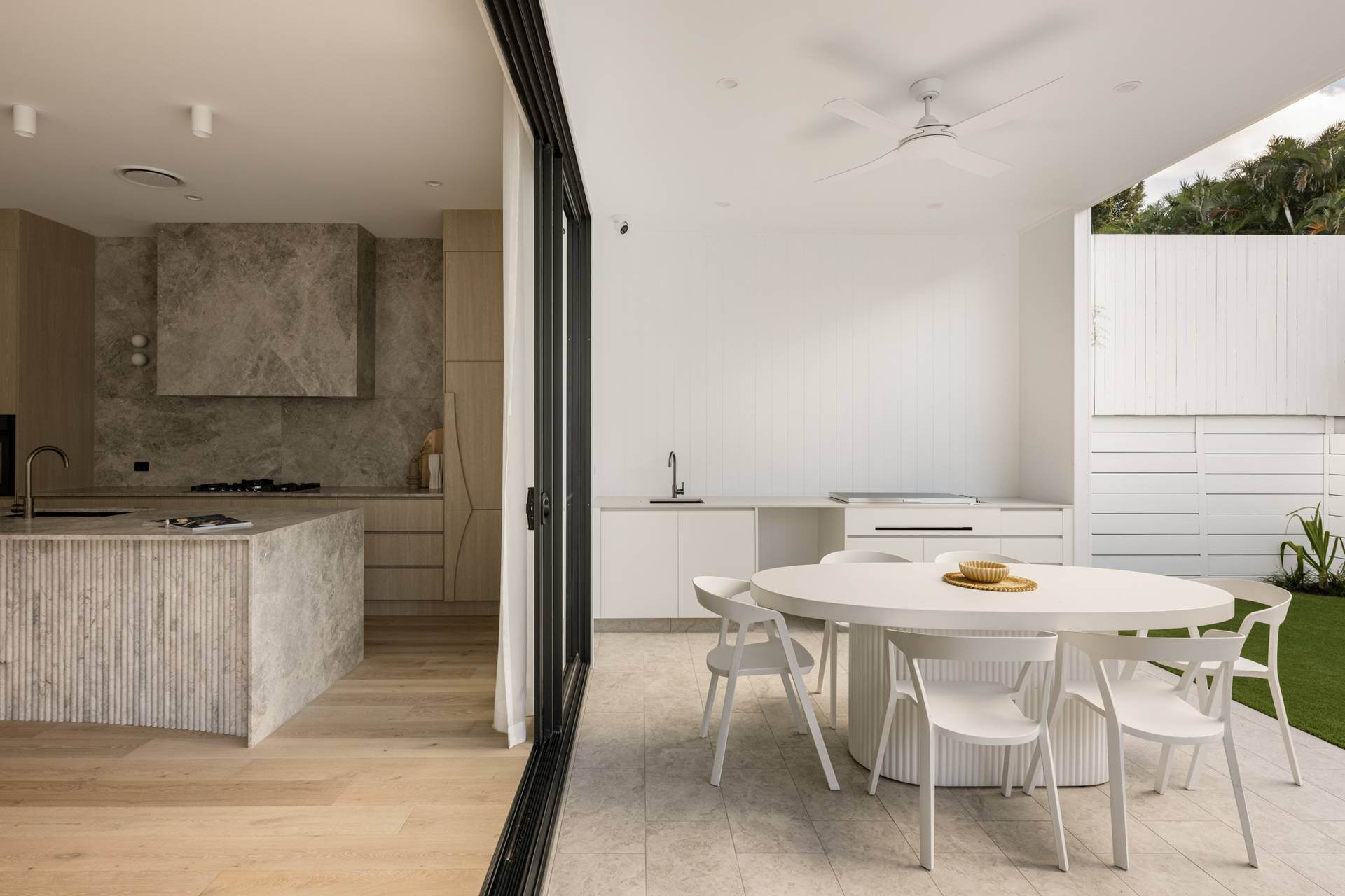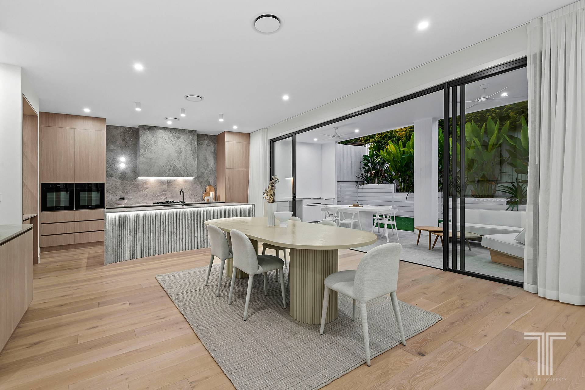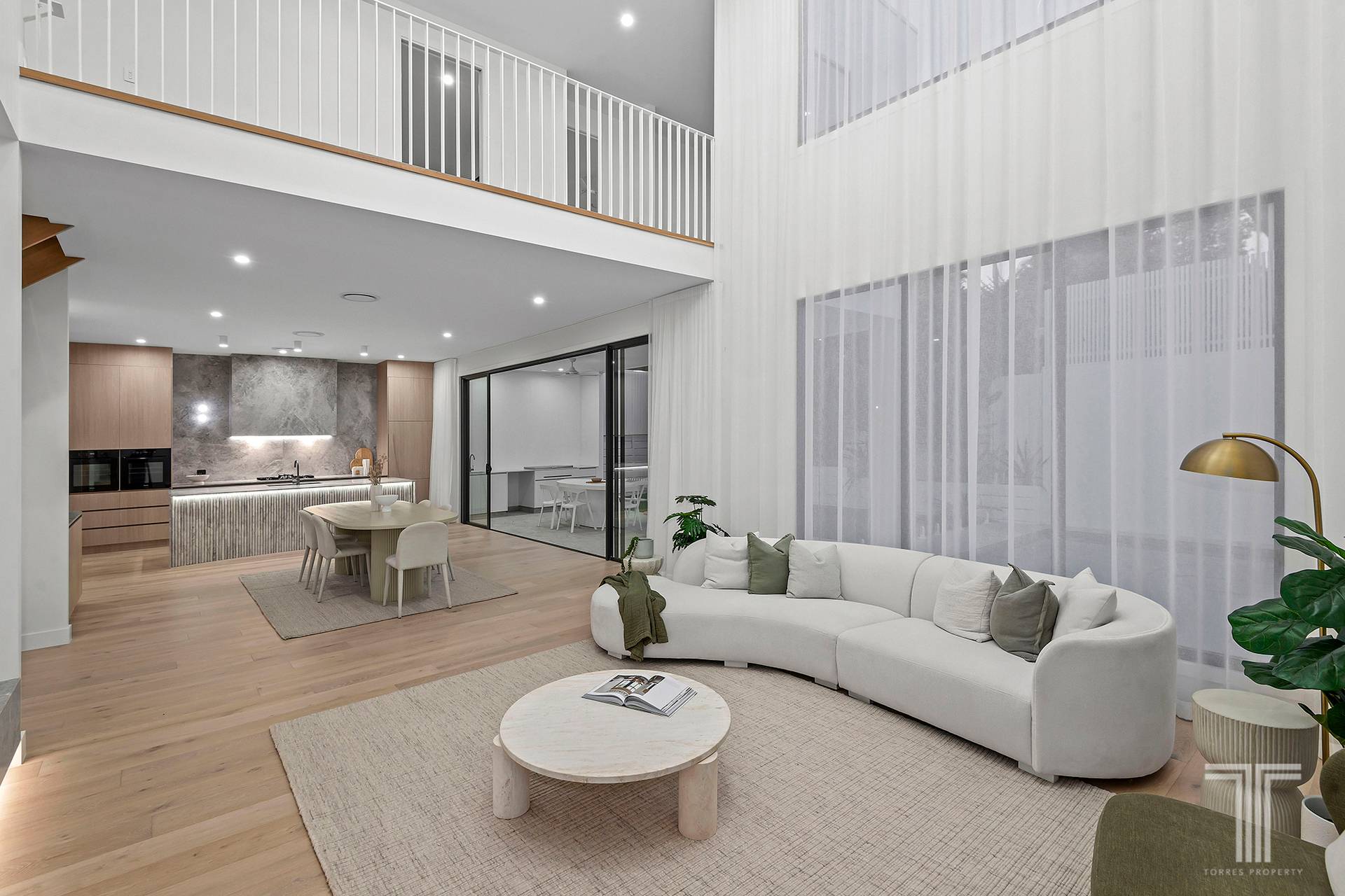 Composed with a soaring 6-metre void and picture windows framing the saltwater pool, the residence is illuminated with natural light and reflects brilliance across the Tundra Grey marble and American oak interiors. Two living spaces include a media lounge and an open living and dining area below the towering void. Flowing across the bar and into the stunning Miele kitchen, the resident chef will adore the selection of premium appointments, butler's pantry and incredible waterfall island bench.