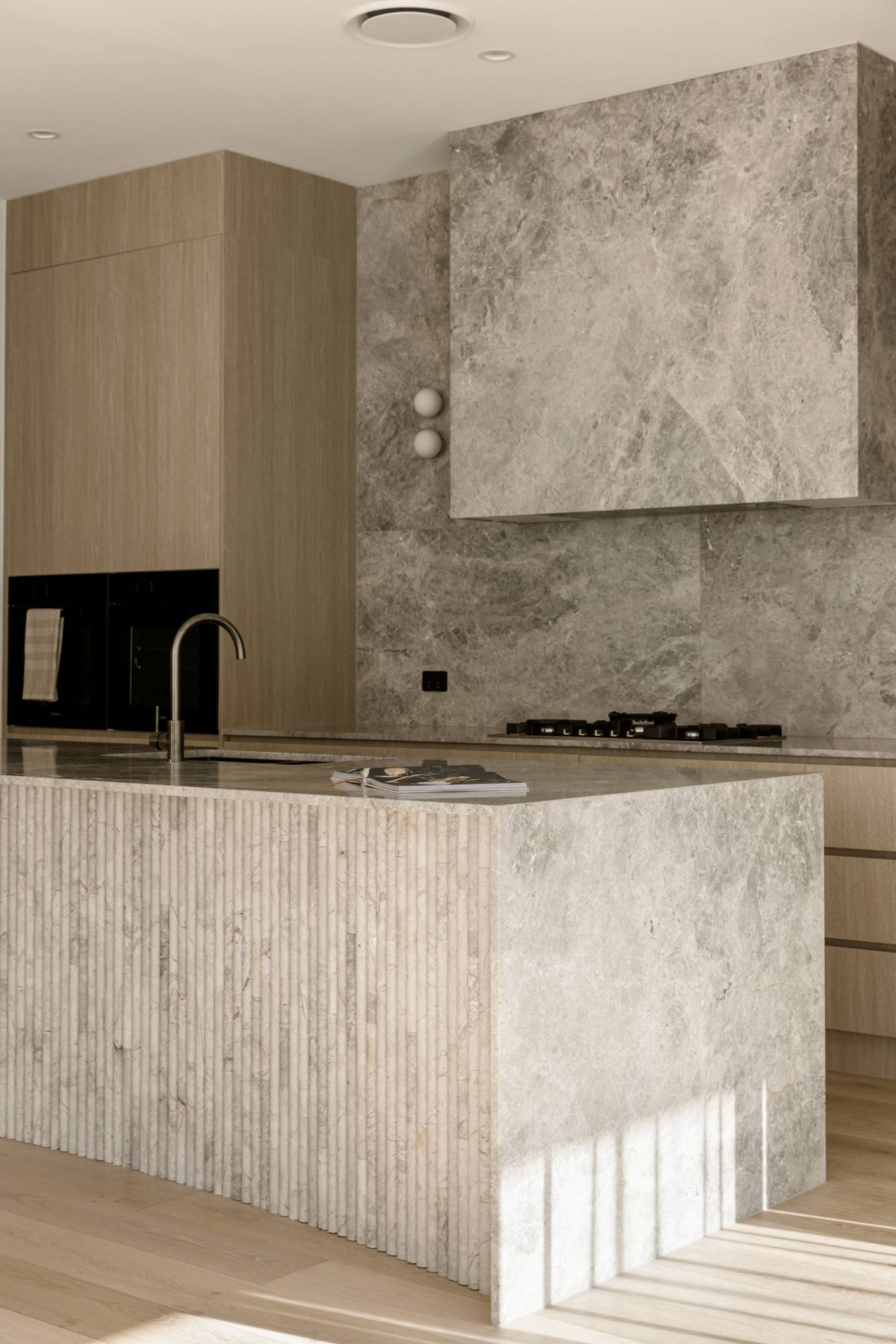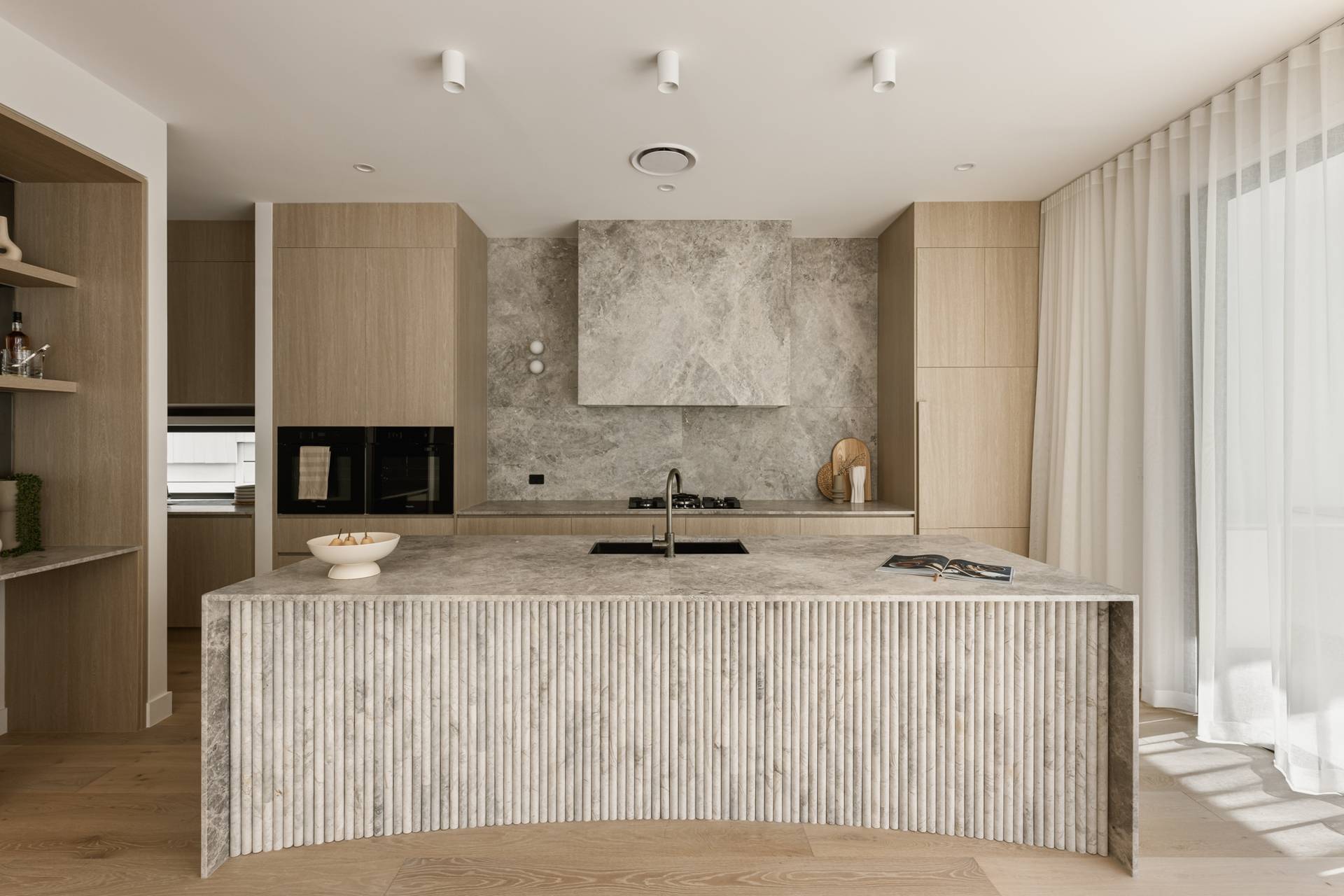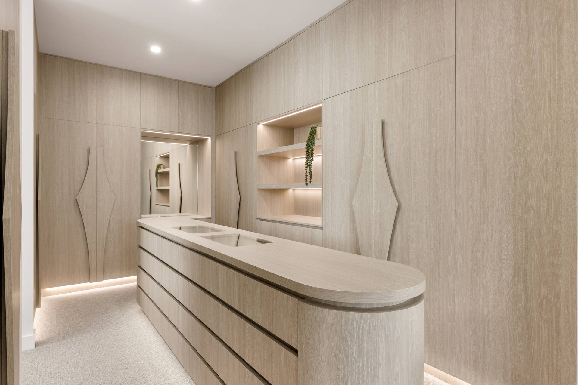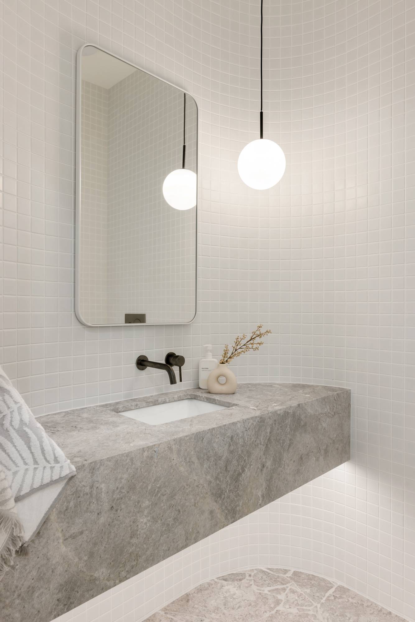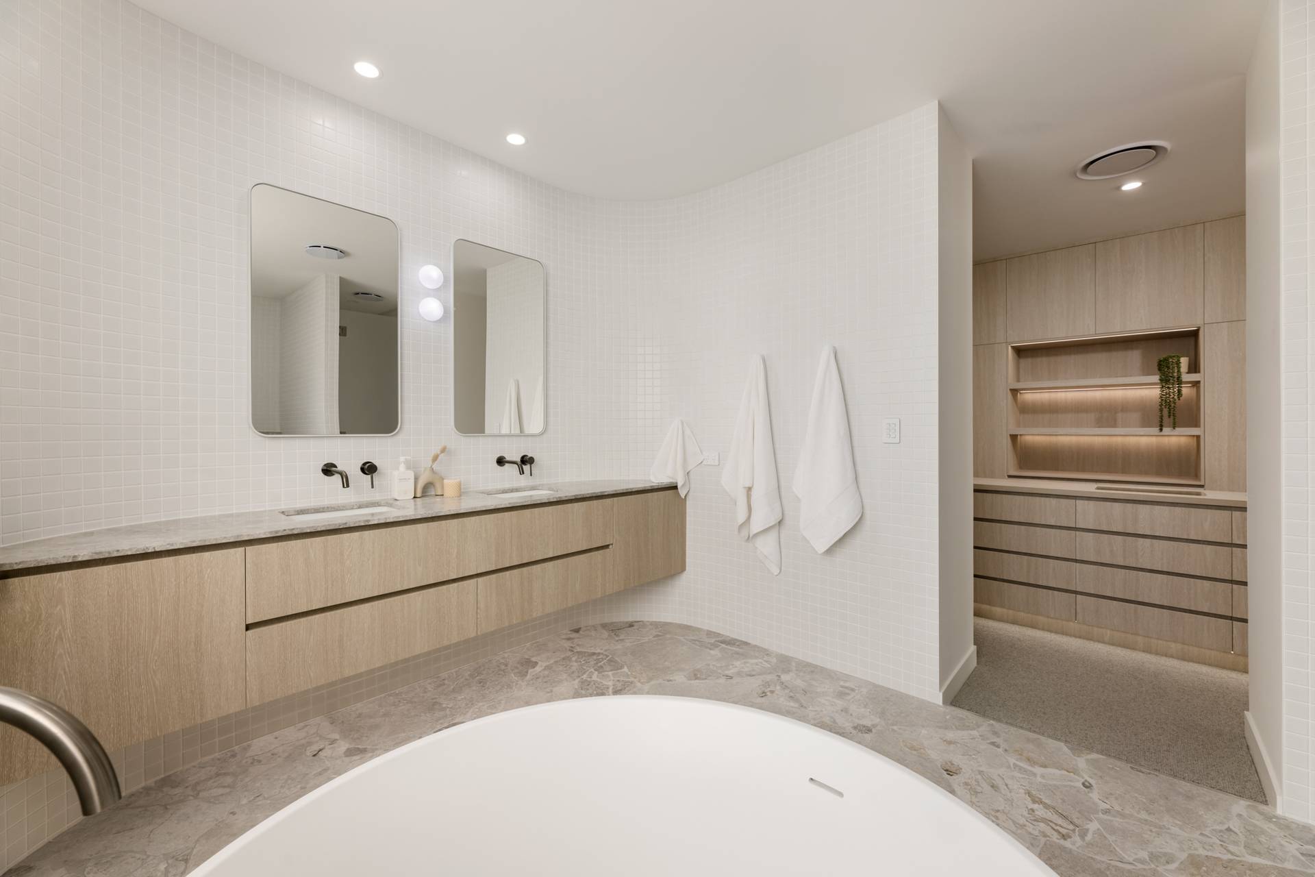 Composed with a soaring 6-metre void and picture windows framing the saltwater pool, the residence is illuminated with natural light and reflects brilliance across the Tundra Grey marble and American oak interiors. Two living spaces include a media lounge and an open living and dining area below the towering void. Flowing across the bar and into the stunning Miele kitchen, the resident chef will adore the selection of premium appointments, butler's pantry and incredible waterfall island bench.