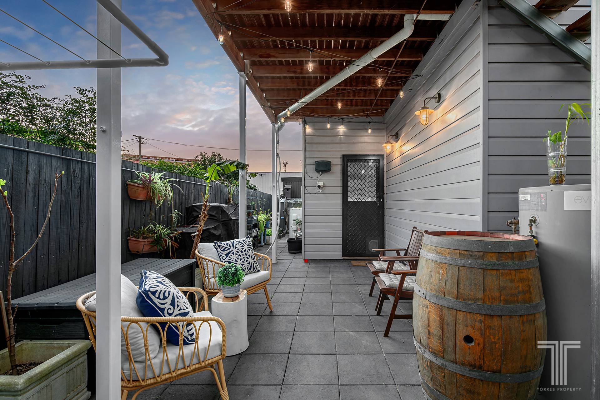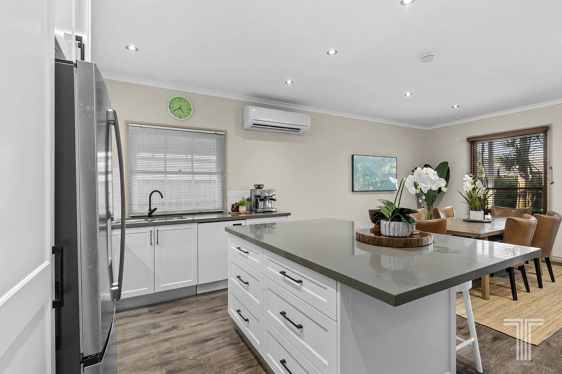 The floor plan provides functional separation with a living/dining area downstairs by the modern kitchen with a central stone island bench, and an additional living room resides on the upper floor with a light-filled bar that can be utilised for entertaining or dual living.