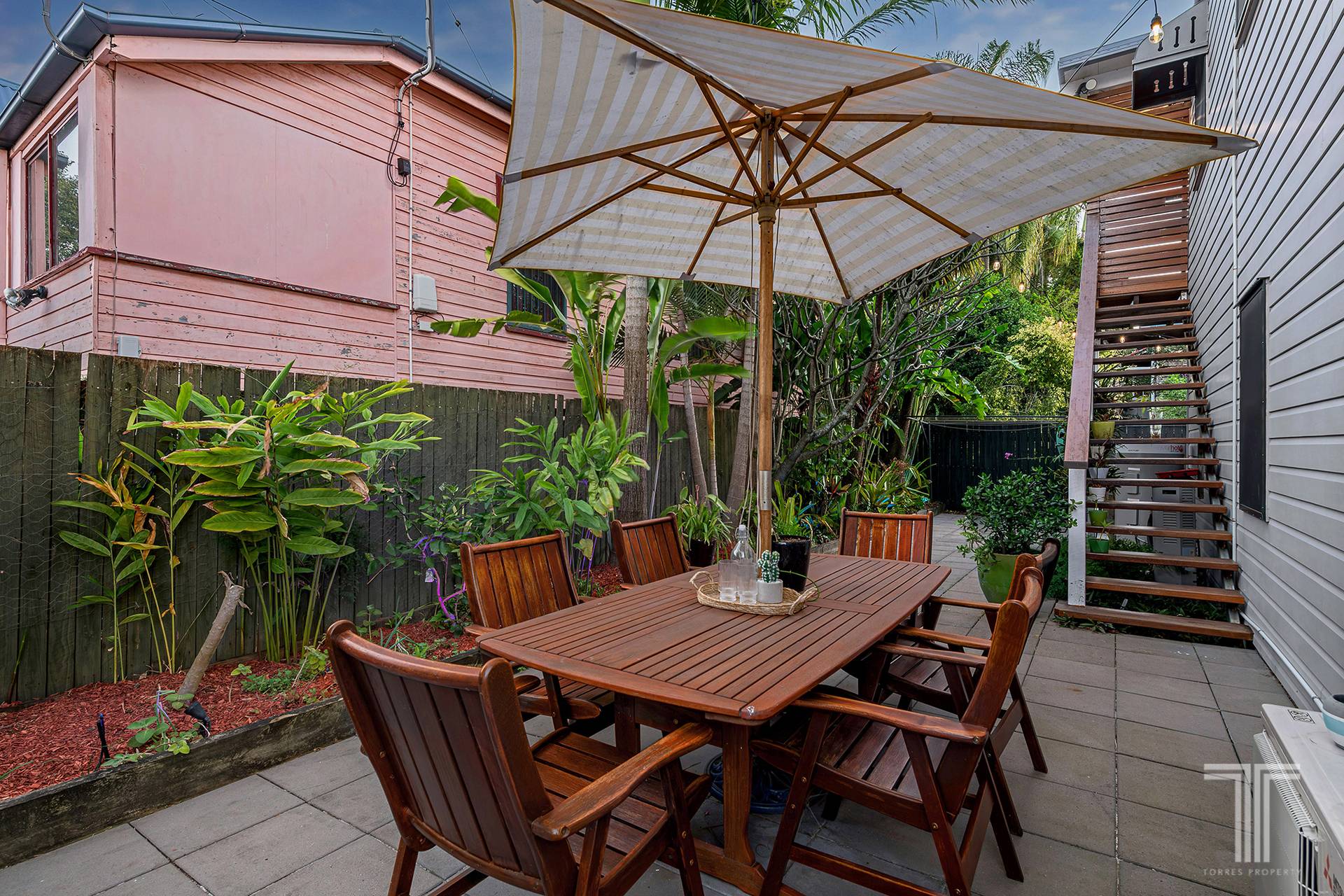 With the interiors unfolding to an enclosed balcony and patio upstairs, and dual patios and a private flat yard below, the house emphasises outdoor living with plenty of room for active kids and pets, hosting guests, and relaxation by the palm trees.