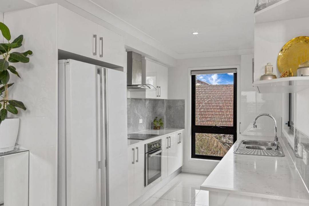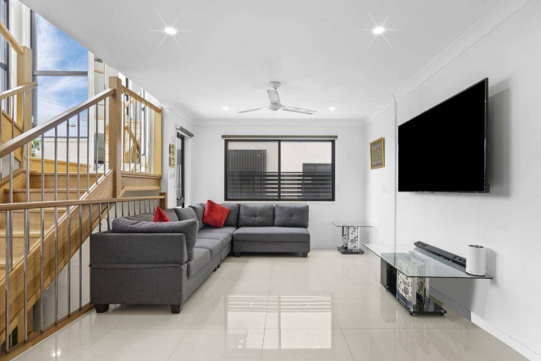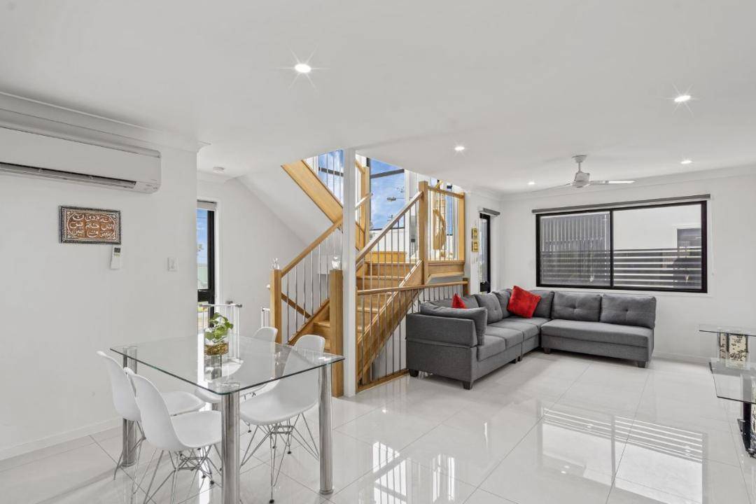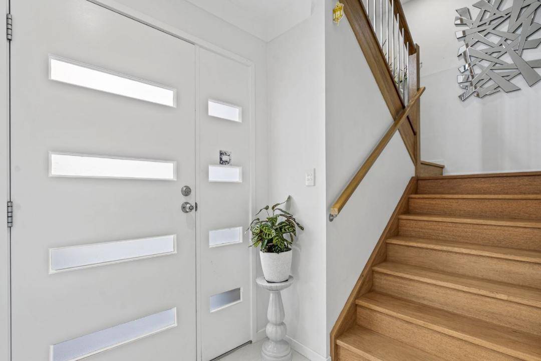 The home boasts beautiful white porcelain tiles throughout, cozy carpeted bedrooms, and a stunning timber staircase that connects each level. At the heart of the home lies the kitchen, dining, and indoor/outdoor living areas, seamlessly blending comfort and style.