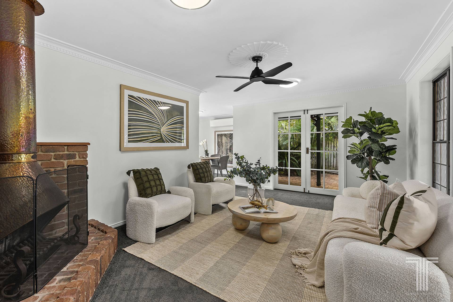 Ensuring family functionality and ease of movement for everyday living and entertaining, the open-plan layout unfolds to the lounge room with a fireplace, the dining area with air-conditioning, and the family zone, which rests by the well-appointed kitchen with ample storage and a double-drawer dishwasher.