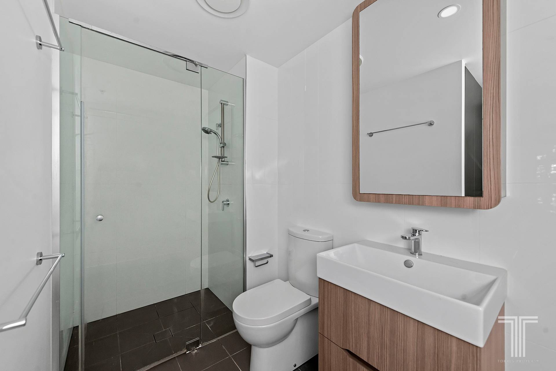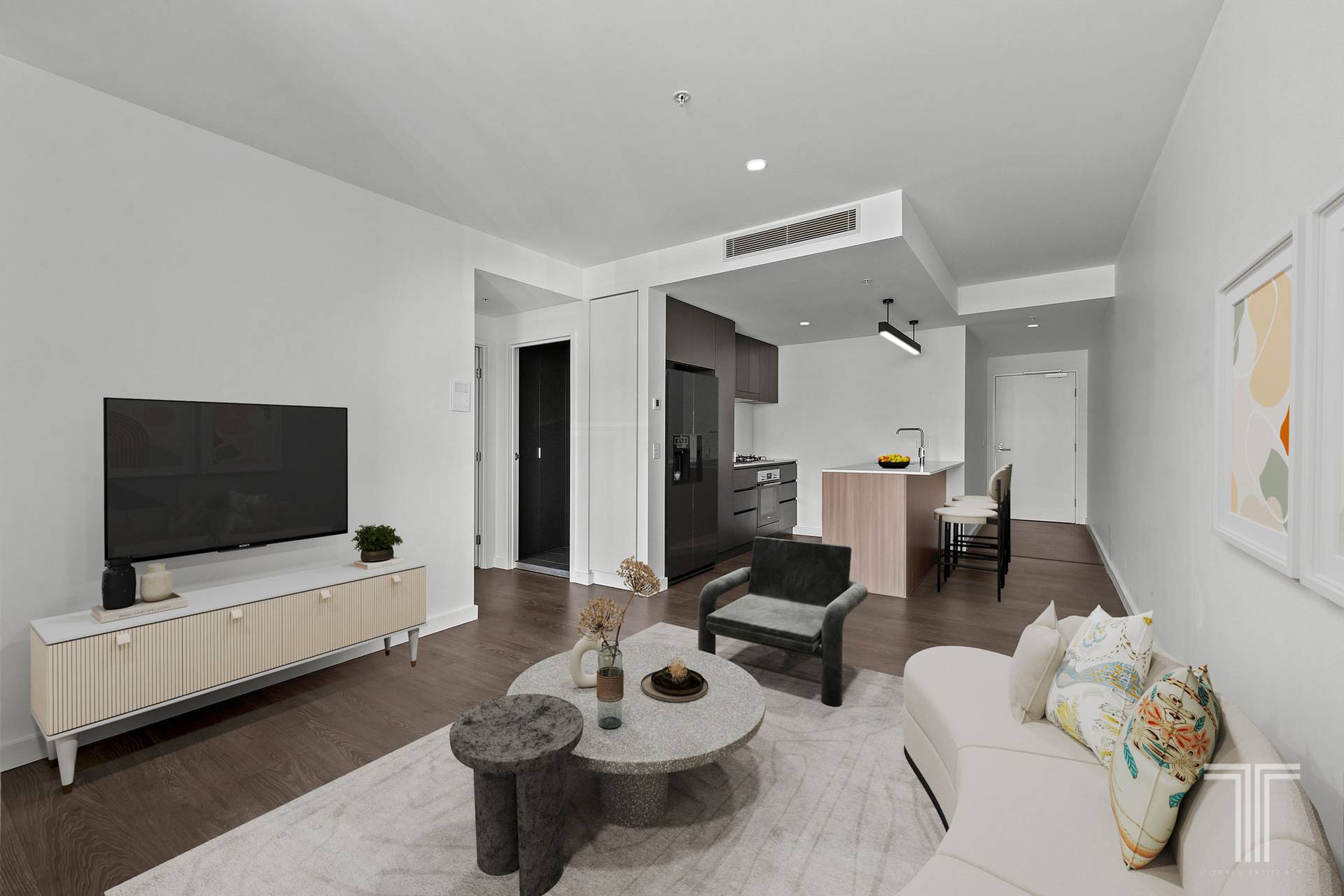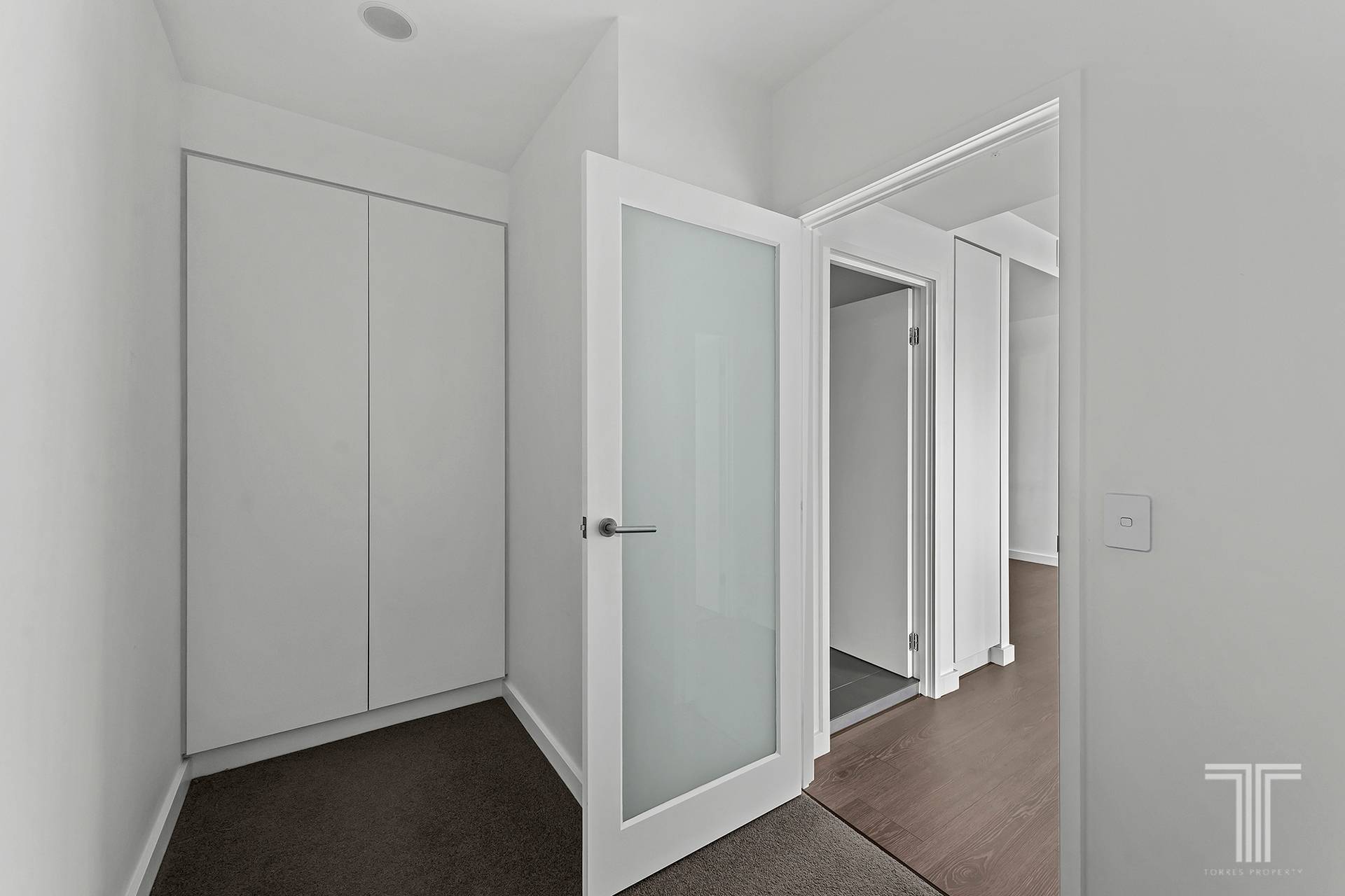 Stone benchtops, a gas cooktop and a dishwasher adorn the stylish kitchen, and the entire apartment benefits from ducted air-conditioning. Offering an executive design, storage features within the enclosed study and spacious bedroom, the modern bathroom houses a concealed laundry, and there is a secure car space.