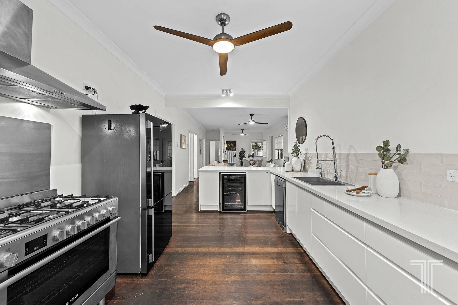 The open-plan living and dining area is complemented with hardwood timber floors, and timber framed windows, whilst seamlessly connecting to a stylish, light-filled kitchen equipped with Caesar-stone bench-tops, a chef-sized stainless-steel oven, a breakfast bar, sleek cabinetry, a walk-in pantry, a built-in bar fridge, and ample space for a large side-by-side refrigerator.