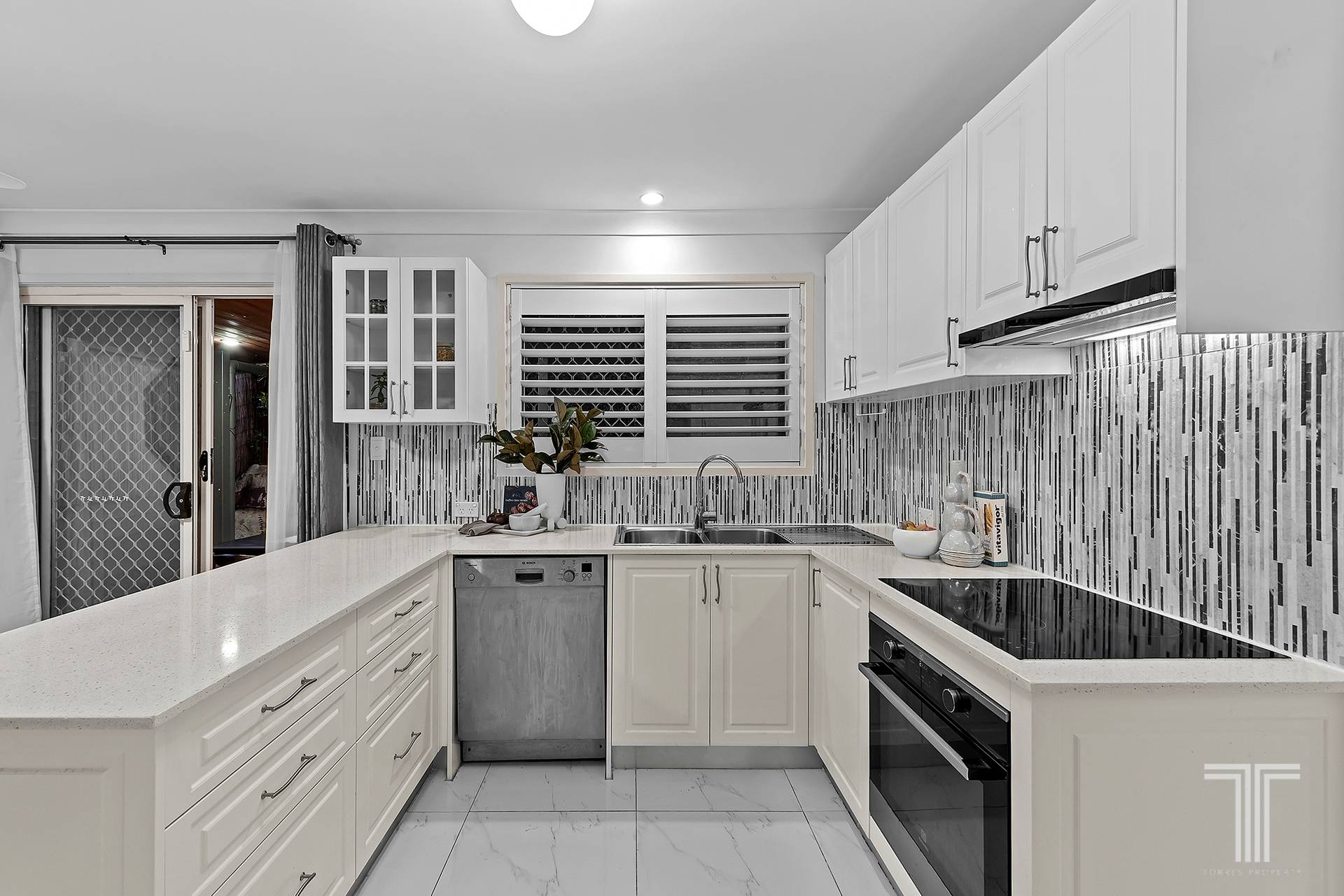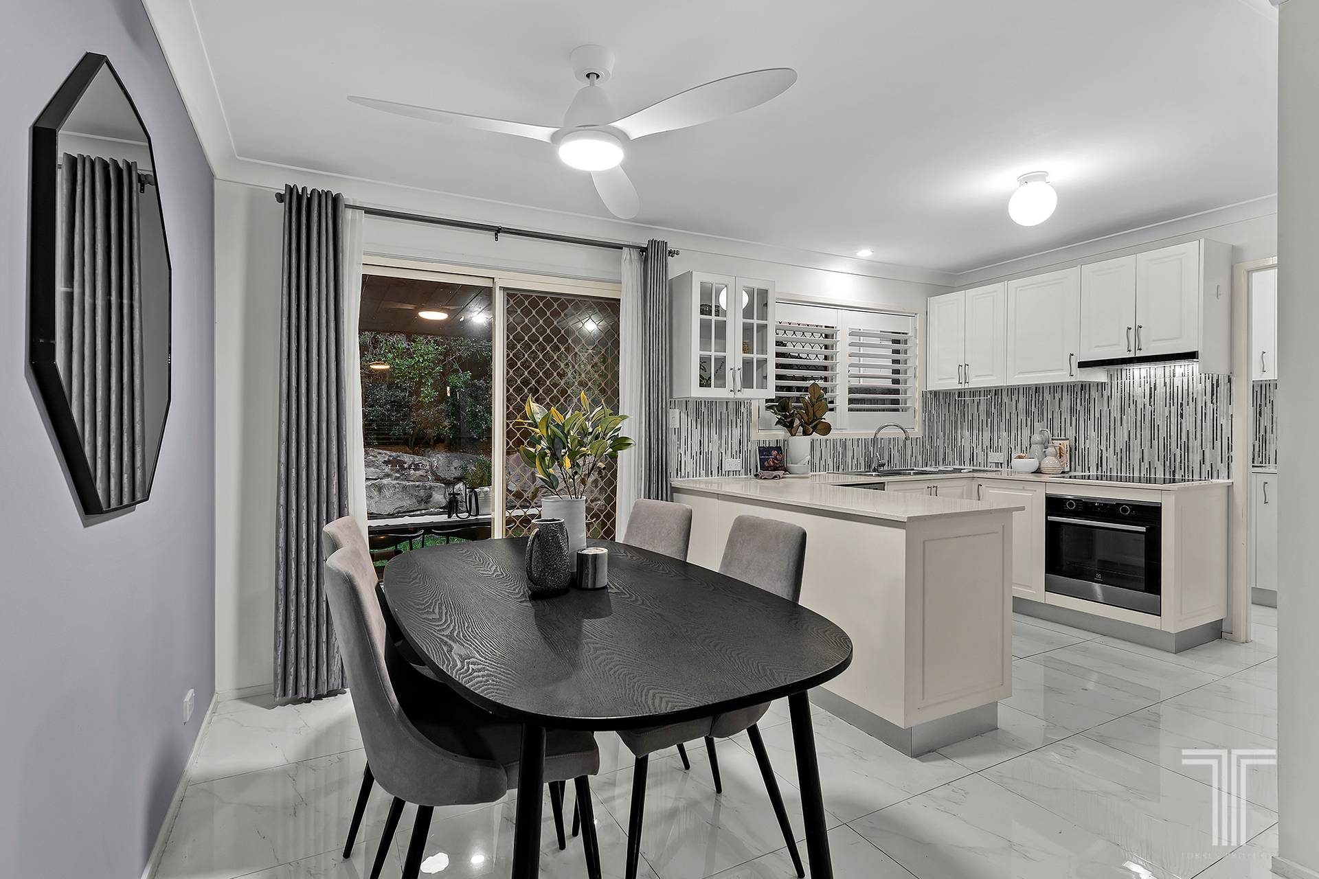 Plantation shutters and ceiling fans adorn the interiors, which welcome you with an open living and dining area kept cool with tiled flooring and air-conditioning. The adjoining kitchen has been updated to ensure easy cooking and features sleek stone benchtops, modern appliances, great storage, and laundry access.