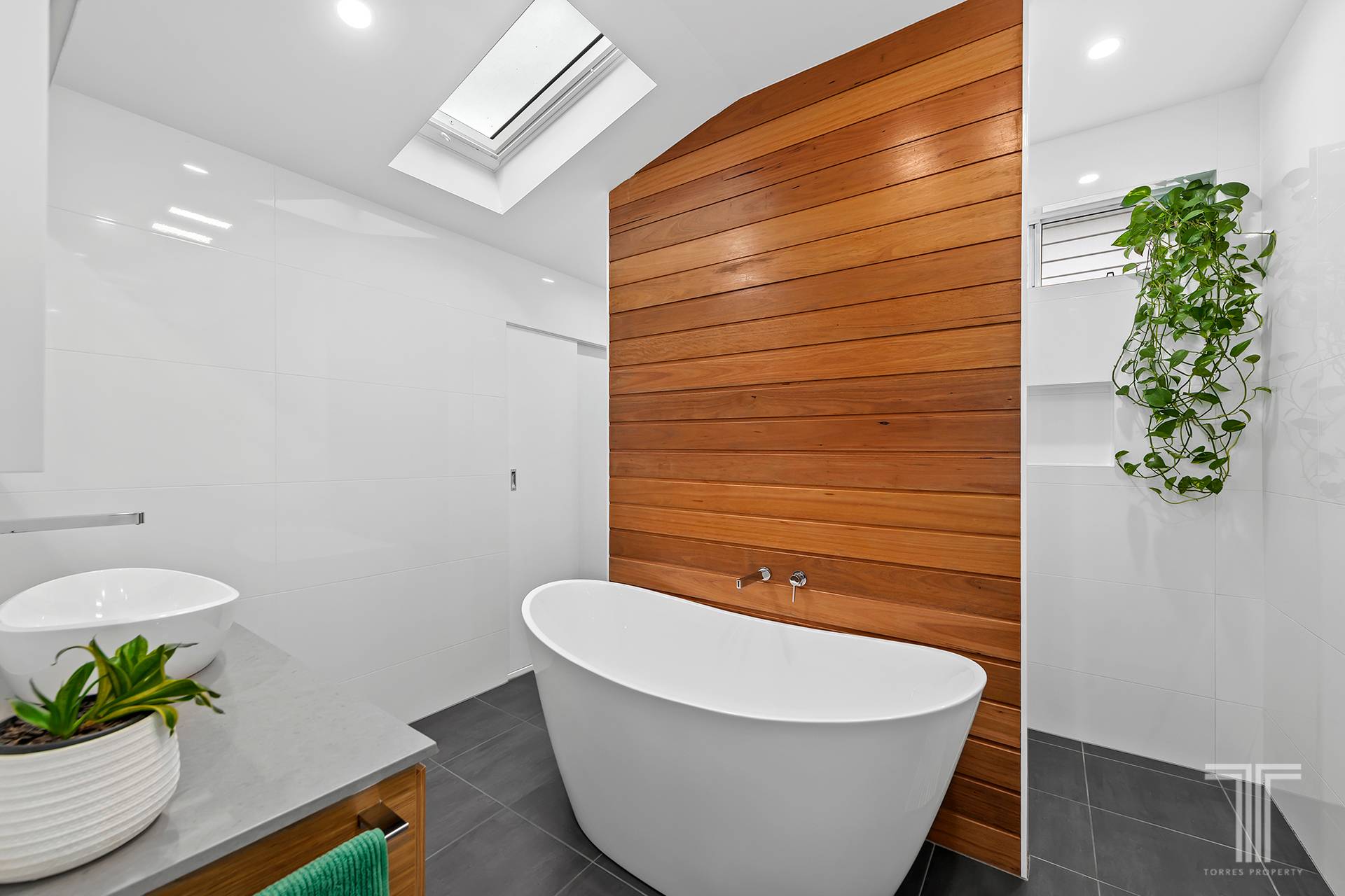 Two bedrooms feature within the home, including one with a walk-in robe. The spacious bathroom boasts a modern design and a touch of luxury with a freestanding bathtub and a large floating stonetop vanity. The laundry features downstairs alongside a sizeable storage room, and the property includes off-street parking.