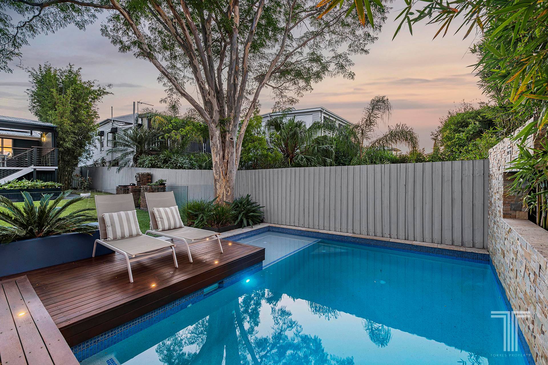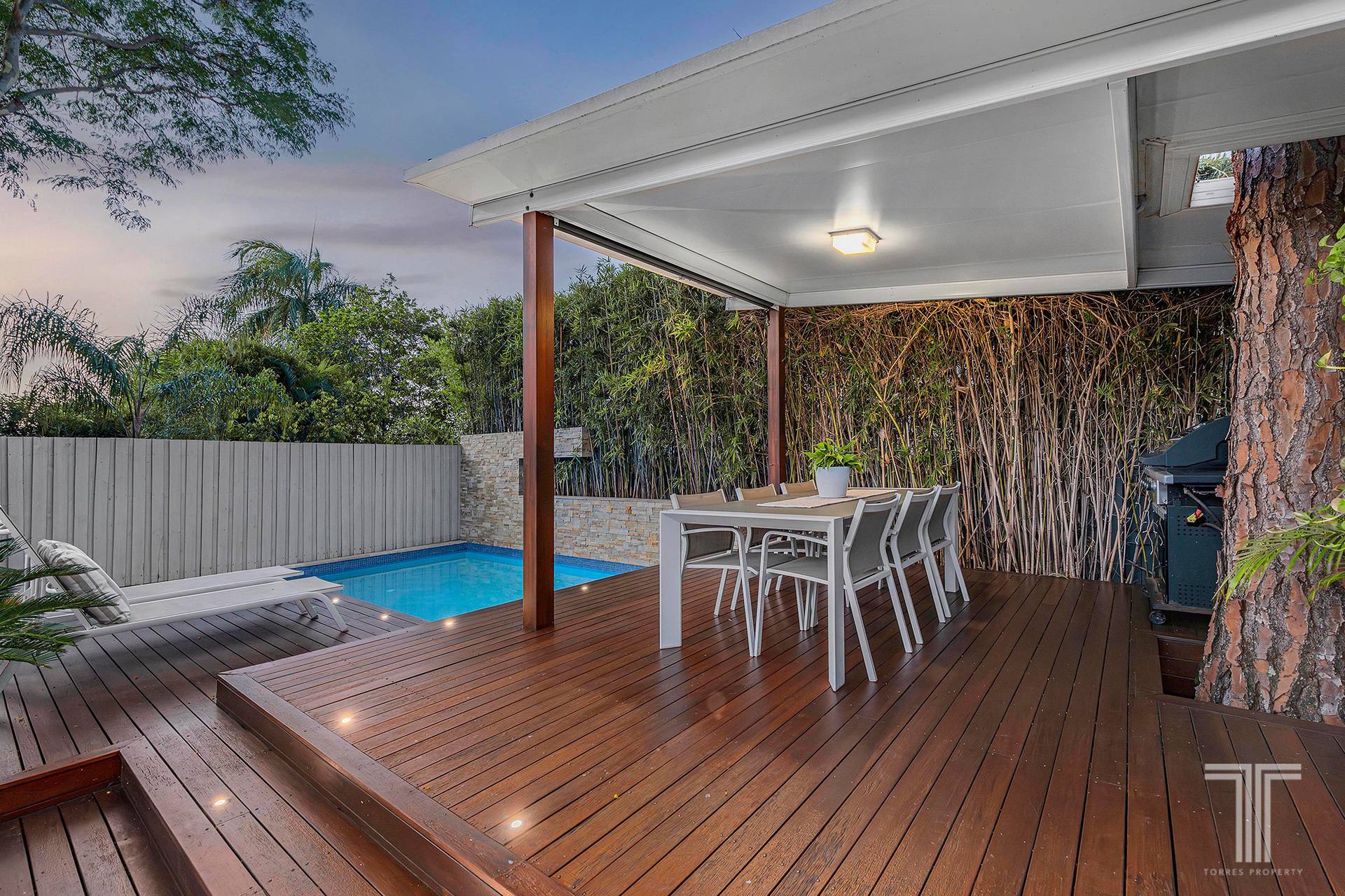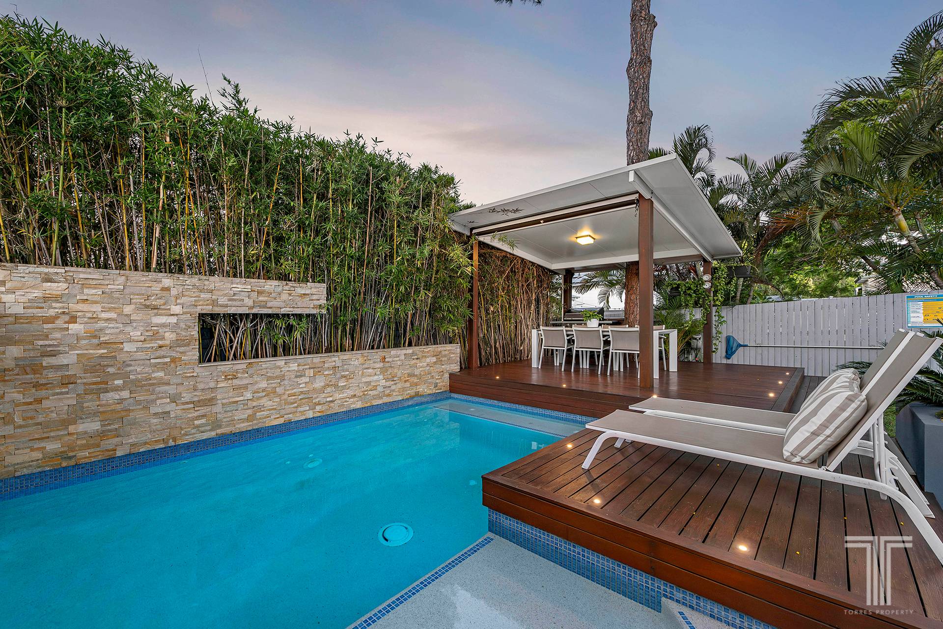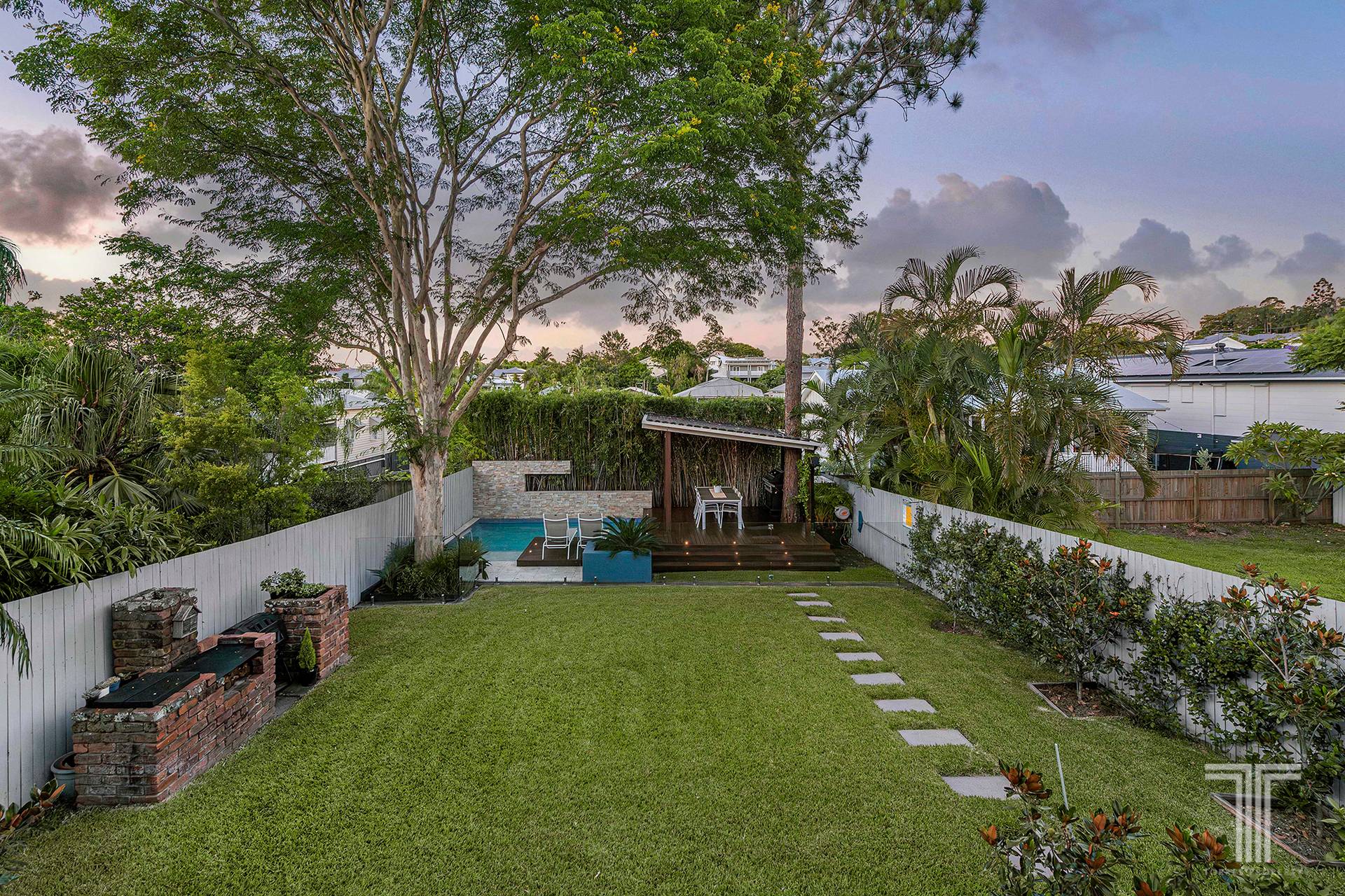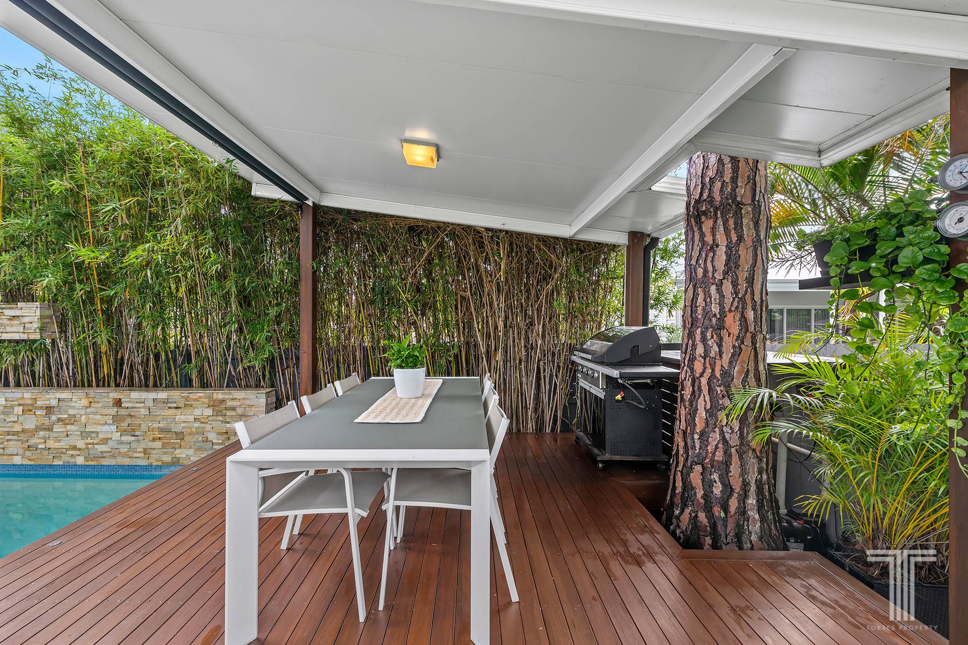 The rear deck forms a tropical retreat screened by timber and bamboo for complete privacy, and the manicured lawns extend over the north-facing backyard where a gazebo and swimming pool loom, creating a scenic escape for relaxing swims, quiet moments, BBQs and drinks by the water.