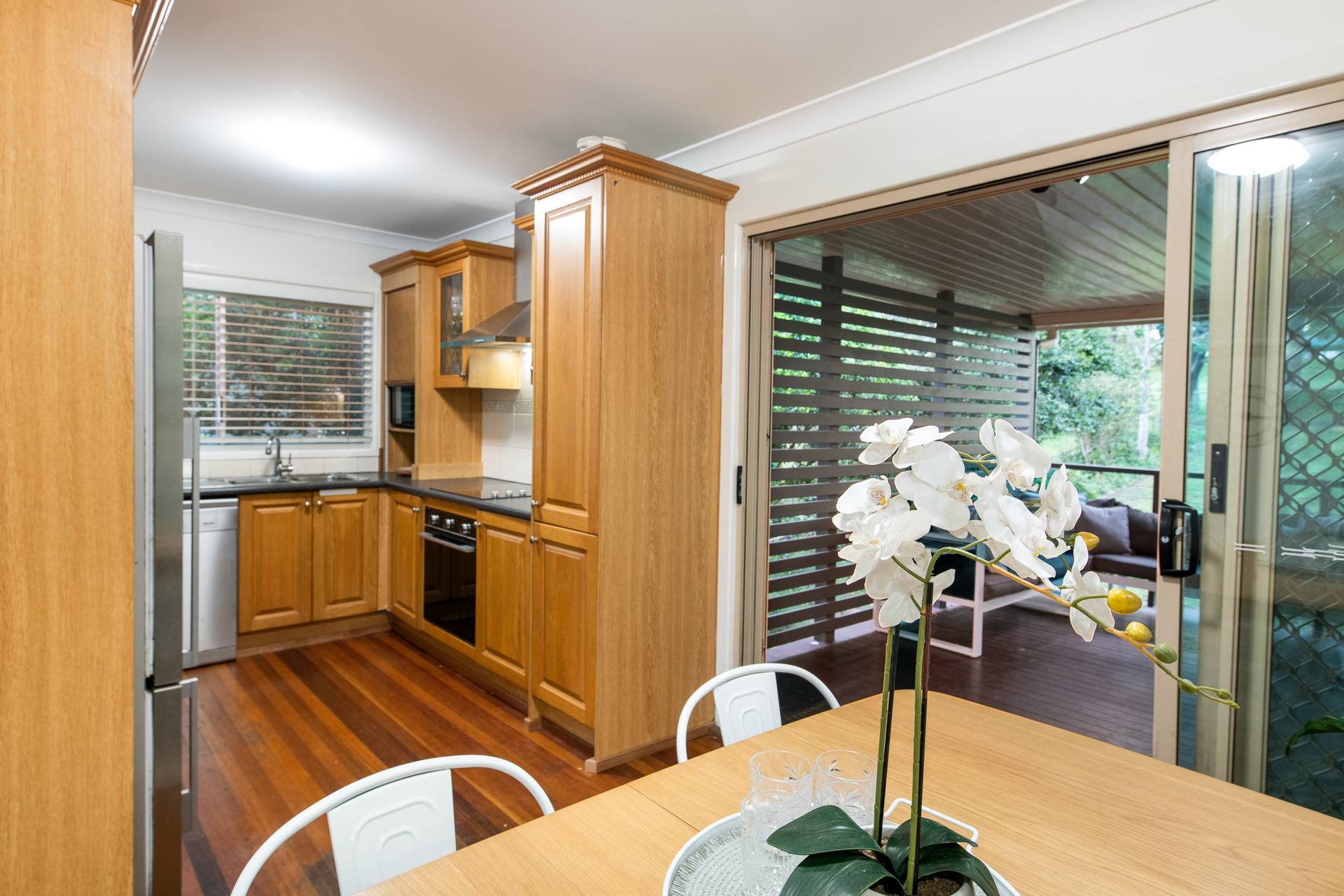 The living and dining areas are open, inviting and air-conditioned, and the well-appointed kitchen reveals extensive timber cabinetry and modern appliances, including a stainless steel dishwasher.