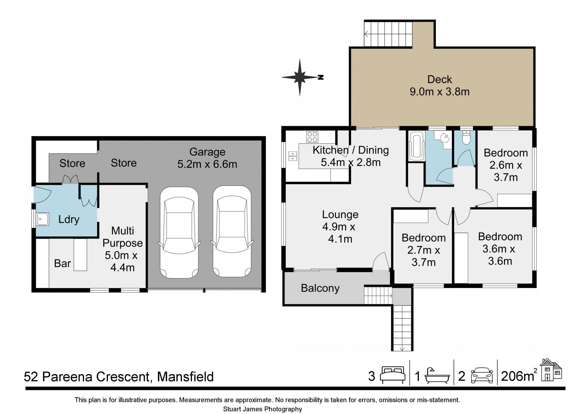 Three bedrooms and one bathroom finalise the upper floor, and the lower level offers secluded space with a study and bar alongside the lock-up two-car garage.