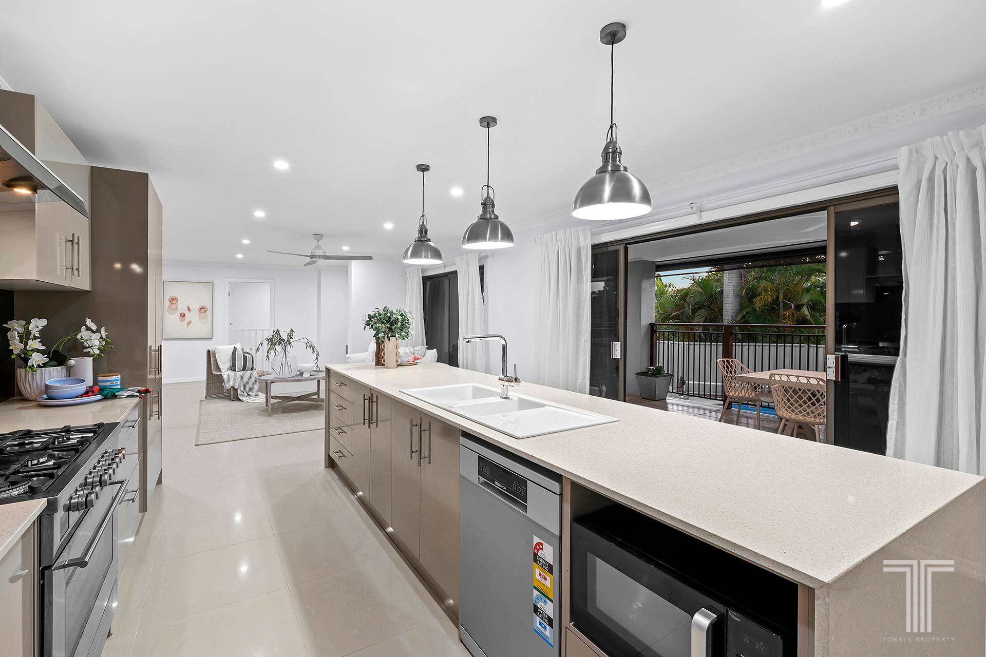 Circulated with air-conditioning and ceiling fans, the family room and open living and dining areas form peaceful retreats for family fun, TV time and marvellous meals. Stretching across the floor plan to the kitchen with stainless steel appliances, a gas cooktop and an oversized waterfall stone island, this central space allows for casual dining, socialising, and supervising kids' homework while cooking.
