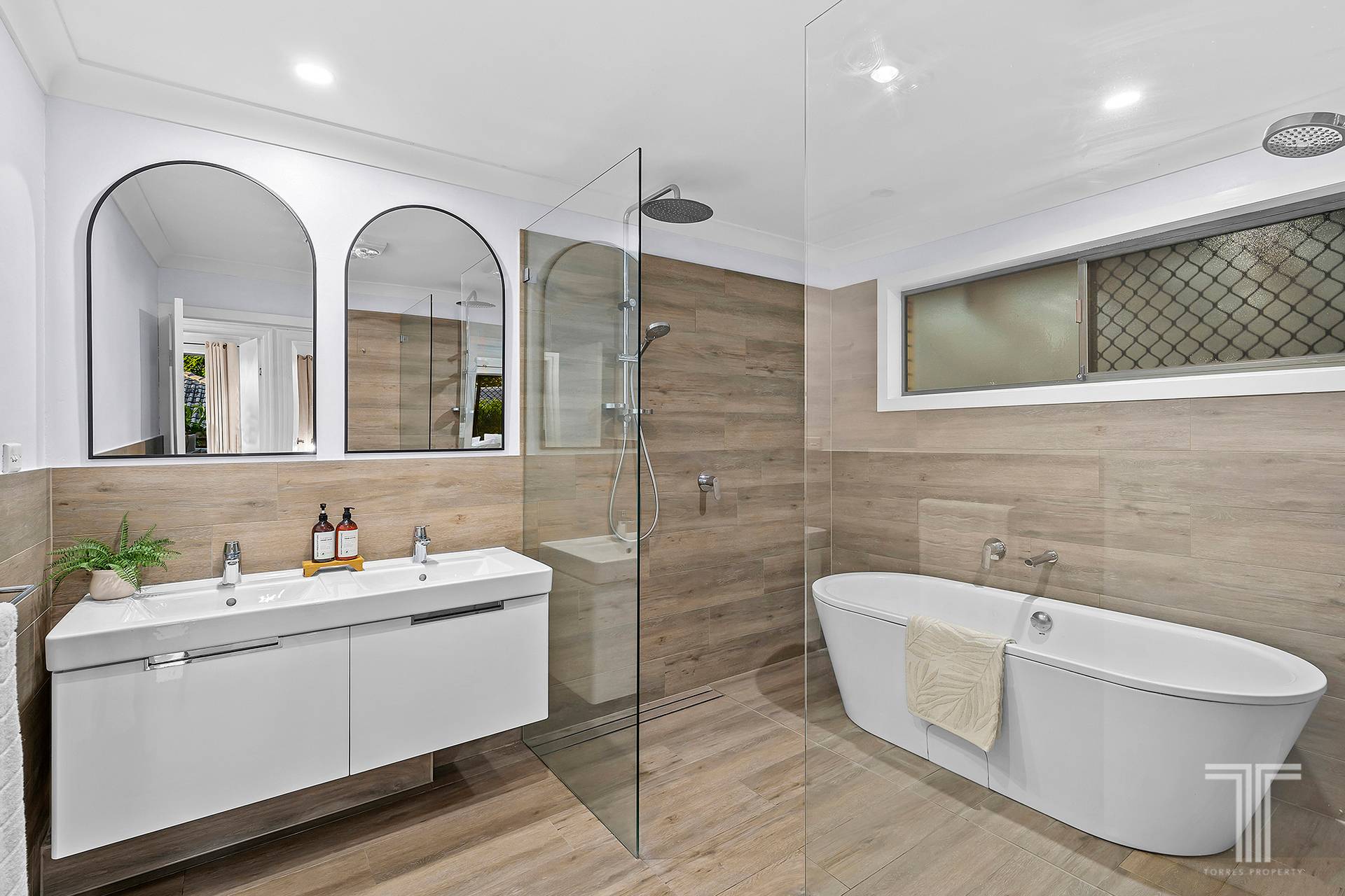 The five generous bedrooms include a master suite with a porch, huge walk-in robe and stylish ensuite. A second bathroom services the rest of the home with dual vanities, a walk-in rainfall shower, a relaxing bathtub, a separate toilet and an adjacent laundry. There is great storage in the house, and parking is provided via a double carport.