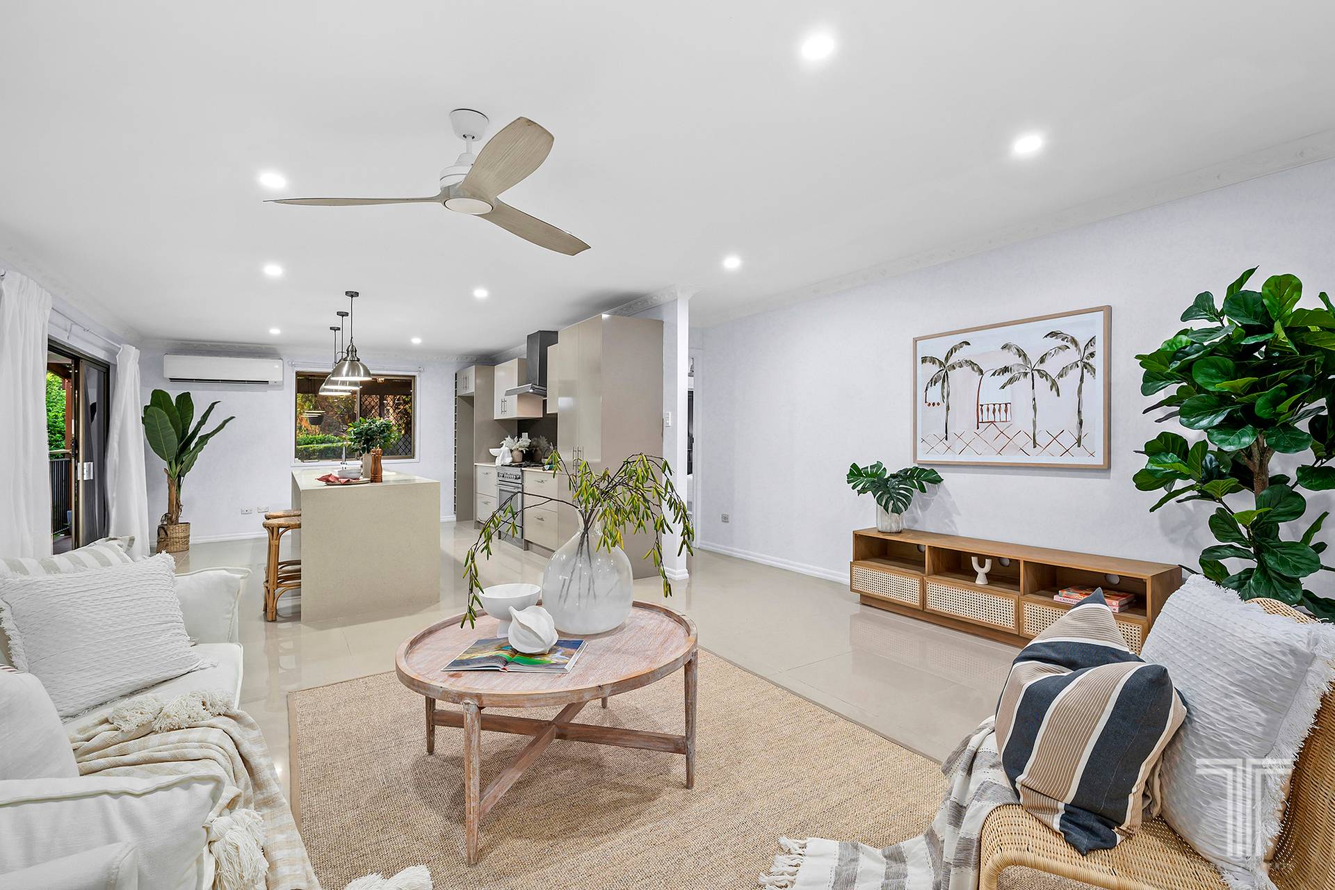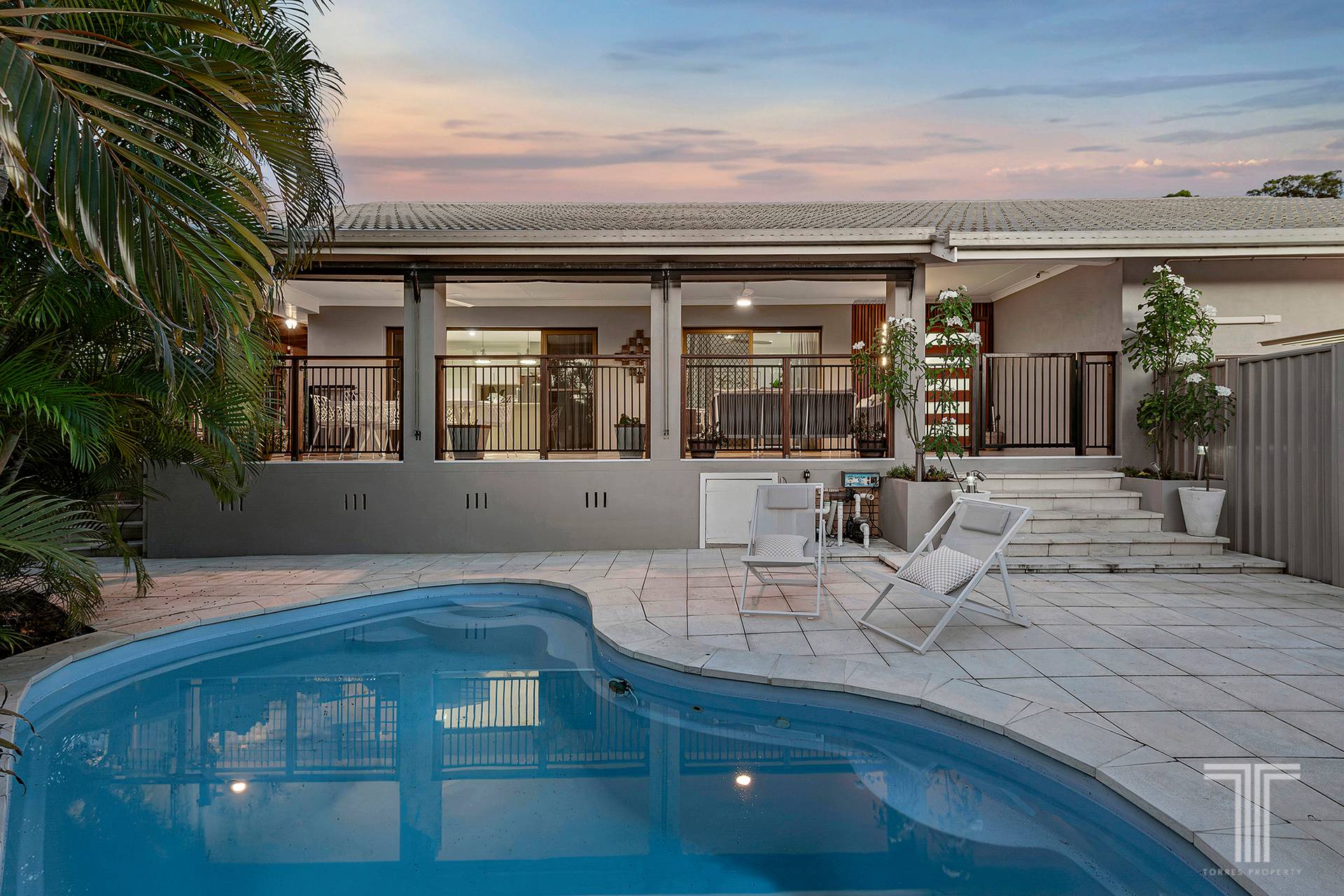 Nestled atop a fenced 758sqm parcel with multiple living zones and a poolside haven, the house invites relaxed tranquillity outdoors and comforting elegance inside, with brand-new carpet and stylish tiles set aglow by LED downlights.