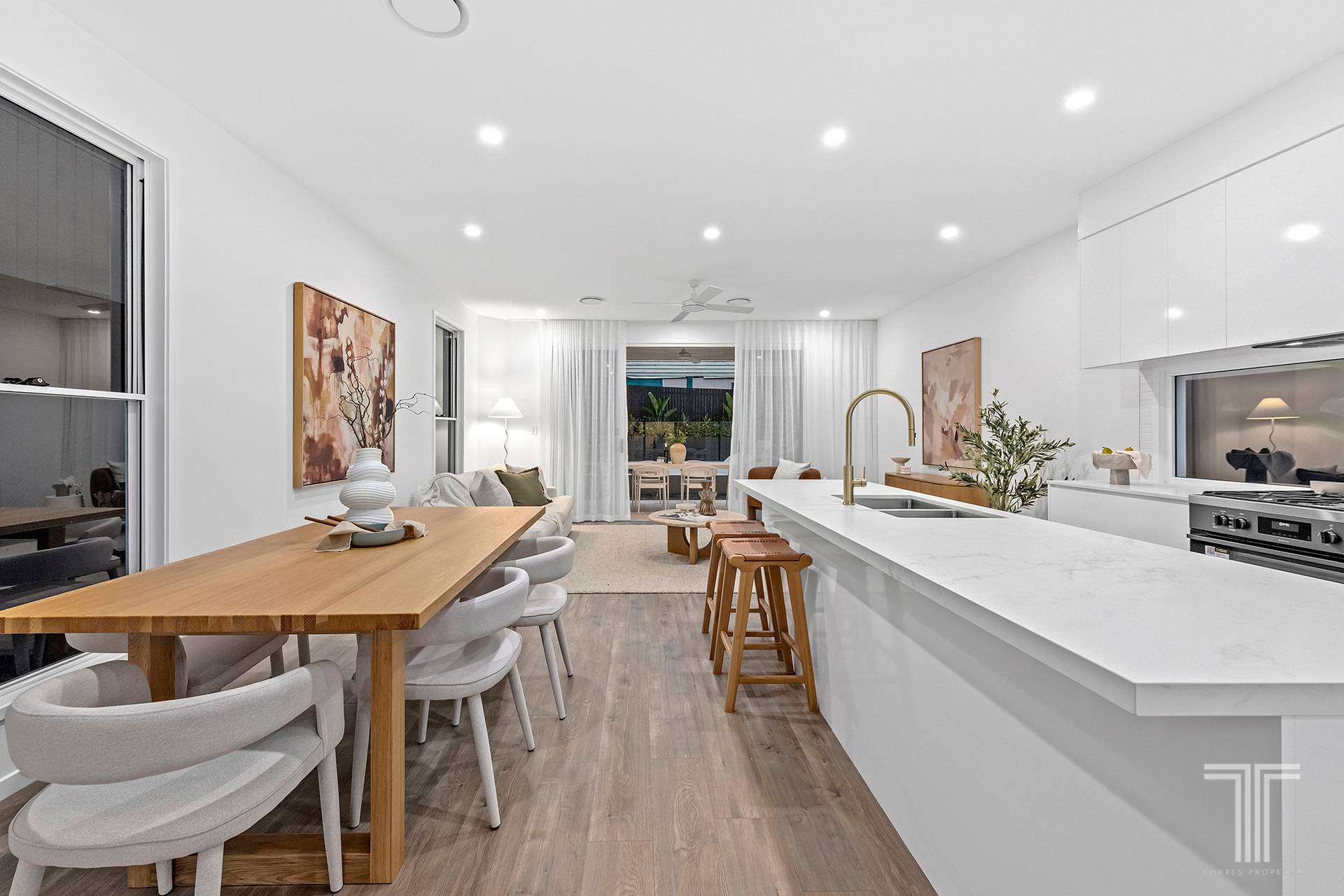 Guiding you down the hall, the living and dining area beckons you with an open layout and a masterful kitchen configured around a 40mm island, walk-in pantry and premium appliances. Transitioning seamlessly to the covered patio and private salt mineral pool, the layout blurs indoor and outdoor boundaries for lounging and year-round entertaining.