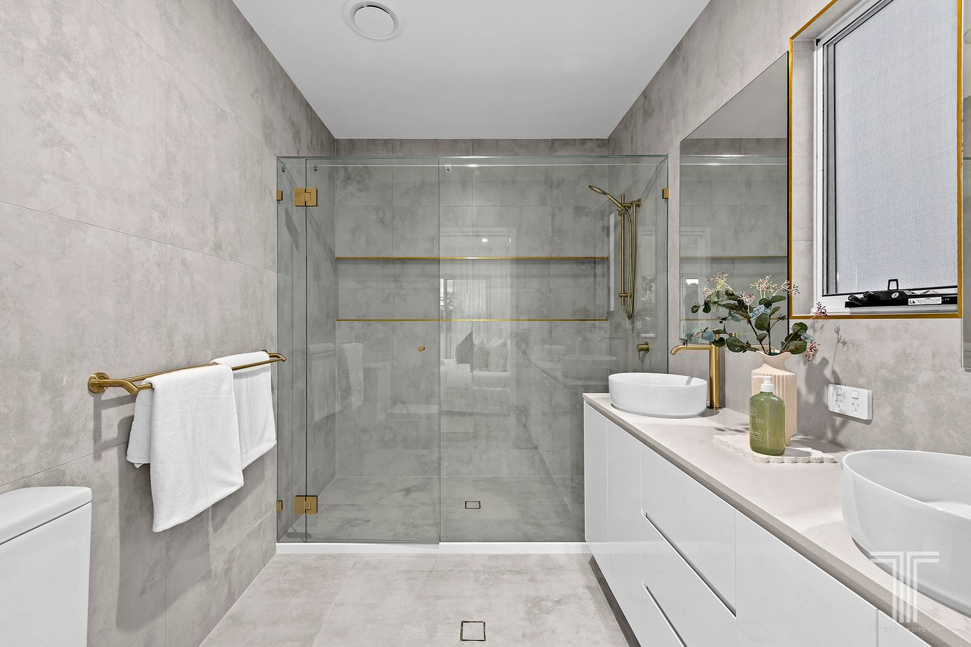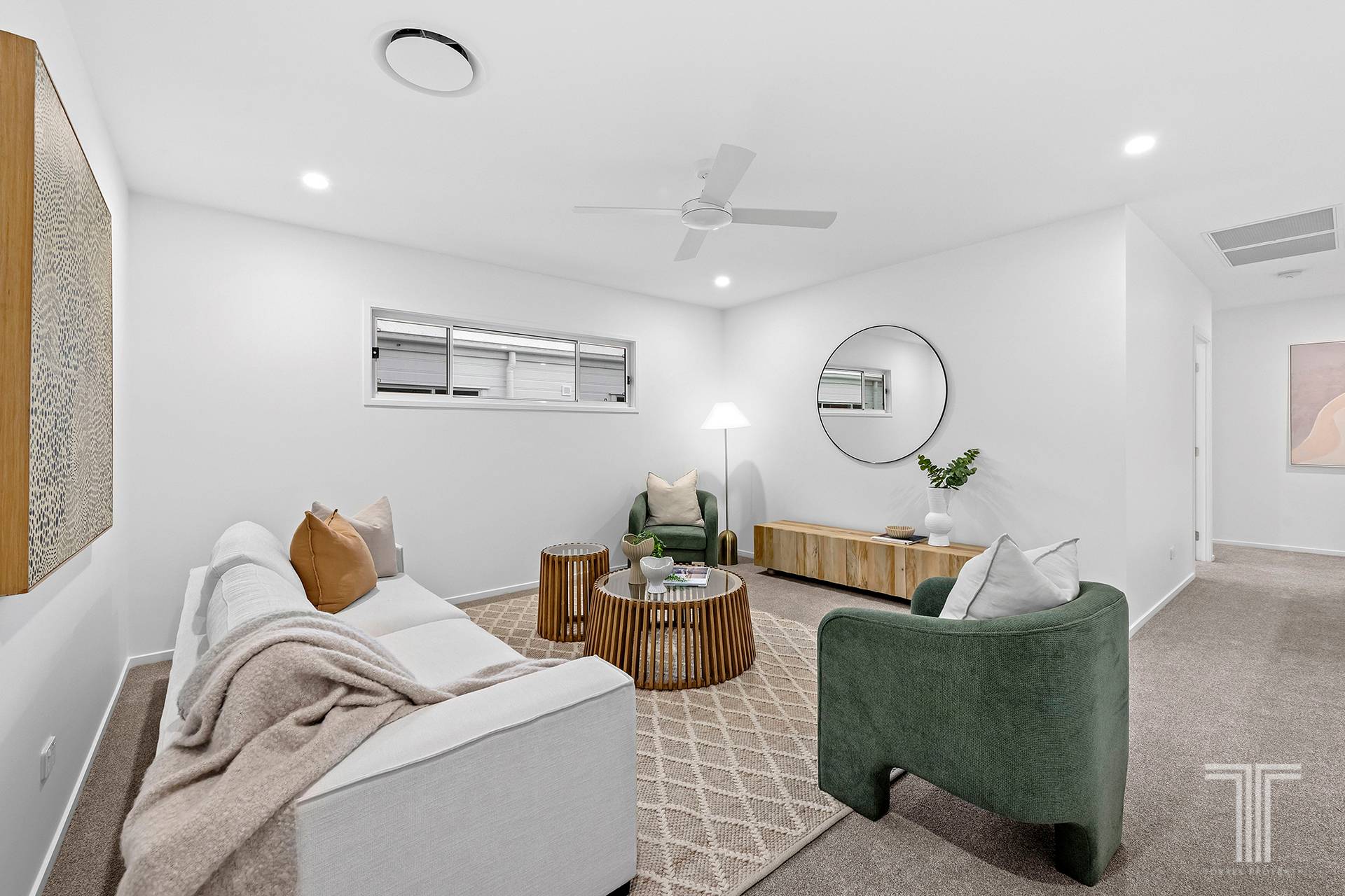 Built by OJ Pippin Homes and modelled off their Willow Series design, the house embraces a rejuvenating atmosphere, executive practicality and tailored finishes with square set cornices, sheer linen curtains, quartz benchtops, gold brushed fixtures, and smart home control.