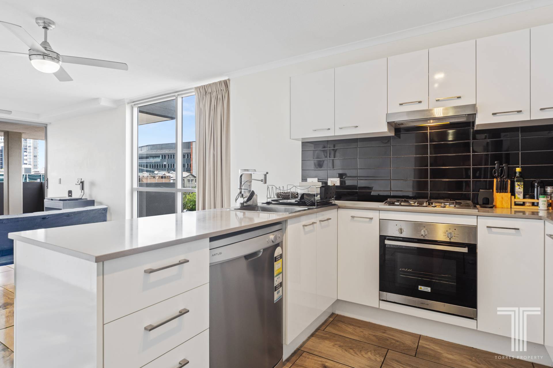 The gourmet kitchen is equipped with modern stainless steel appliances, a breakfast bar with stone countertops, a dishwasher, and plenty of storage space. The open-plan living and dining area, complete with timber-look tiles, ceiling fans, and air conditioning, flows out onto a large entertainer's balcony with stunning urban views. The complex also offers a spectacular rooftop terrace with an outdoor TV, dining and BBQ facilities, and breathtaking views of the city skyline.