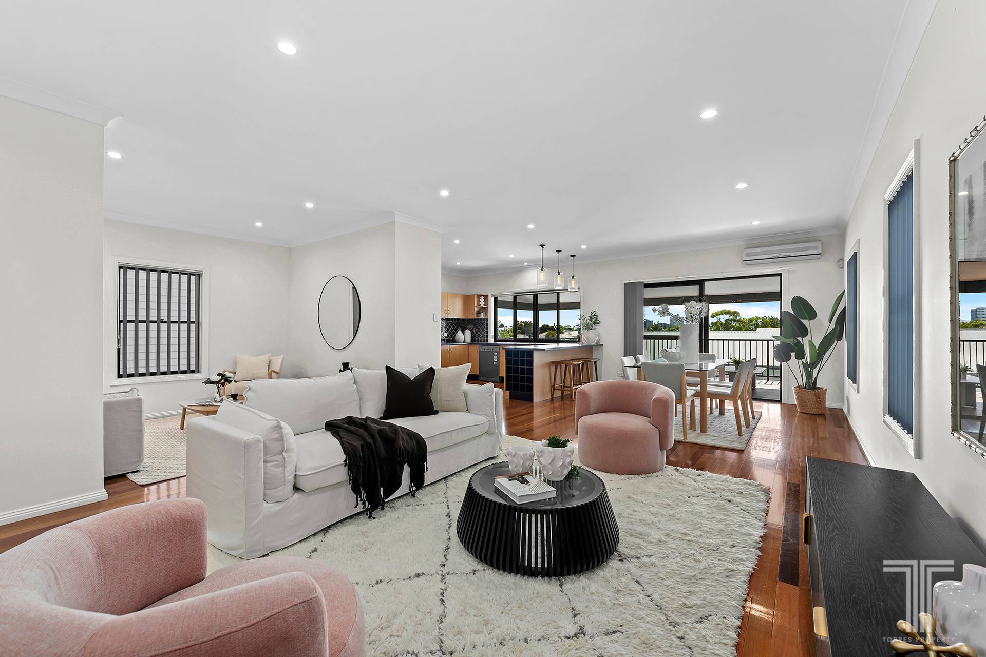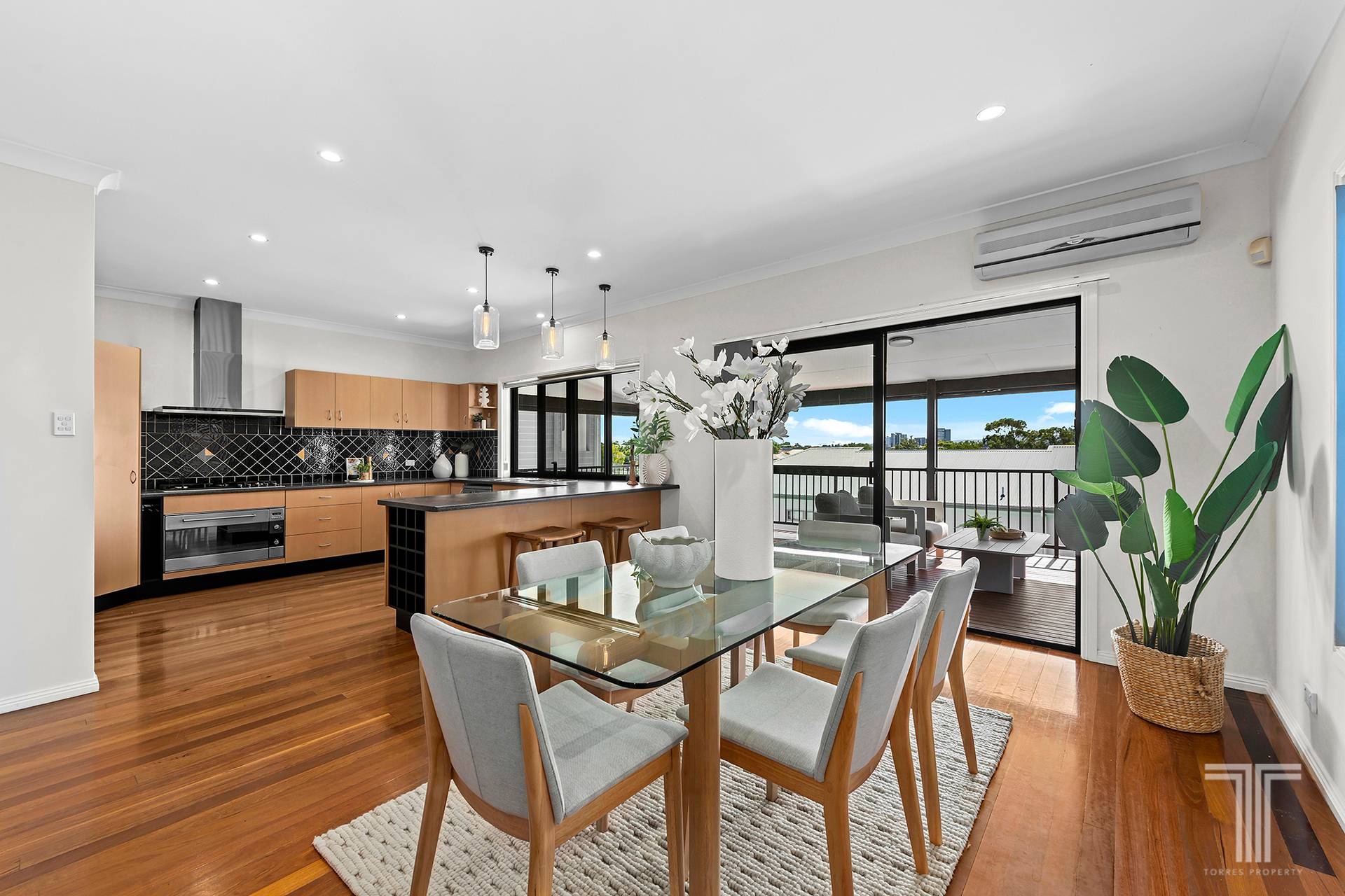 The upper floor unfolds to a family room, lounge and living/dining area, creating a fluid layout that strikes a perfect balance between connection and distinction. Immersed in the open interiors and connecting to the entertainer's balcony and city views, the spacious kitchen has been thoughtfully configured with extensive bench space, a breakfast bar, ample storage, stainless steel appliances, and a plumbed fridge space.