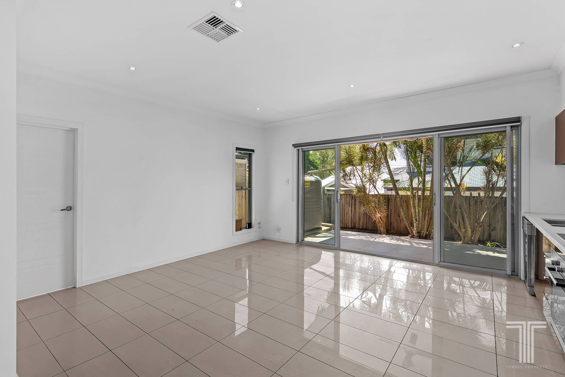 Located in a boutique complex of just seven, this residence offers a spacious design with seamless indoor-outdoor flow, catering to those who value both relaxation and entertainment. The open-plan living and dining area is enhanced by stylish tiled flooring, while the galley-style kitchen features stainless steel appliances and ample storage. Glass sliding doors extend this space to a covered patio surrounded by tropical palm trees, creating a tranquil retreat for entertaining or unwinding.