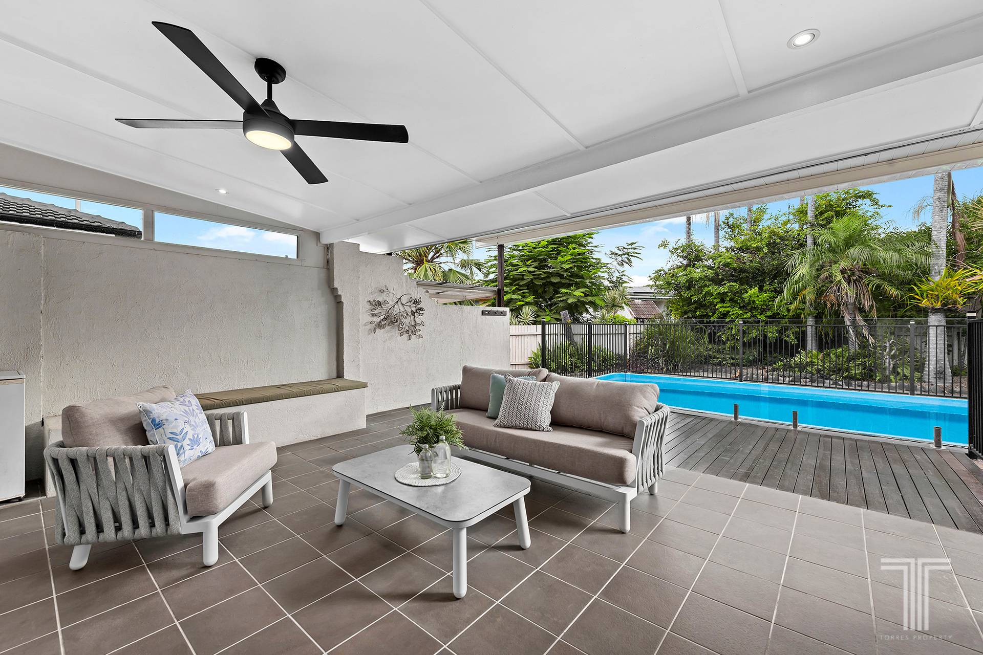 With room for covered entertaining at the front and rear, you can chase the sun and shade as you host guests, admire the mature gardens and tropical palms surrounding the home, and cool off with a swim on warm summer days.