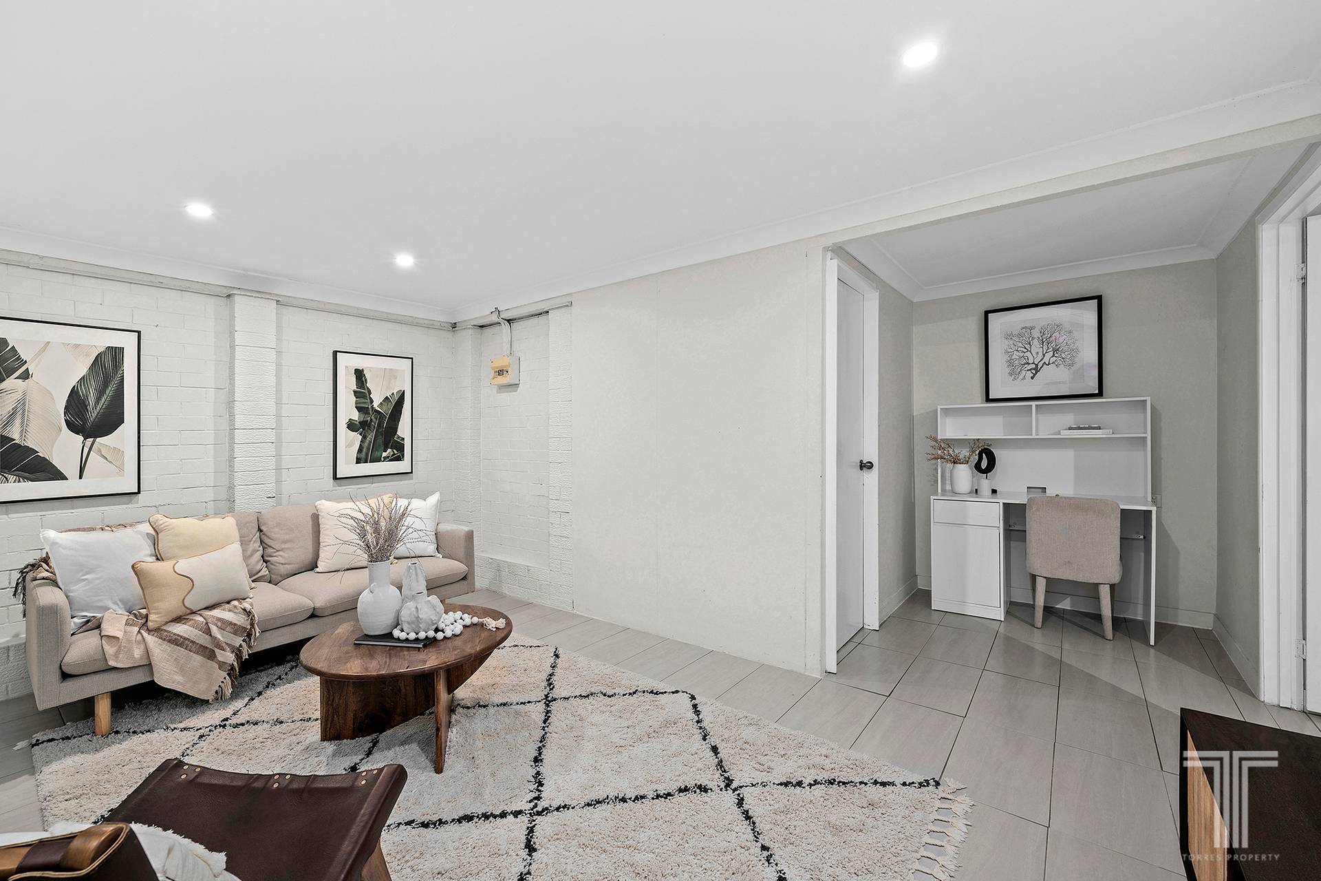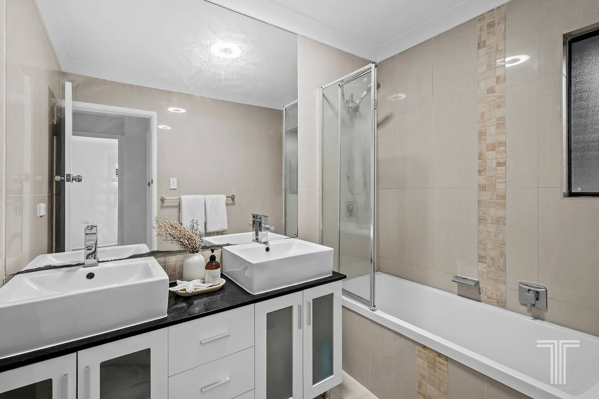 Three bedrooms are upstairs, and a multipurpose room downstairs is ideal for teenagers, guests or a workspace. Two bathrooms service the home, including a family bathroom with dual vanities and a bathtub, and the laundry is located in the lock-up double garage.