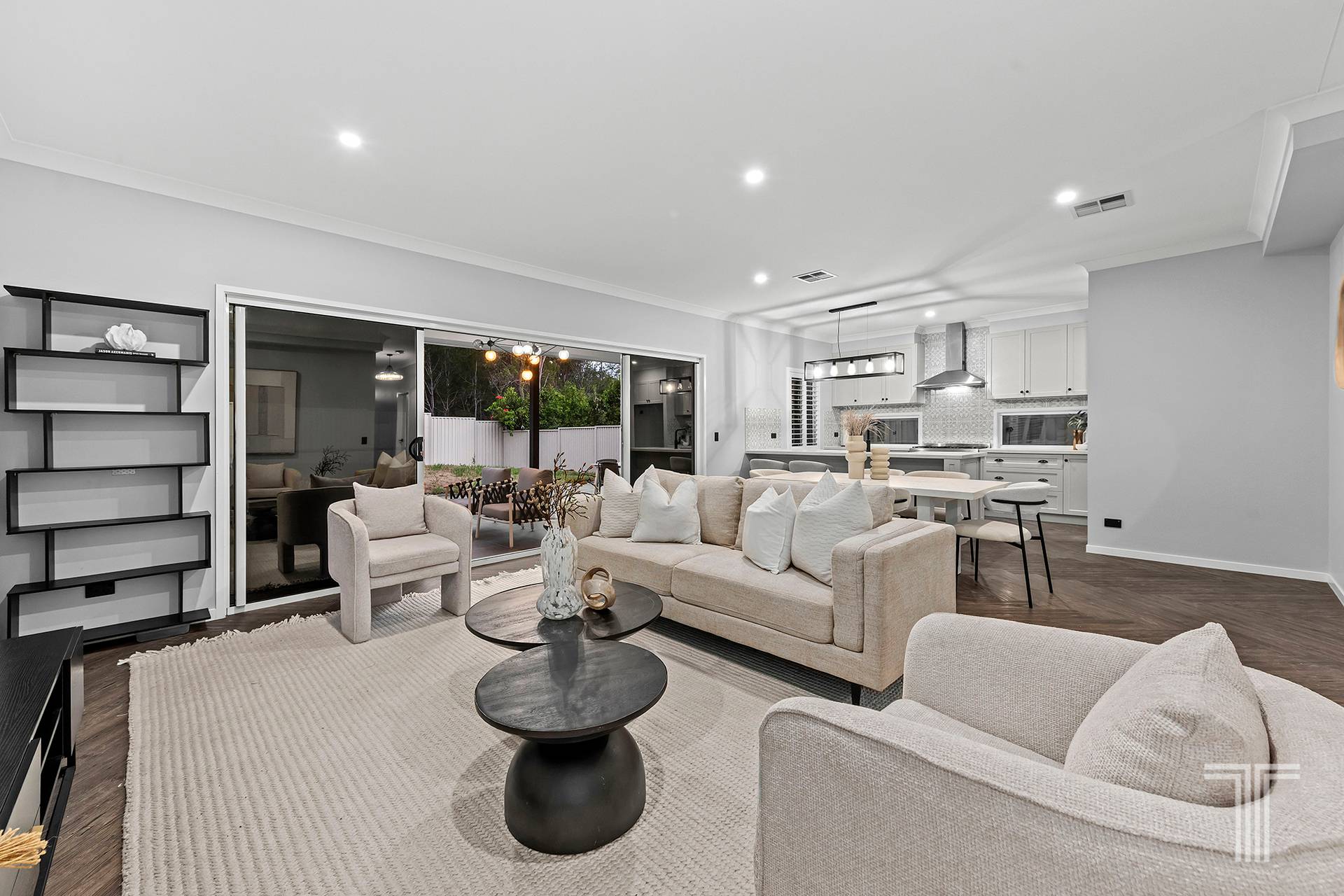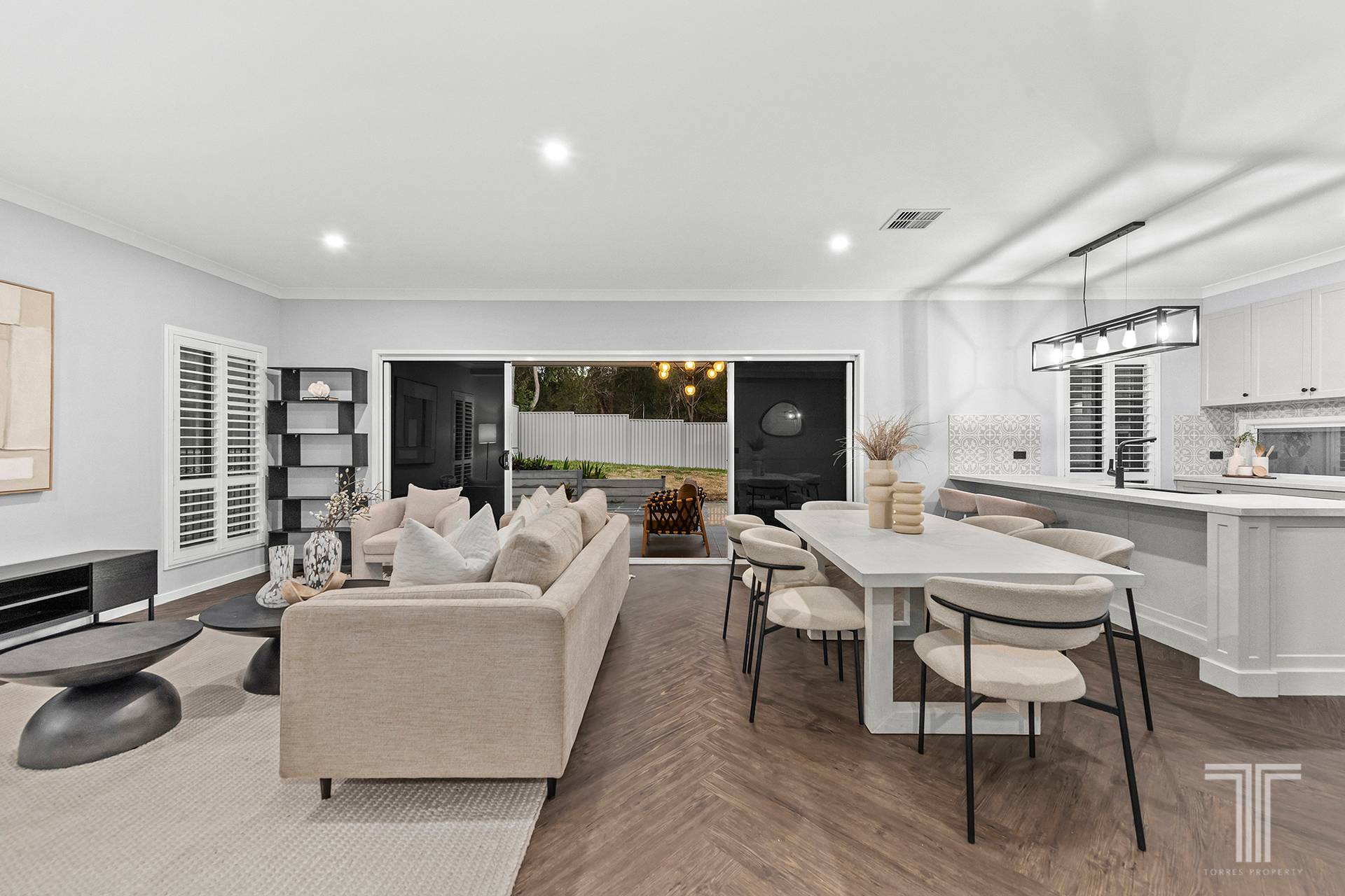 A separate family room and study provide distinct zones off this open layout, and the fluid floor plan extends outdoors to a covered alfresco area, built-in BBQ and spacious backyard, forming an oasis for entertaining guests and fun in the sunshine kicking the footy with the kids.