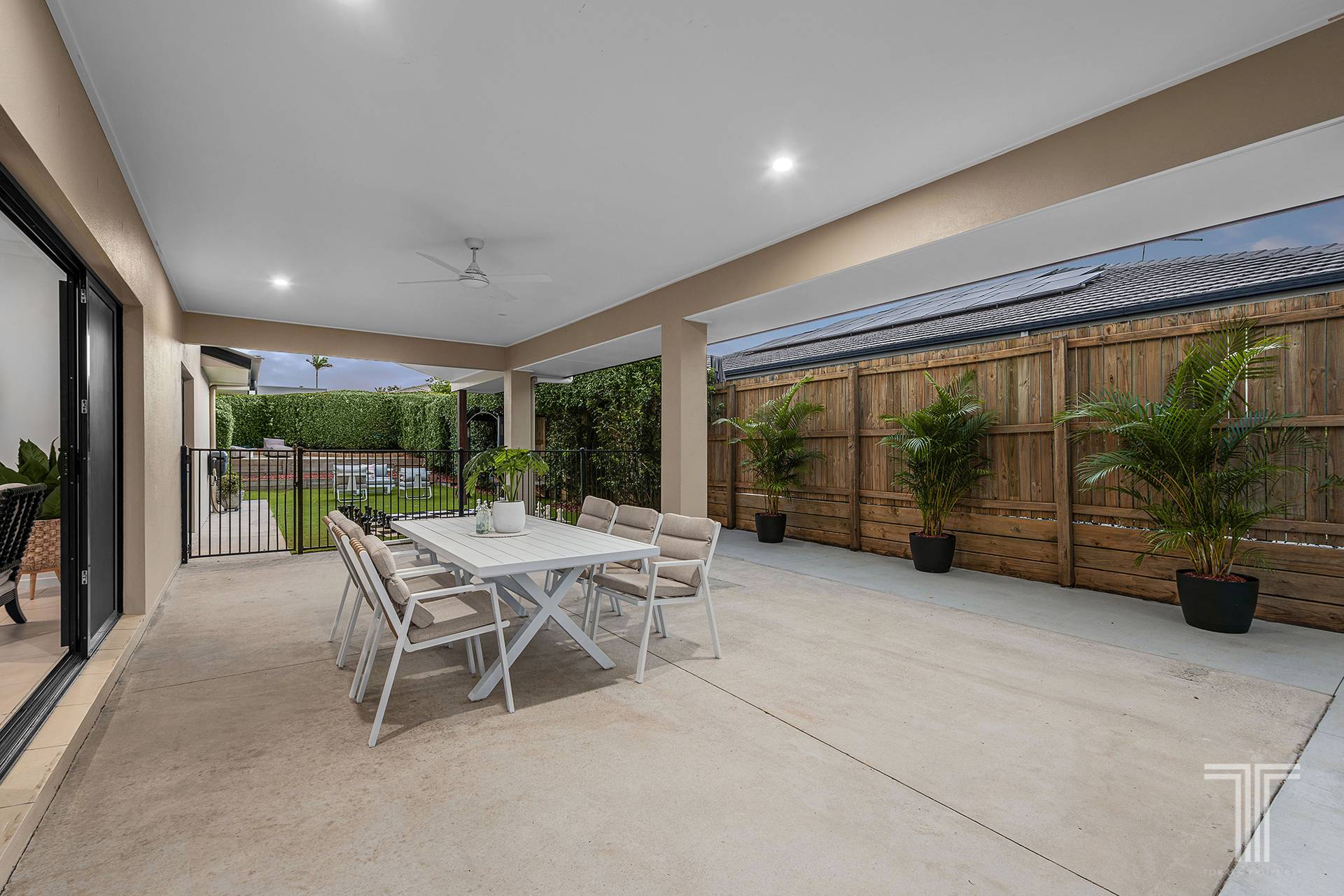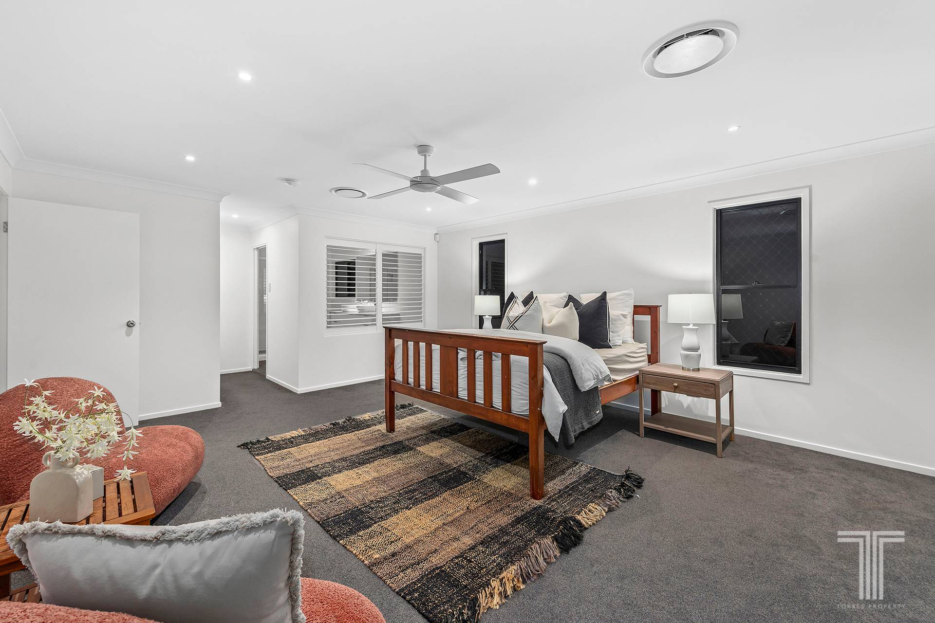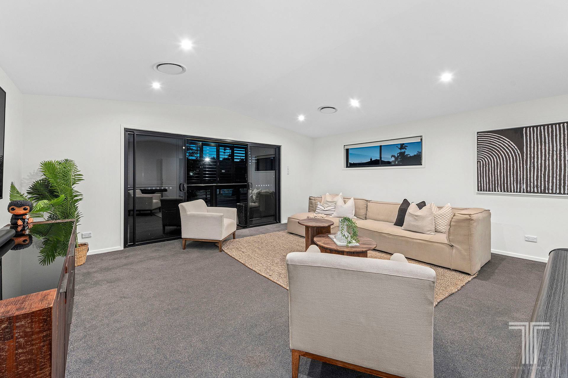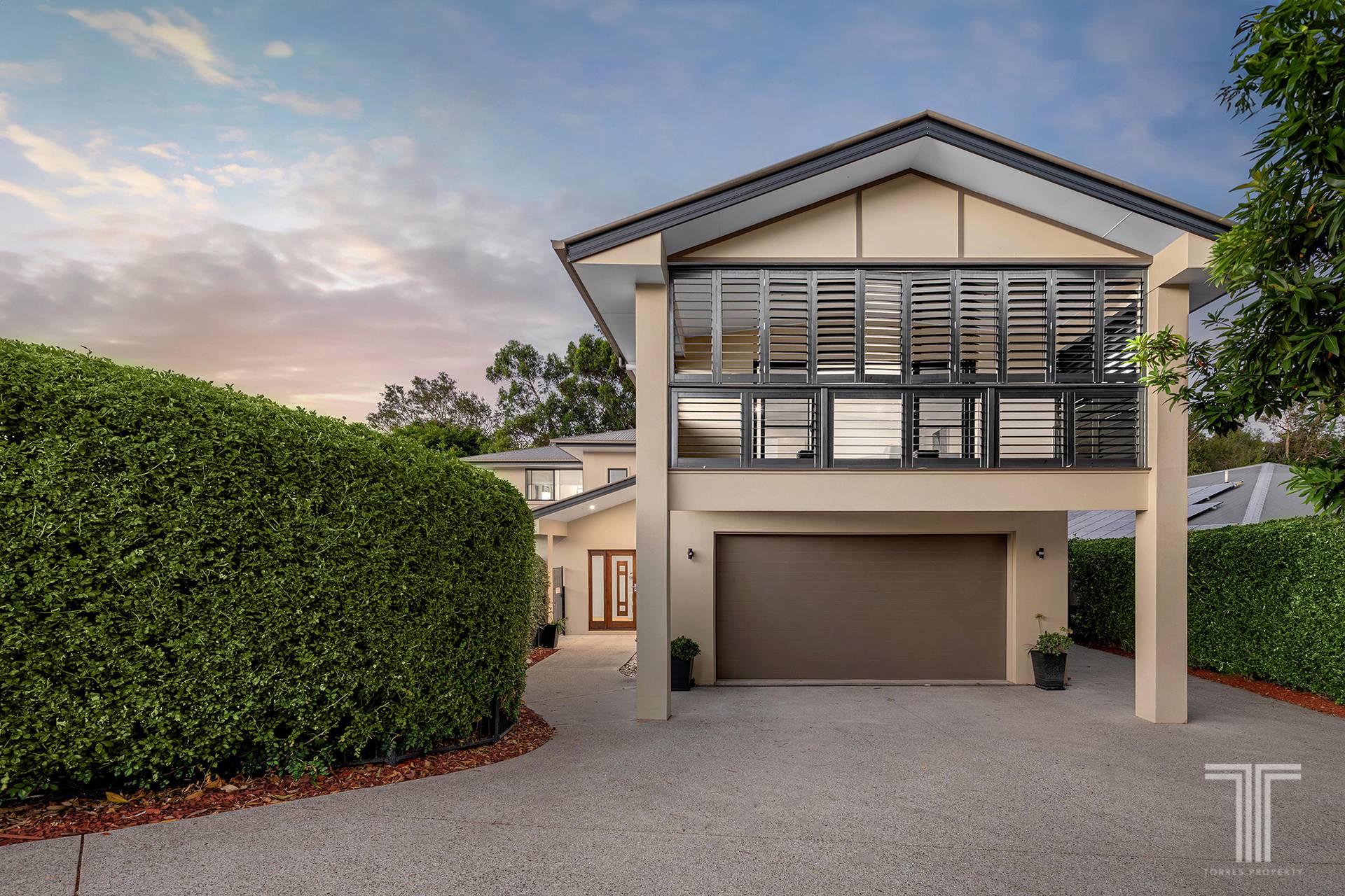 Surrounded by beautiful scenery and bushland in a quiet pocket of Wakerley, this six-bedroom house forms a large-scale family entertainer at the end of a cul-de-sac.