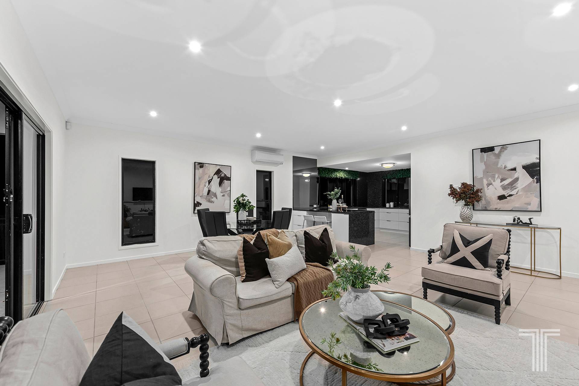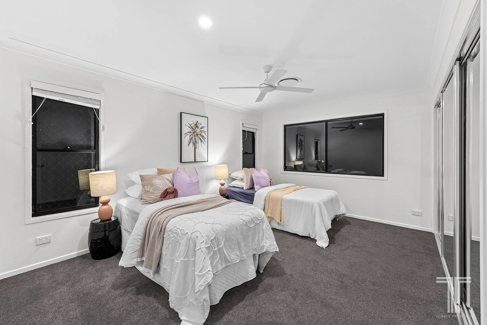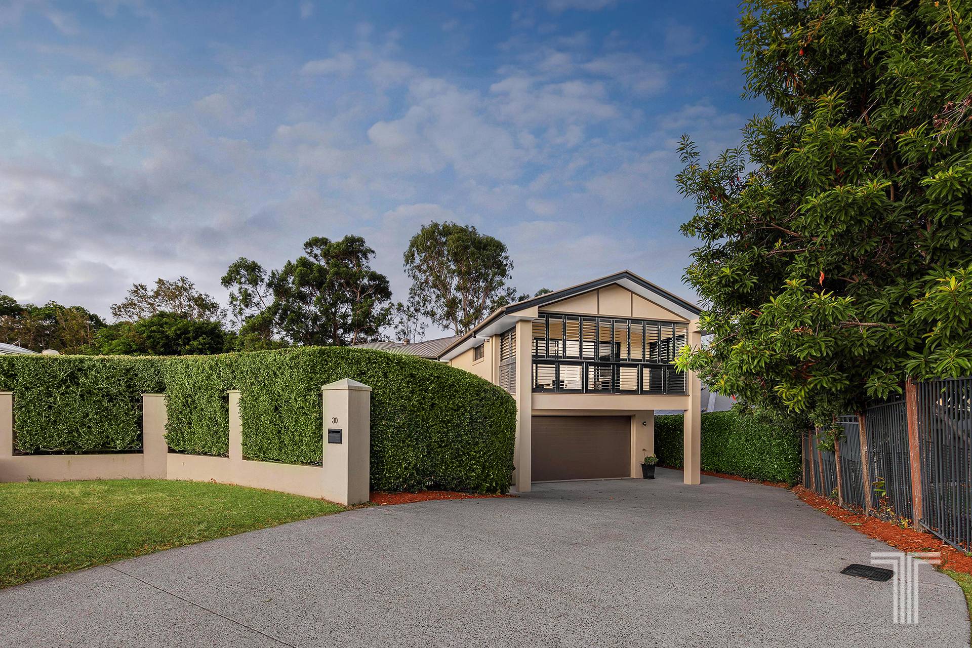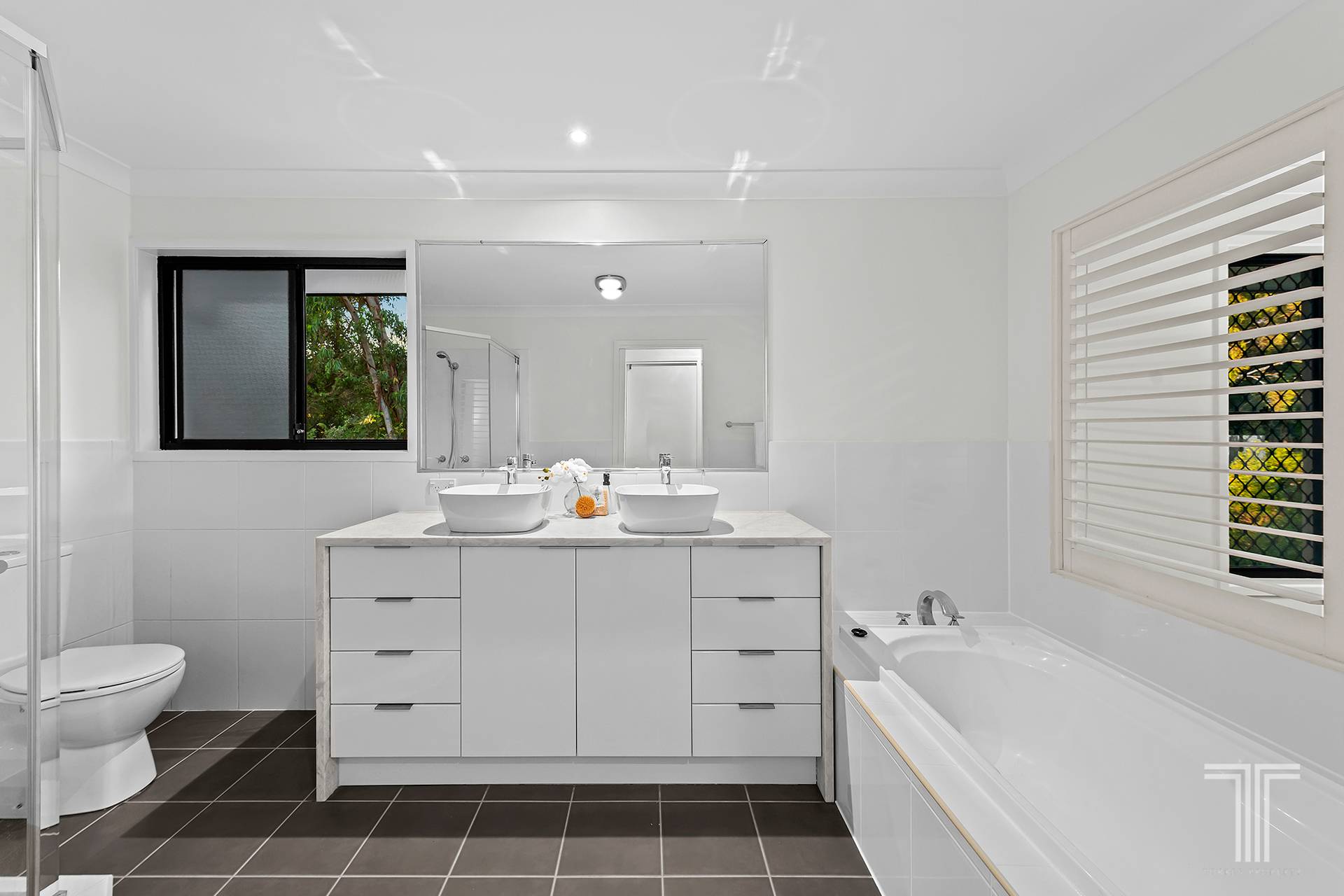 Surrounded by beautiful scenery and bushland in a quiet pocket of Wakerley, this six-bedroom house forms a large-scale family entertainer at the end of a cul-de-sac.