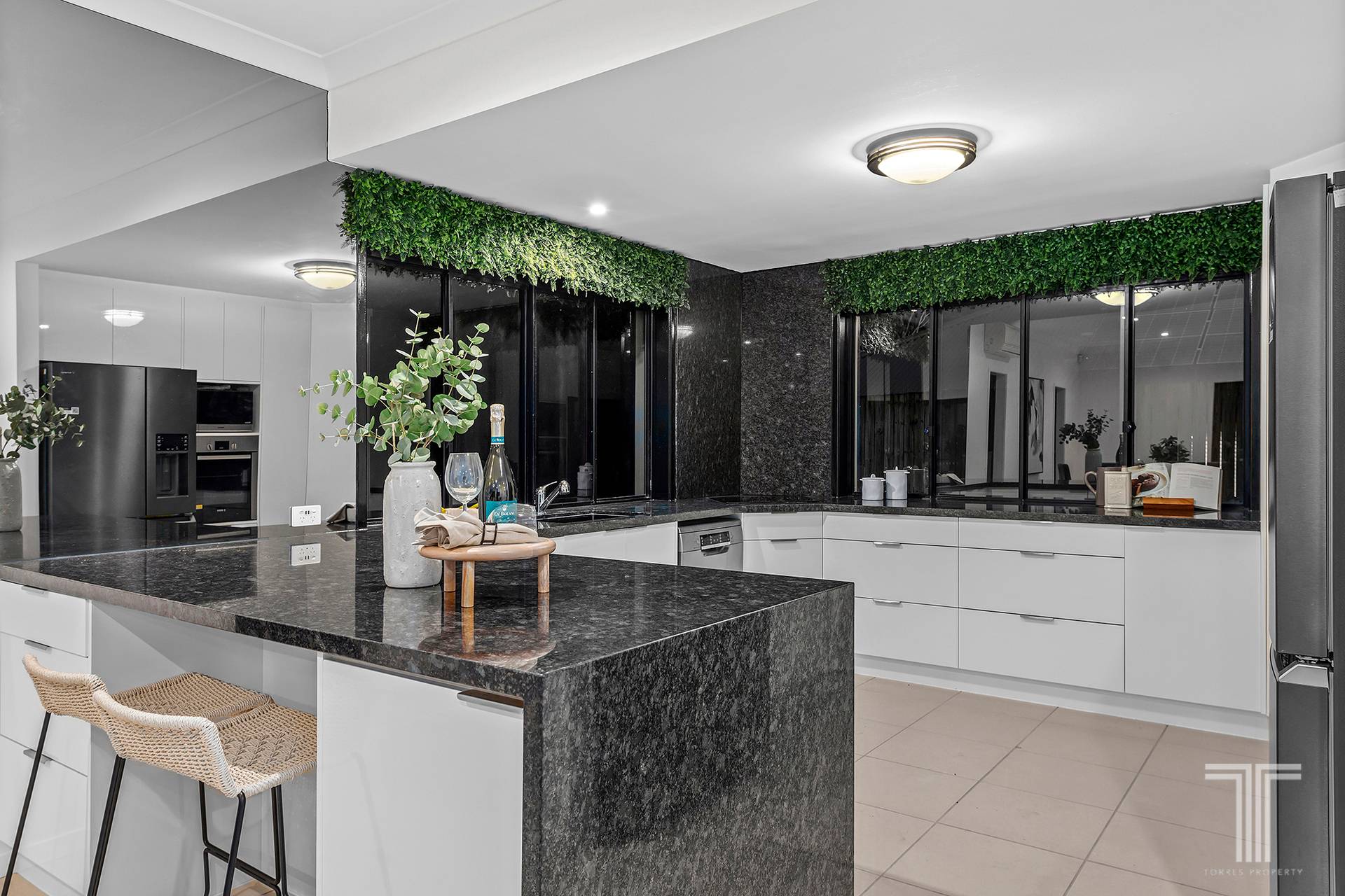 The outdoors are welcomed inside the stunning stonetop kitchen, with an artificial garden framing the waterfall benchtops, extensive cabinetry and premium appliances.