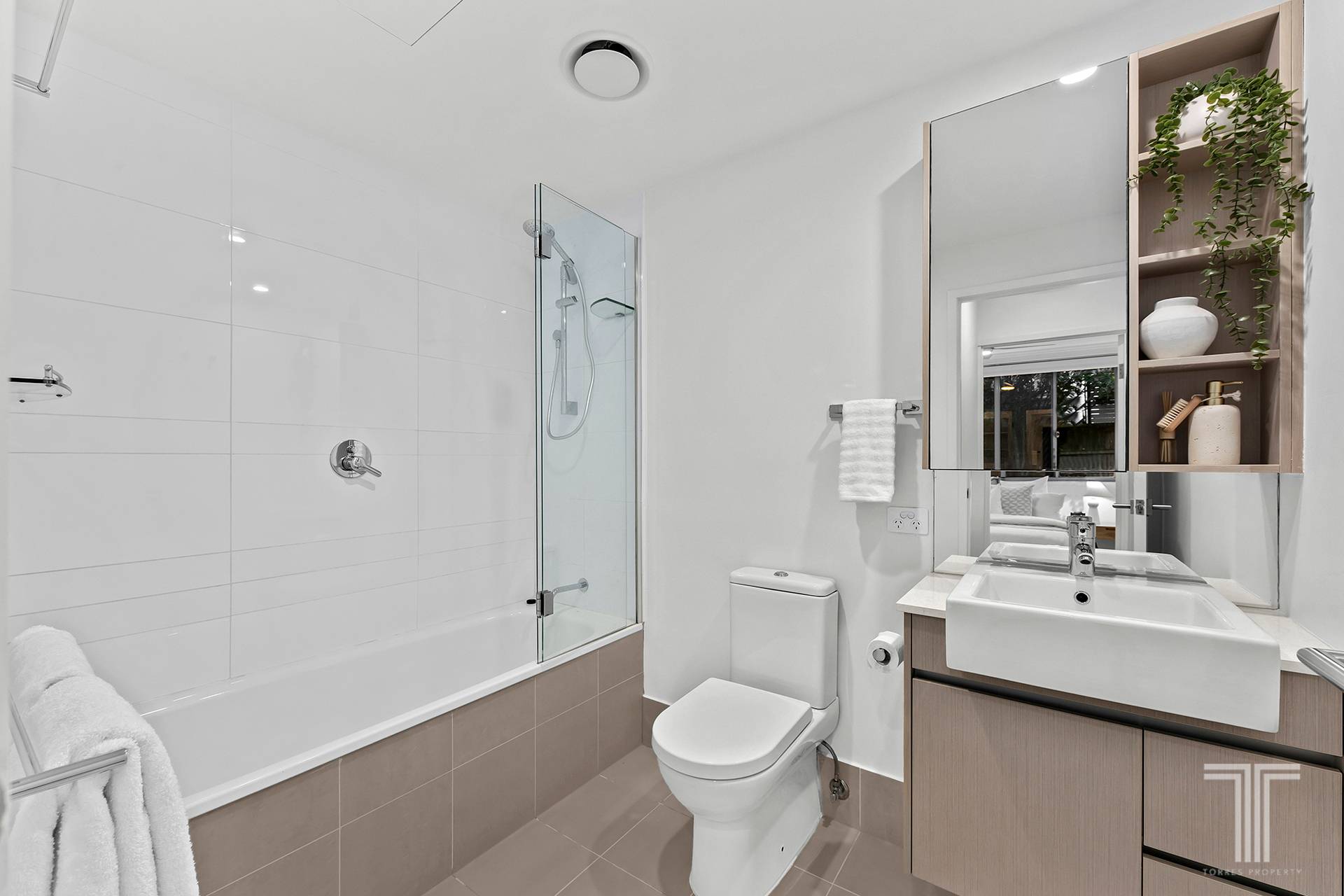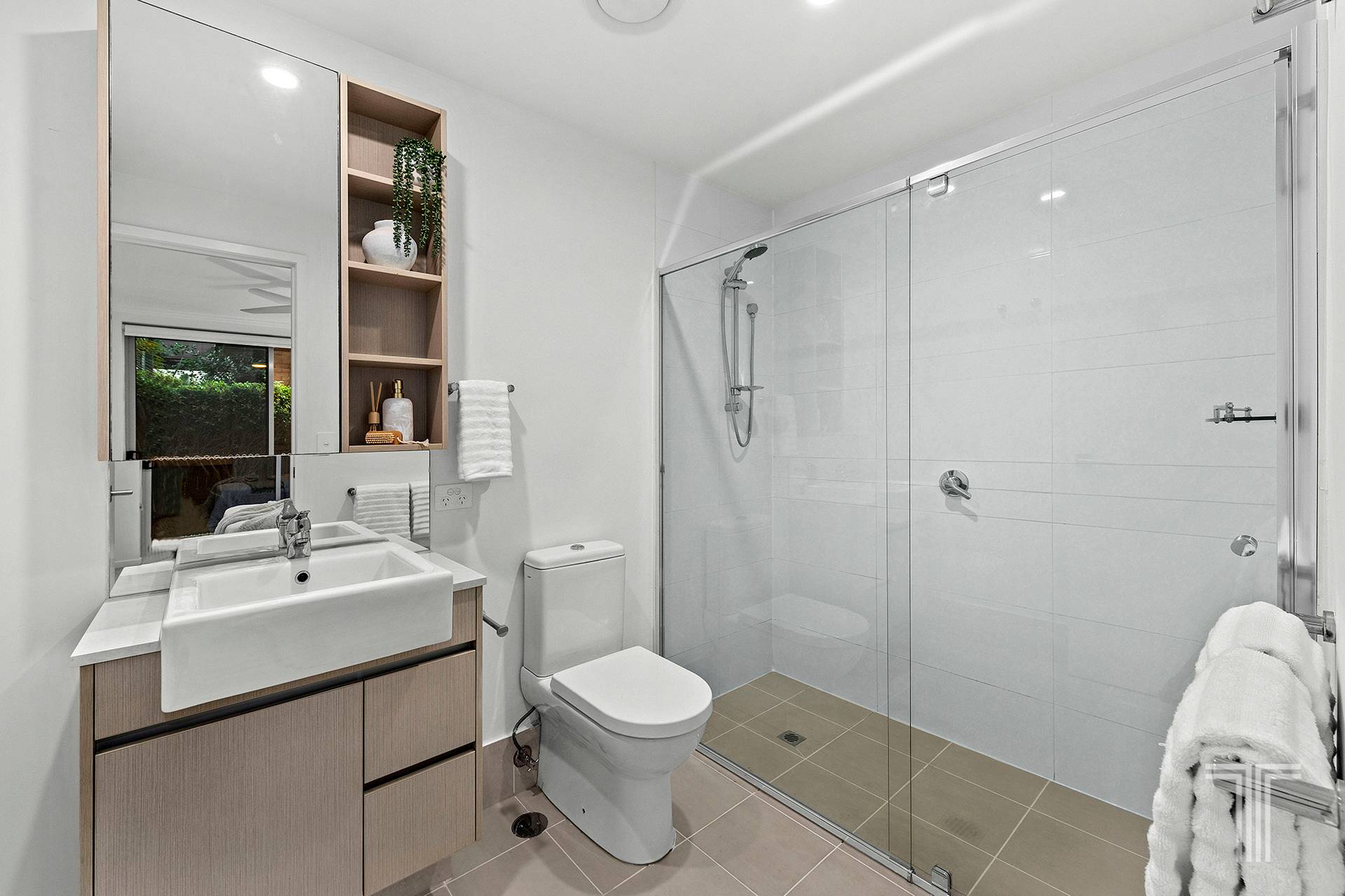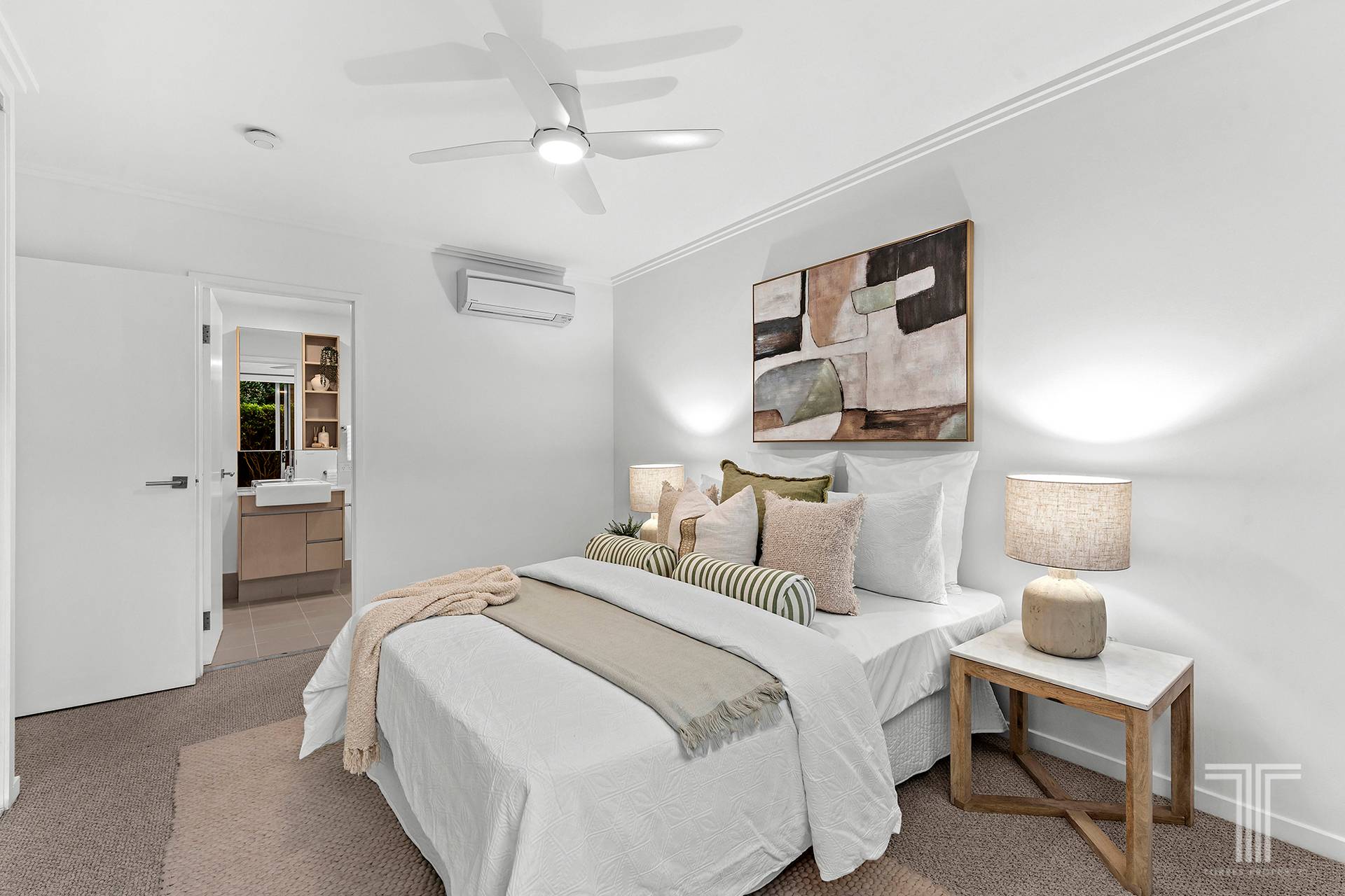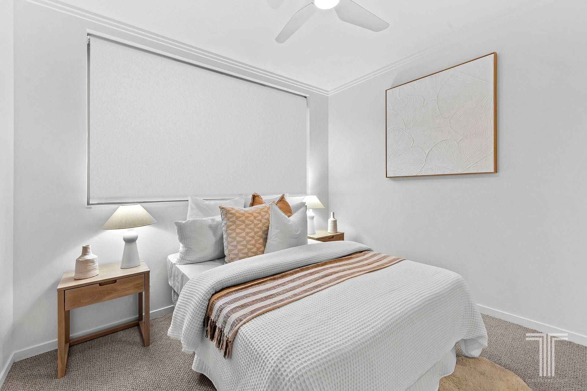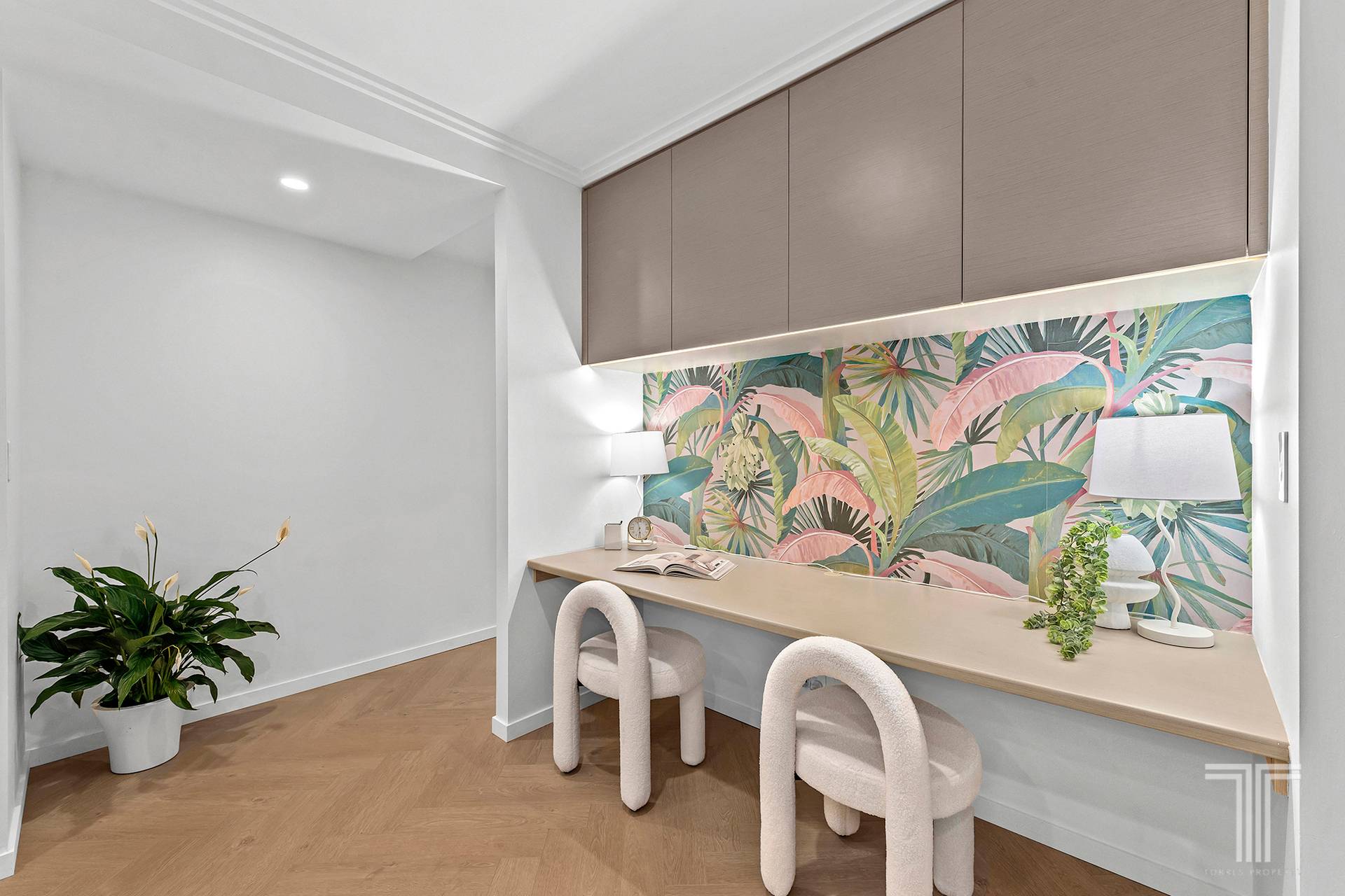 The designated office nook unveils a built-in desk and plentiful storage to cater to those working from home. Two spacious bedrooms, two modern bathrooms, and a concealed laundry with linen storage finalise the interiors.