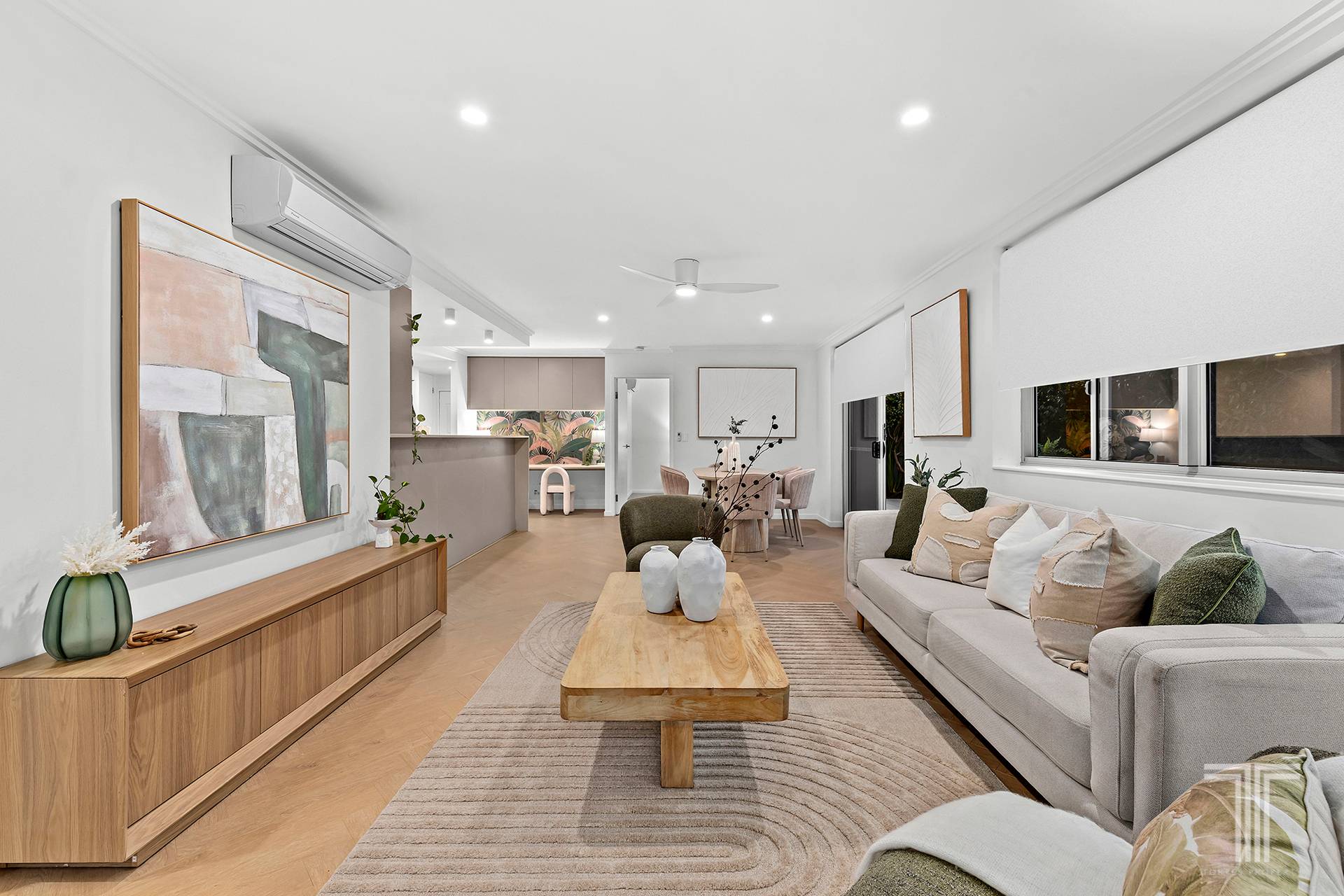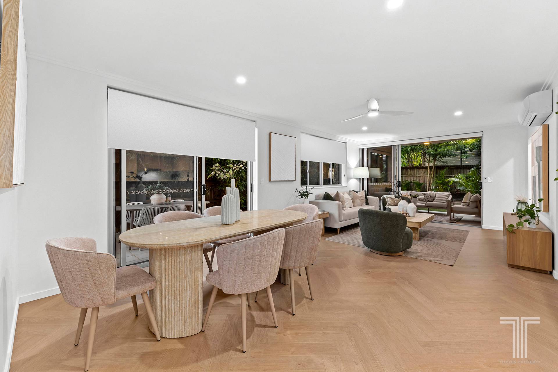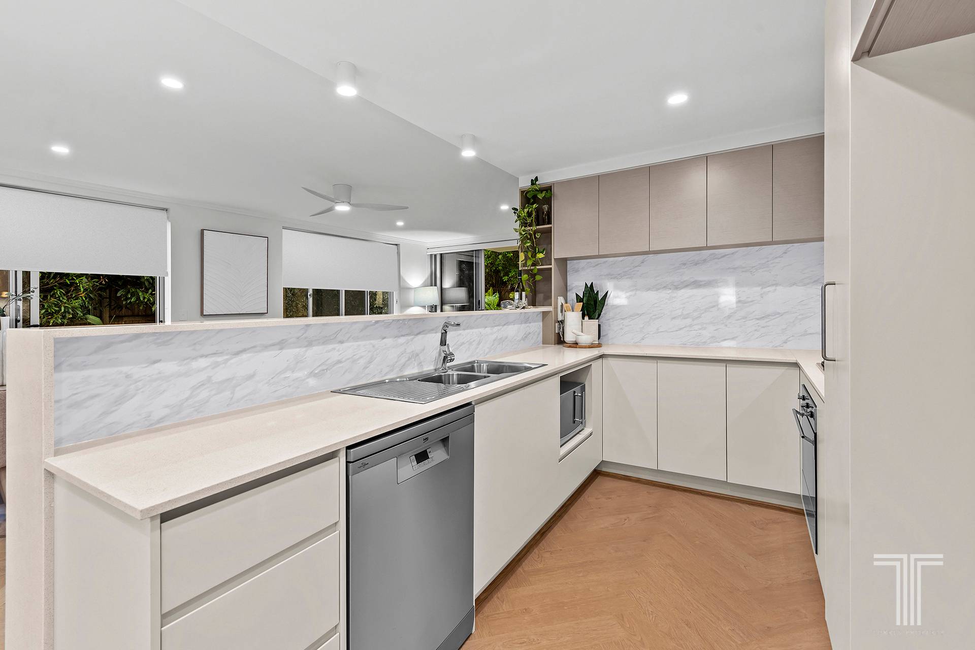 Abundant light flows over the spacious open layout, transitioning from the living and dining area to the marvellous Caesarstone kitchen featuring gas cooktop, space to fit a side-by-side fridge and showcasing a microwave and dishwasher.