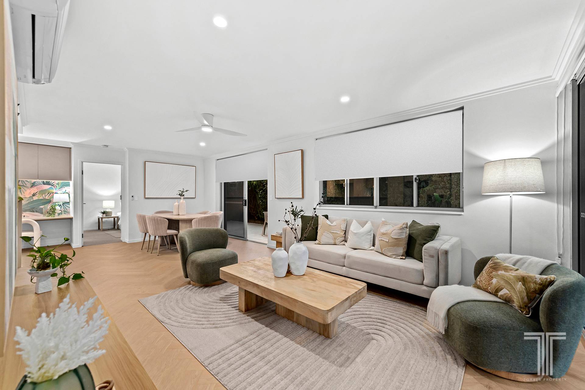 Reinvigorated with quality fittings and stylish interiors, brand-new herringbone timber-look flooring and cushioned wool-blend carpet adorning the floors, blending with a freshly painted pallet, and security screens and new window dressings. Comfort plus, with air-conditioning, fans, and soothing breezes via the window configuration. The property awaits a new owner since the renovations were just completed to perfection.