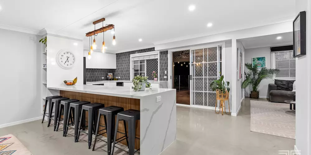 Neighbouring parks and within the Mansfield State High catchment, the house exudes exquisite appeal with a grand façade opening to renovated interiors inviting modern living.