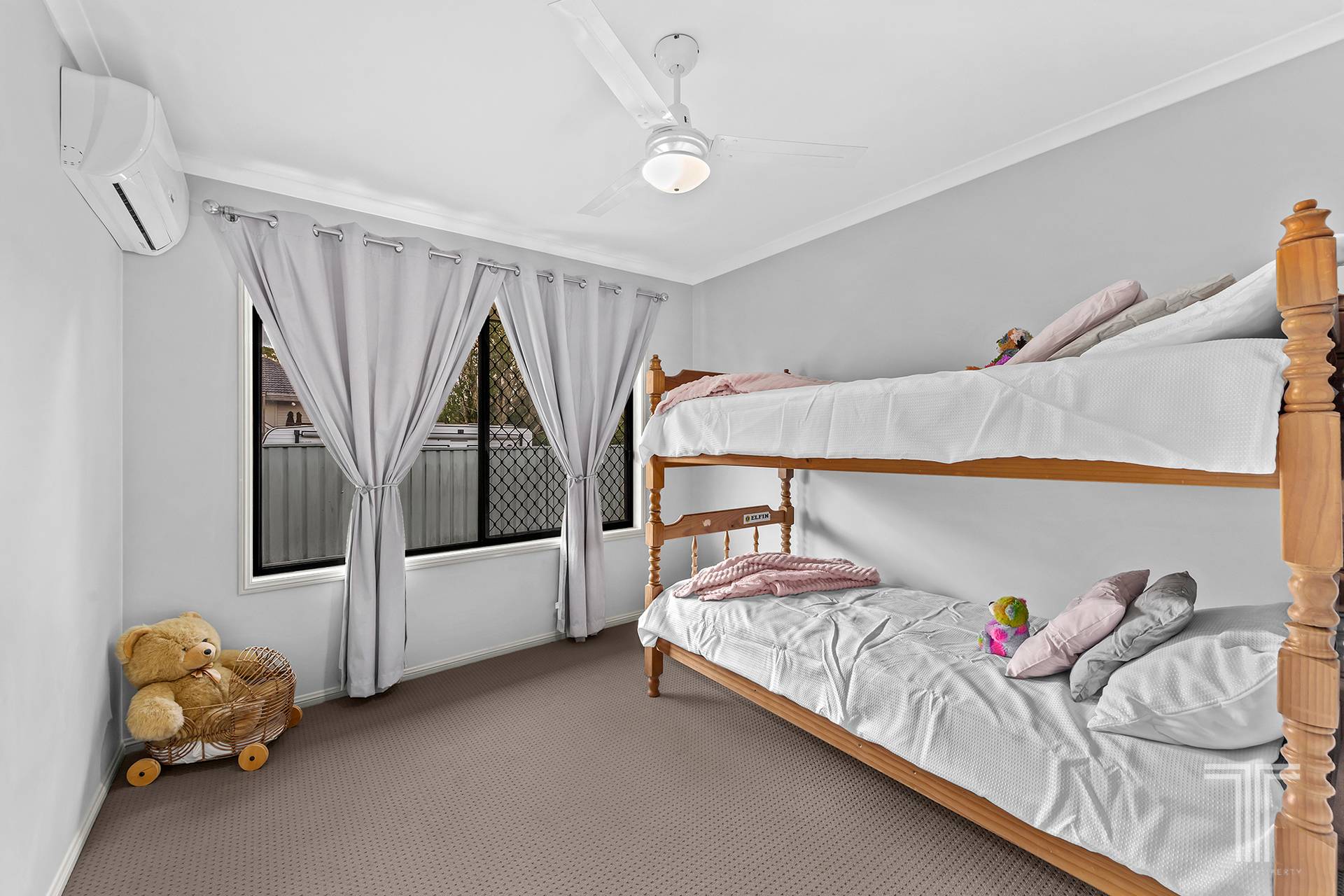 The four bedrooms include a master suite in a private wing with a walk-in robe and ensuite. The children's bedrooms all include built-in robes and access to the main bathroom with a bathtub, a separate toilet with a soft-closing seat, and an adjacent laundry.