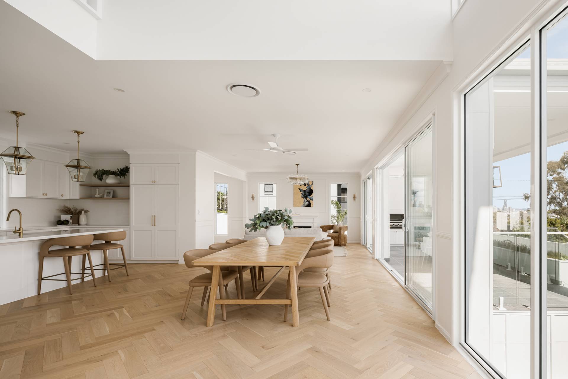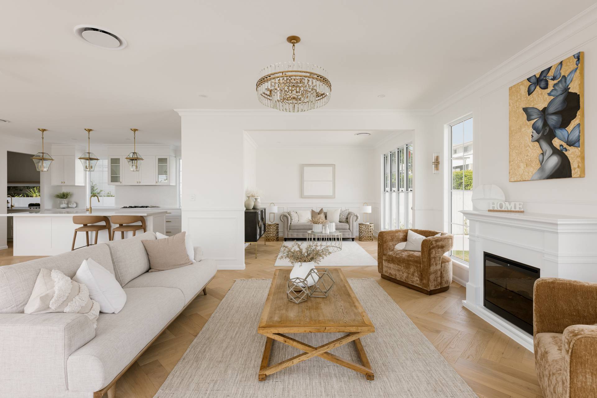 Inside, natural light fills the beautifully designed interiors, featuring a crisp white palette, elegant herringbone oak floors, decorative wainscoting, and a cozy fireplace, creating a warm and inviting atmosphere.. The entertainer's chef's kitchen showcases a Caesarstone island, butler's pantry, premium appliances, and an integrated fridge/dishwasher.