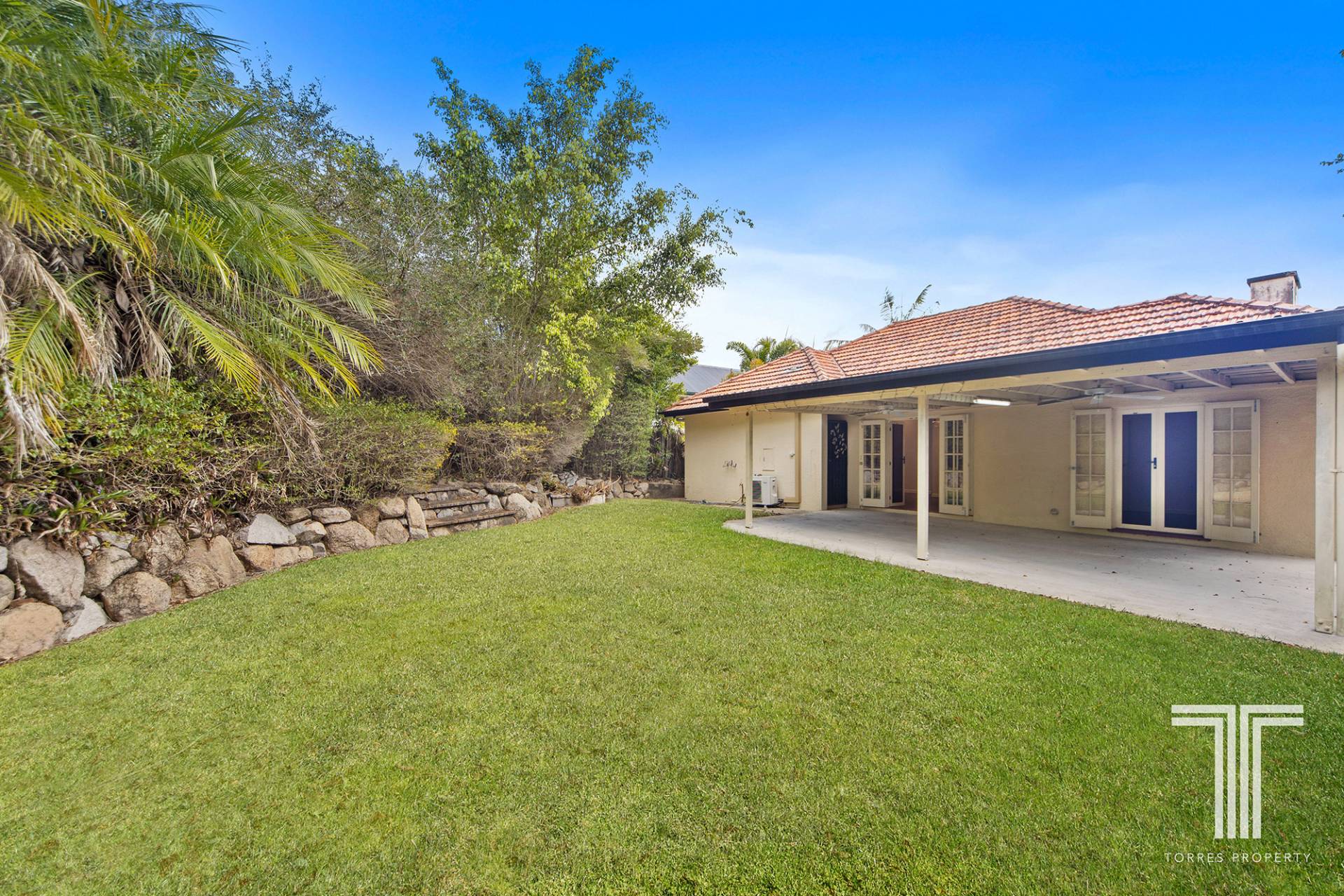 - Third bedroom with large built-in robe and double doors leading to outdoor patio area