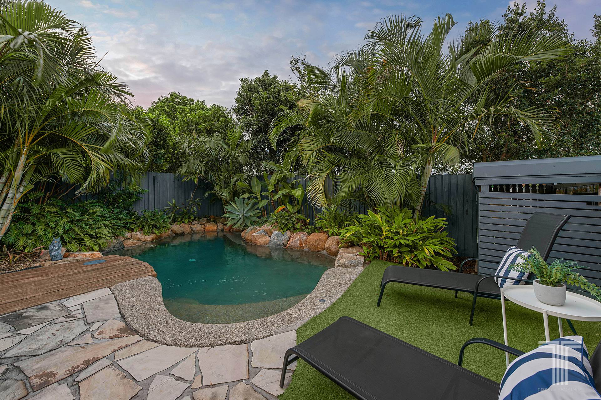 A lounge room and patio downstairs extend the living and hosting spaces, and scenic gardens guide you to the backyard and swimming pool, where you can lounge by the water or engage in splashing, swimming and games with the kids.