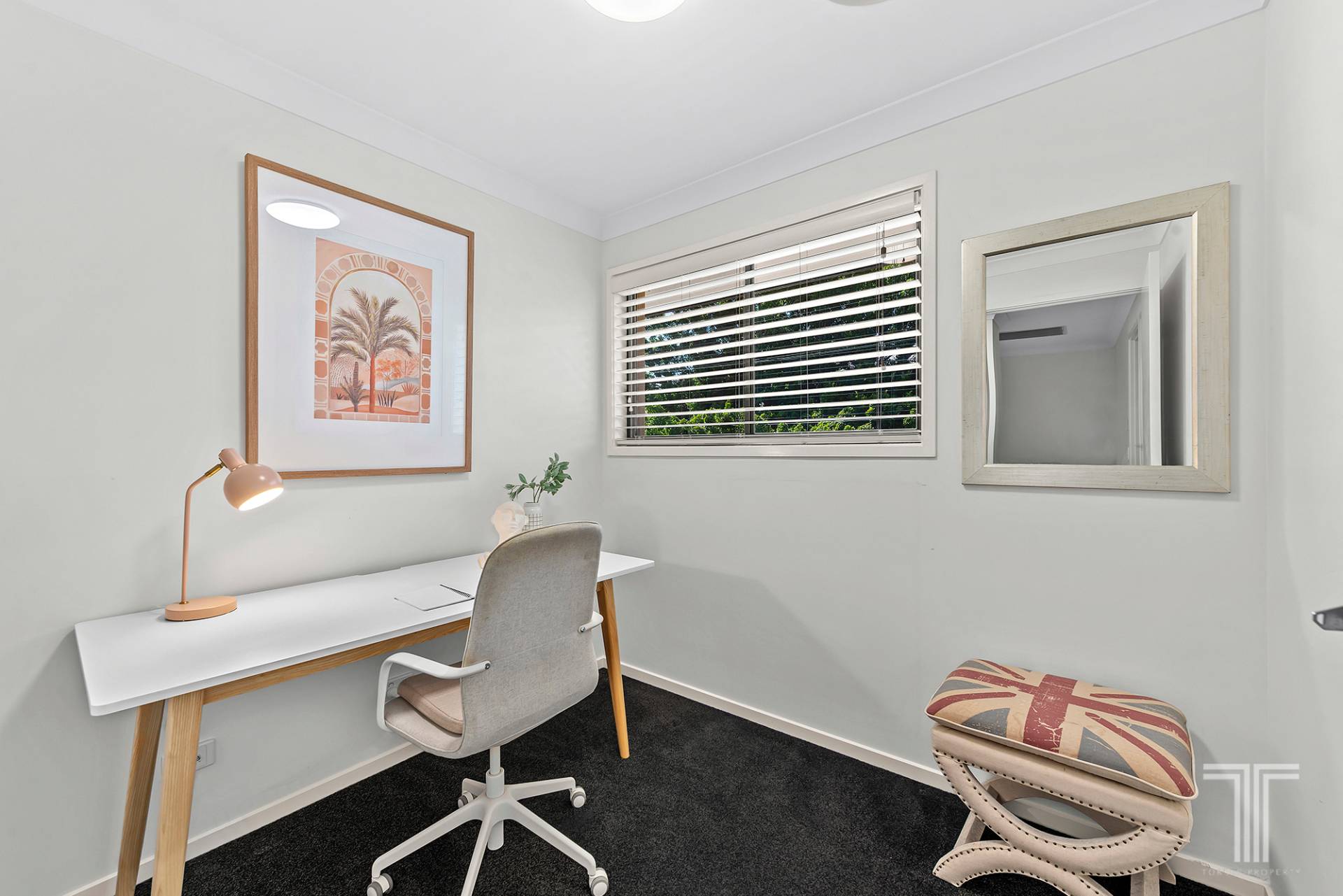 The interiors extend seamlessly to the covered alfresco patio, perfect for outdoor dining or enjoying a quiet moment while the kids play on the flat grassy backyard. With four bedrooms and three bathrooms thoughtfully positioned across two levels, there’s plenty of room for everyone. Downstairs features a full bathroom and a guest bedroom, while upstairs you’ll find three more bedrooms, including the master with its own private ensuite, as well as a dedicated study nook, ideal for working or studying from home.